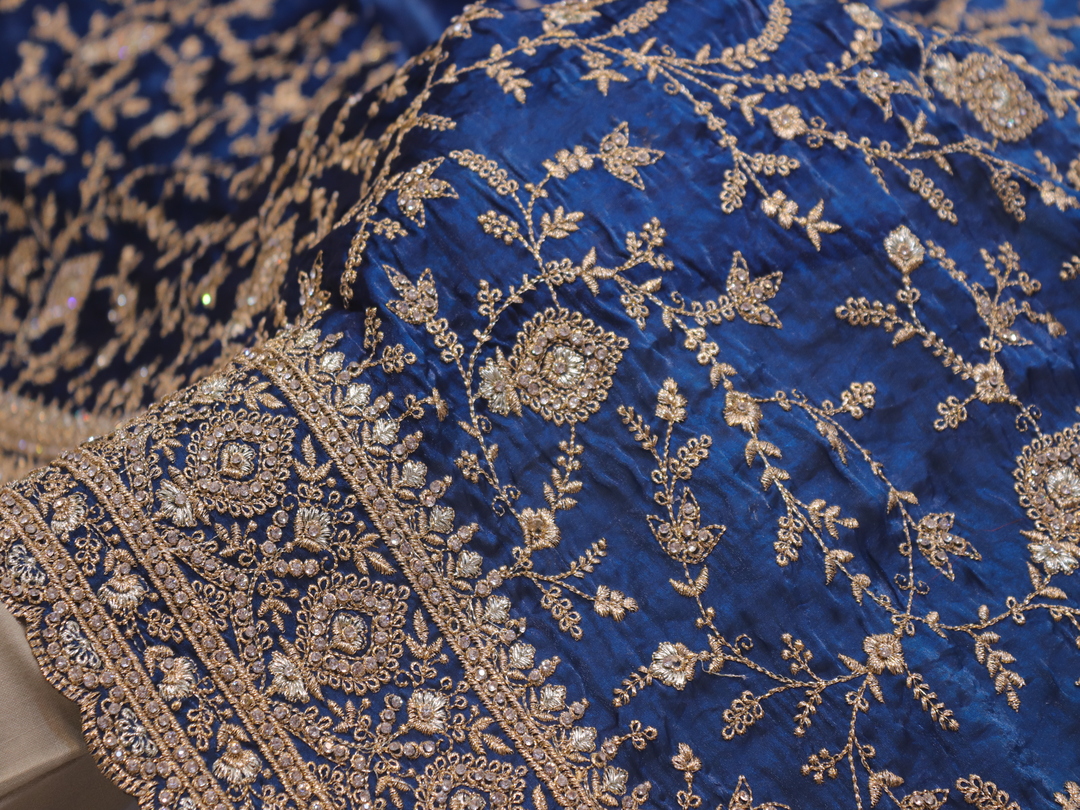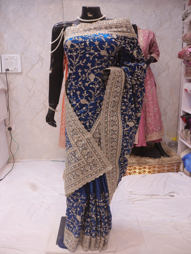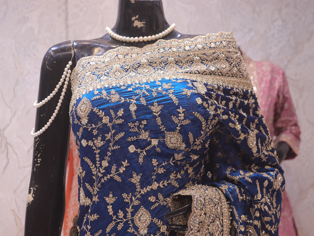 Saree Details: Saree Length: 5.5 Meters Work Type: Full Work (Jaal) Fabric: Fendi Color: Aquamarine Blue Embellished with: Zari, Crystals Border Color: Aquamarine Blue Border Fabric: Fendi Border Work: Zari, Crystals Blouse Details: Unstitched Blouse Fabric 0.8 Meters Fabric: Fendi Color: Aquamarine Blue Embellished with: Zari, Crystals