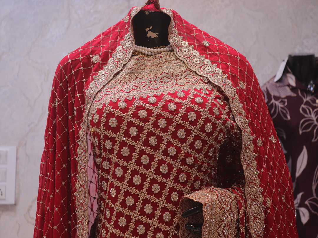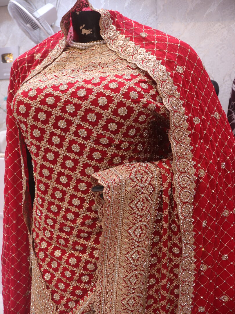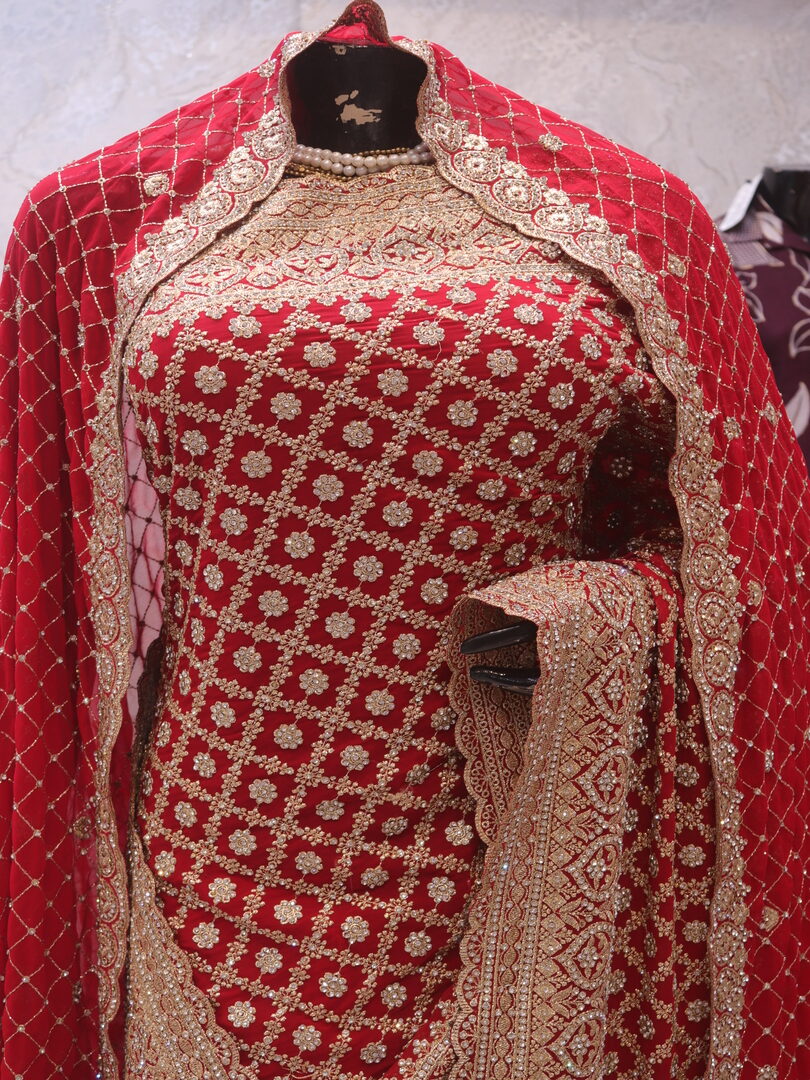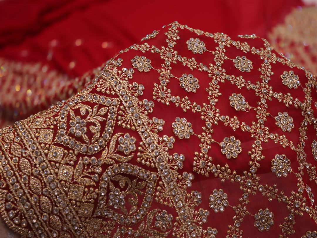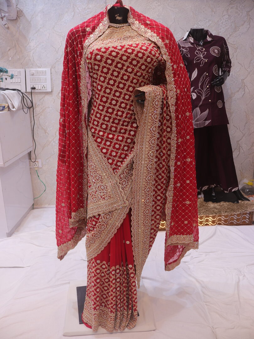 Saree Details: Saree Length: 5.5 Meters Work Type: Full Work (Jaal) Fabric: Georgette Color: Bridal Red Embellished with: Zari, Crystals Border Color: Bridal Red Border Fabric: Georgette Border Work: Zari, Crystals Blouse Details: Unstitched Blouse Fabric 0.8 Meters Fabric: Georgette Color: Bridal Red Embellished with: Zari, Crystals Veil Details: Fabric: Georgette Color: Bridal Red Embellished with: Zari, Crystals