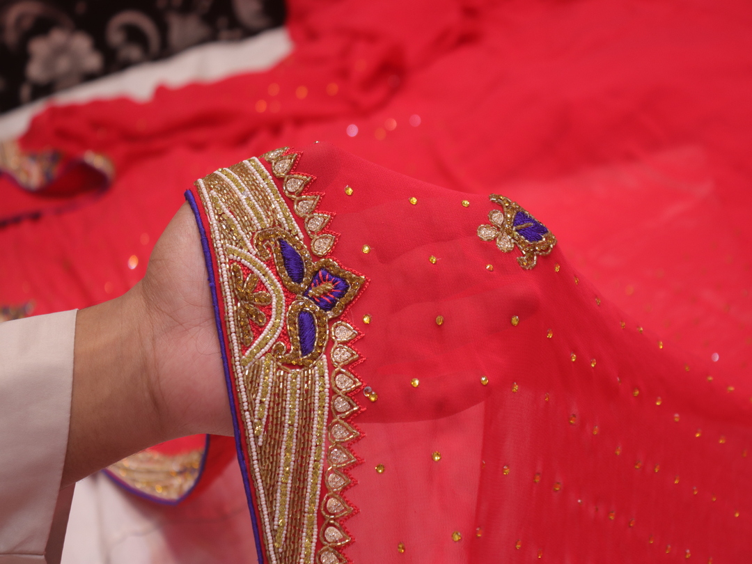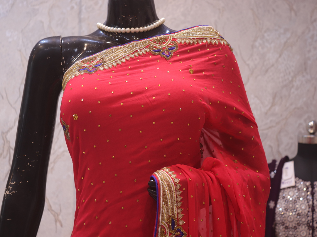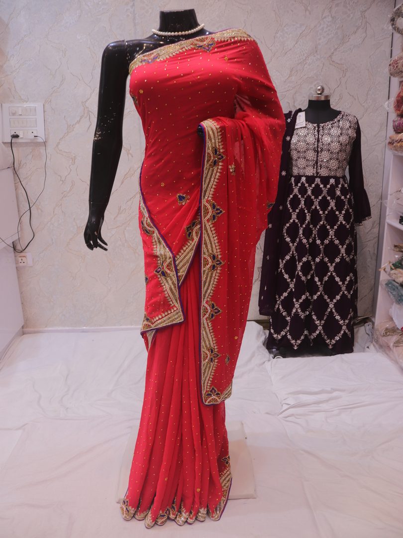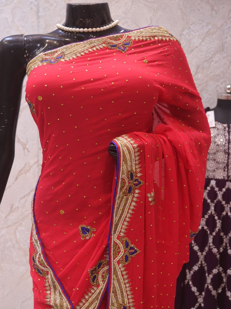 Saree Details: Saree Length: 5.5 Meters Work Type: Full Work (Border) Fabric: Chiffon Color: Candy Apple Embellished with: Cut Glass, Acrylic Stones, Pearls Border Color: Candy Apple Border Fabric: chiffon Border Work: Cut Glass, Acrylic Stones, Pearls Blouse Details: Unstitched Blouse Fabric 0.8 Meters Fabric: Chiffon Color: Candy Apple Embellished with: Cut Glass, Acrylic Stones, Pearls