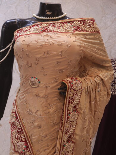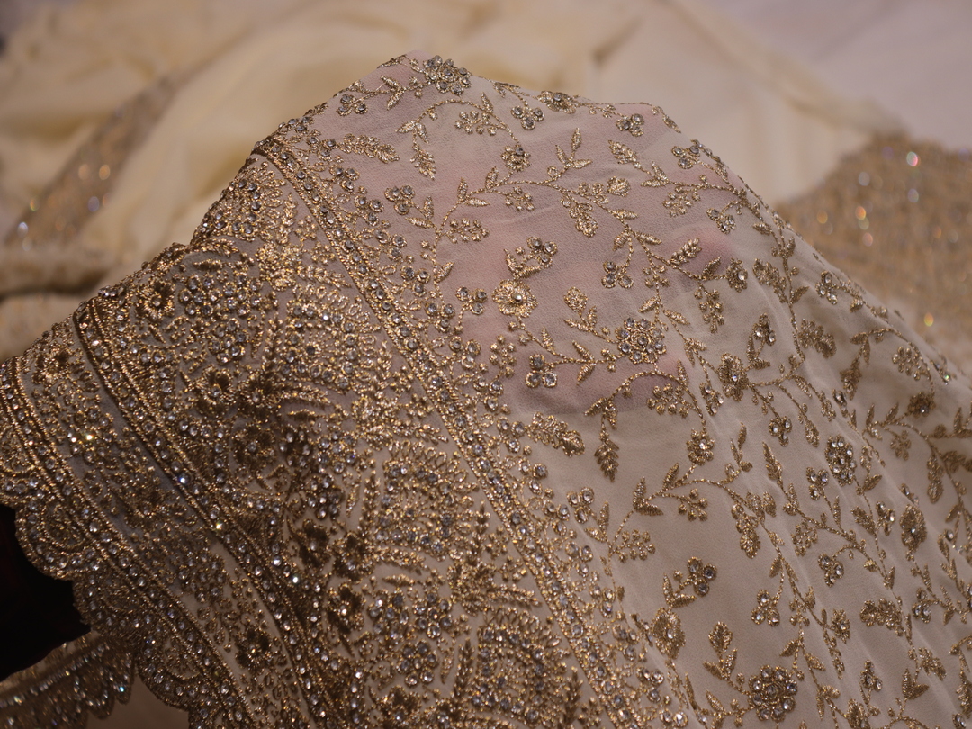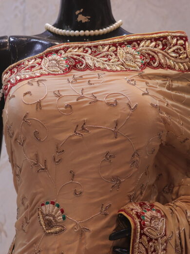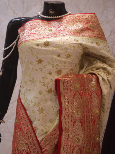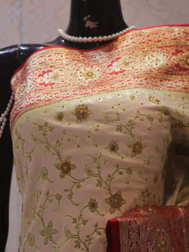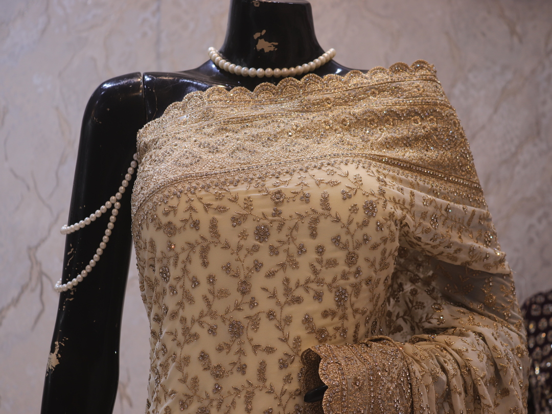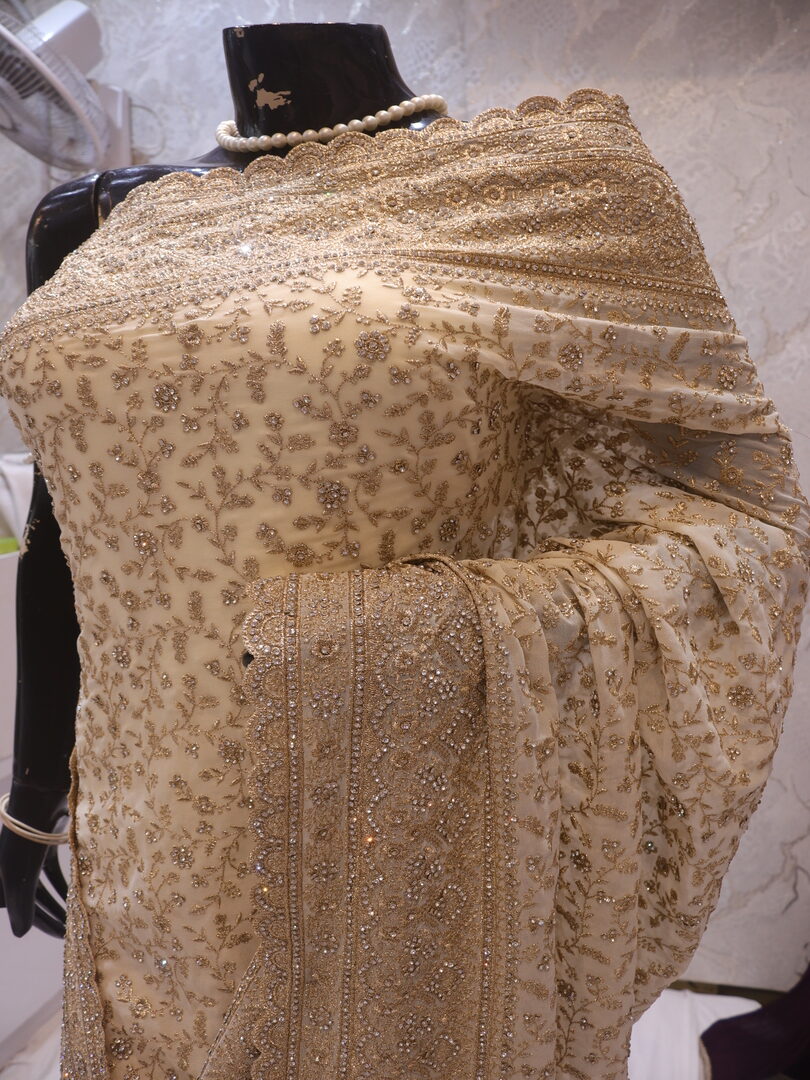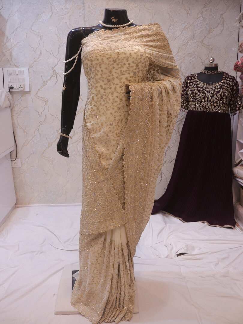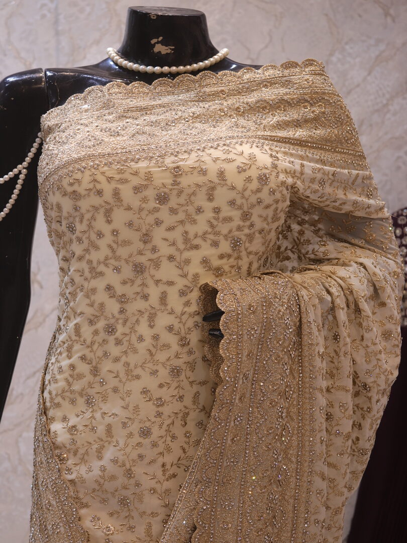Saree Details: Saree Length: 5.5 Meters Work Type: Full Work (Jaal) Fabric: Georgette Color: Ceramic White Embellished with: Crystals, Zari Border Color: Ceramic White Border Fabric: Georgette Border Work: Crystals, Zari Blouse Details: Unstitched Blouse Fabric 0.8 Meters Fabric: Georgette Color: Ceramic White Embellished with: Crystals, Zari
