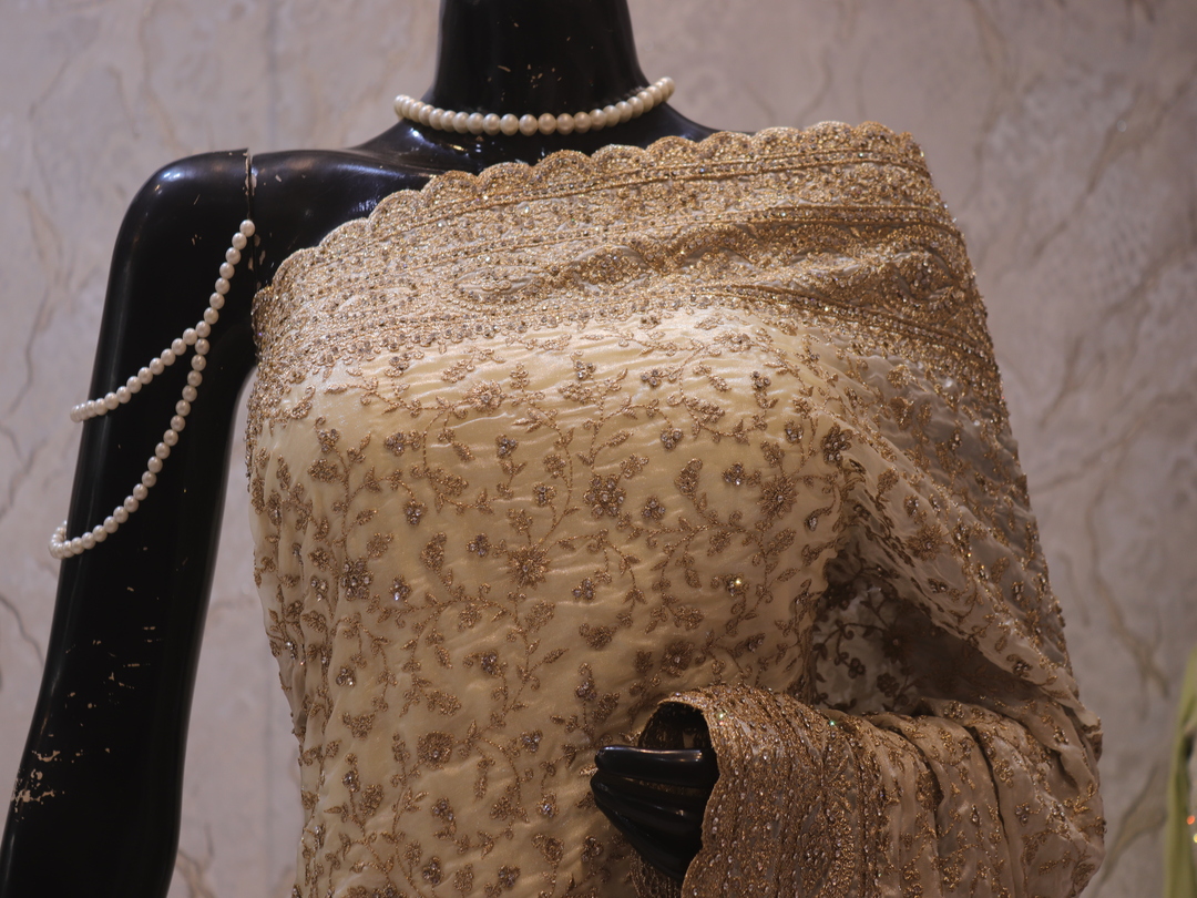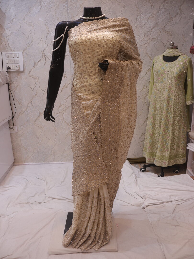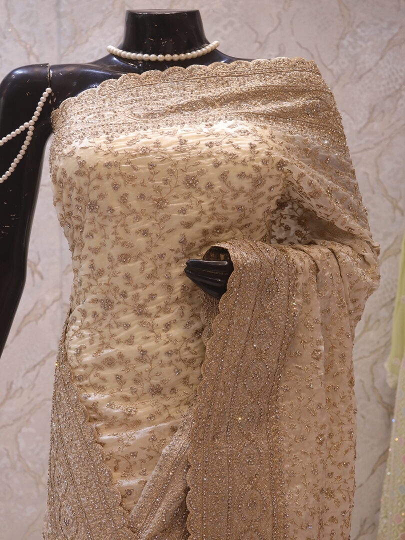 Saree Details: Saree Length: 5.5 Meters Work Type: Full Work (Jaal) Fabric: Fendi Color: Ceramic White Embellished with: Zari, Crystals Border Color: Ceramic White Border Fabric: Fendi Border Work: Zari, Crystals Blouse Details: Unstitched Blouse Fabric 0.8 Meters Fabric: Fendi Color: Ceramic White Embellished with: Zari, Crystals