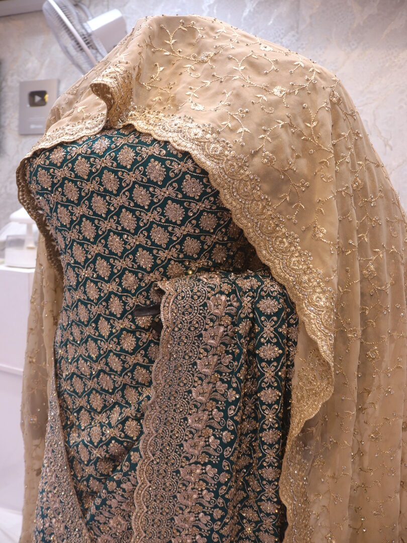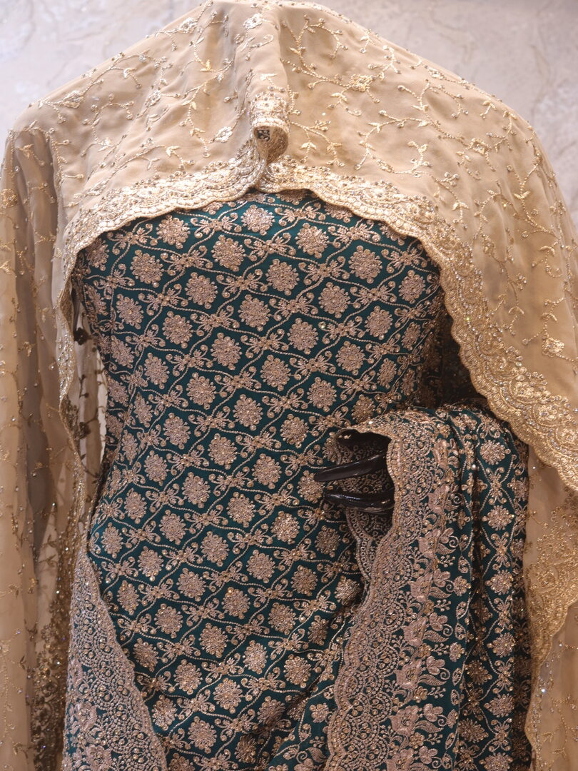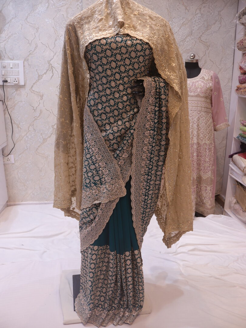 Saree Details: Saree Length: 5.5 Meters Work Type: Full Work (Jaal) Fabric: Georgette Color: Cerulean Blue Embellished with: Zari, Crystals Border Color: Cerulean Blue Border Fabric: Georgette Border Work: Zari, Crystals Blouse Details: Unstitched Blouse Fabric 0.8 Meters Fabric: Georgette Color: Cerulean Blue Embellished with: Zari, Crystals Veil Details: Fabric: Georgette Color: Golden Embellished with: Zari, Crystals