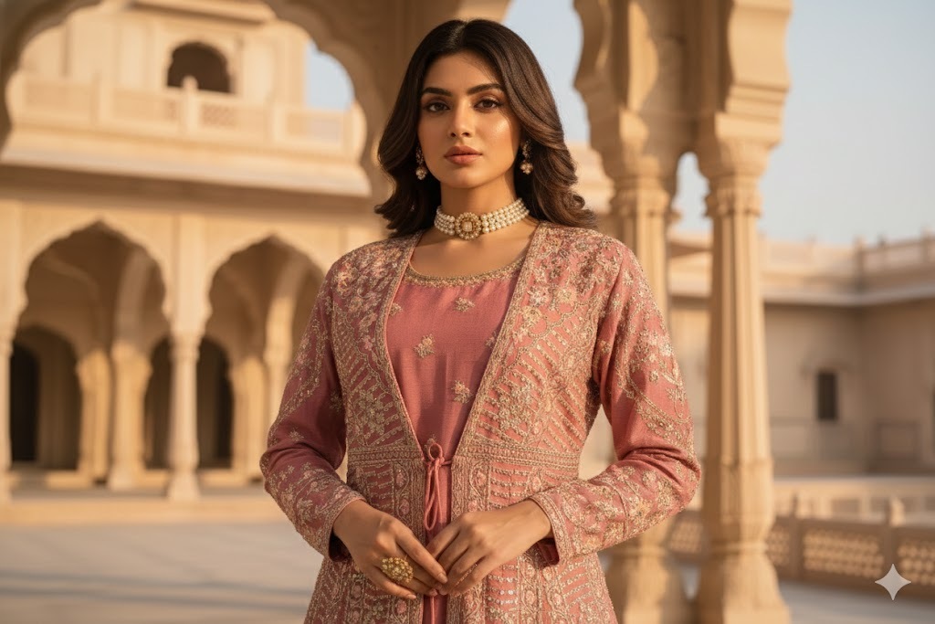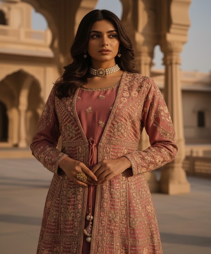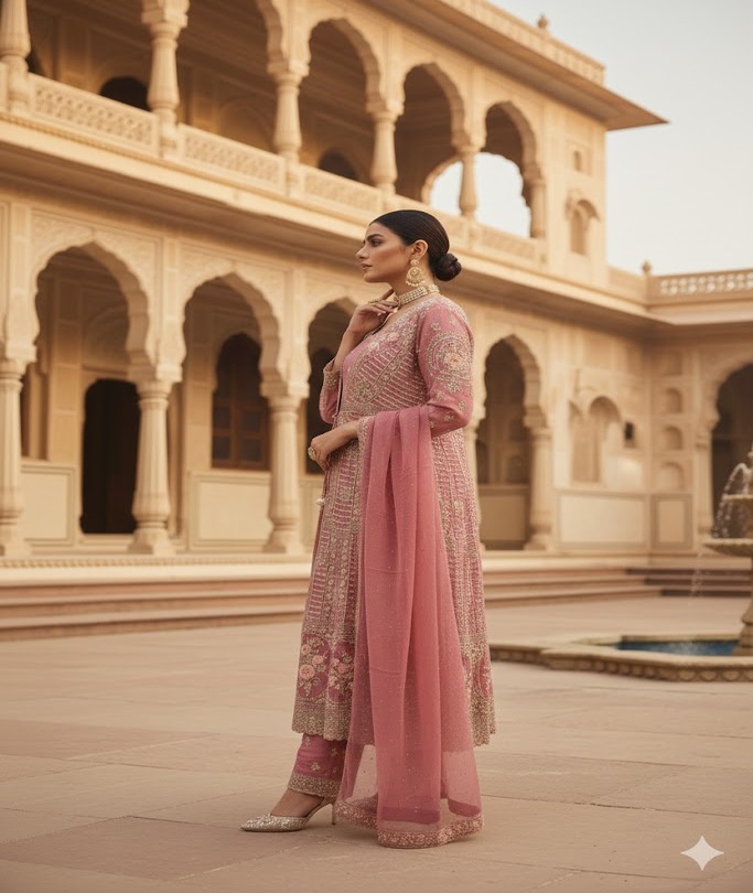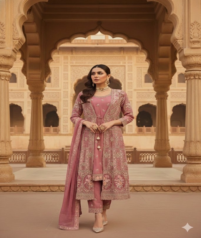 Top Details: Top Type Shirt Style top: Work Type: Full Work Fabric: Pure Chinon Color: Peachy Pink Embellished with: Resham, Zari, Crystals Shrug Details: Fabric: Pure Chinon Color: Peachy Pink Embellished with: Resham, Zari, Crystals Bottom Details: Bottom Type Pant : Ready To Wear Fabric: Pure Chinon Color: Peachy Pink Embellished with: Resham, Zari, Crystals Dupatta Details: Fabric: Pure Chiffon Color: Peachy Pink Embellished with: Resham, Zari, Stones