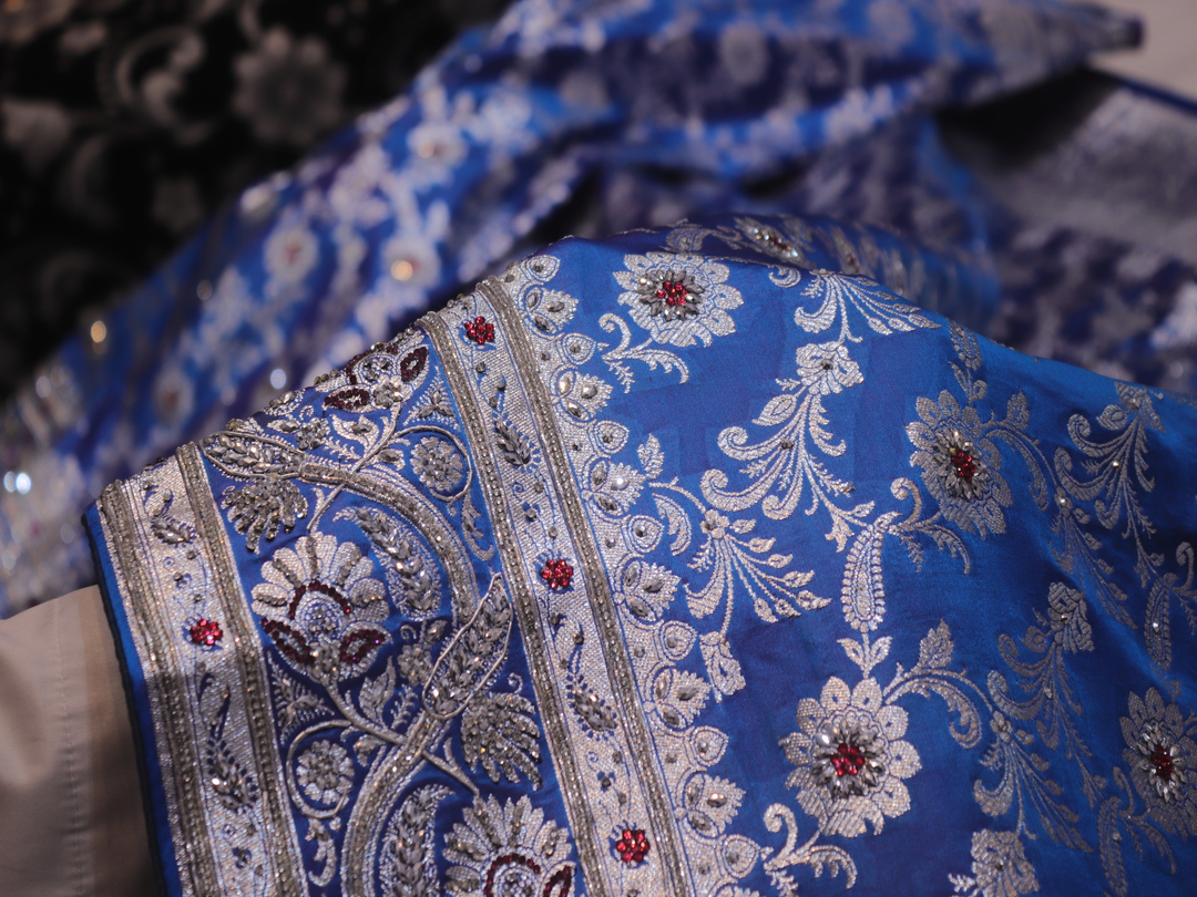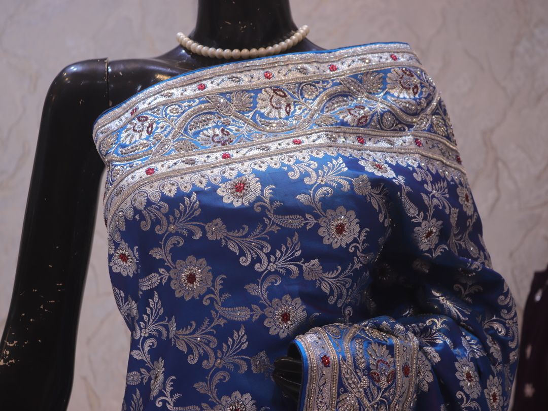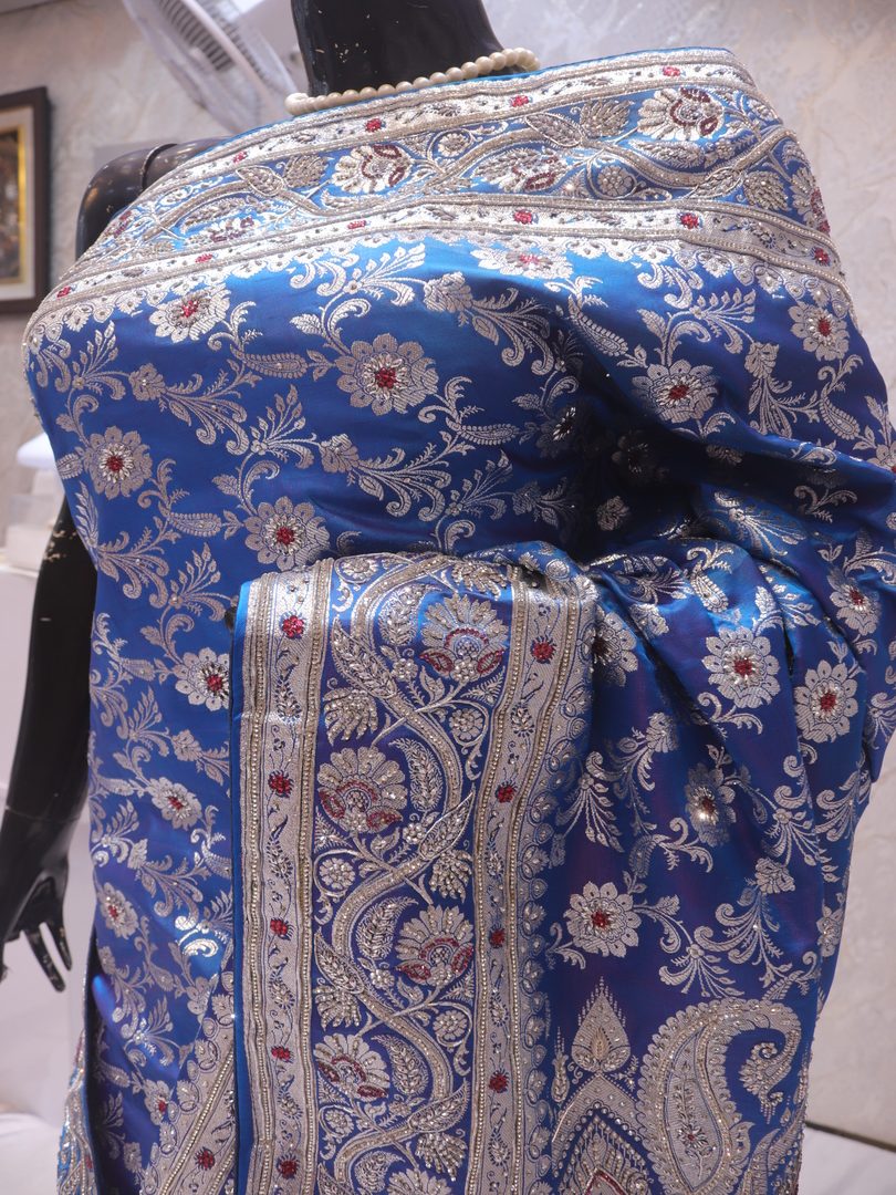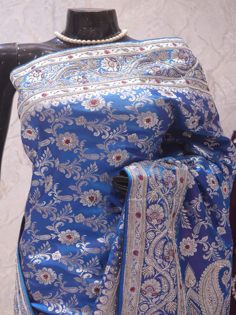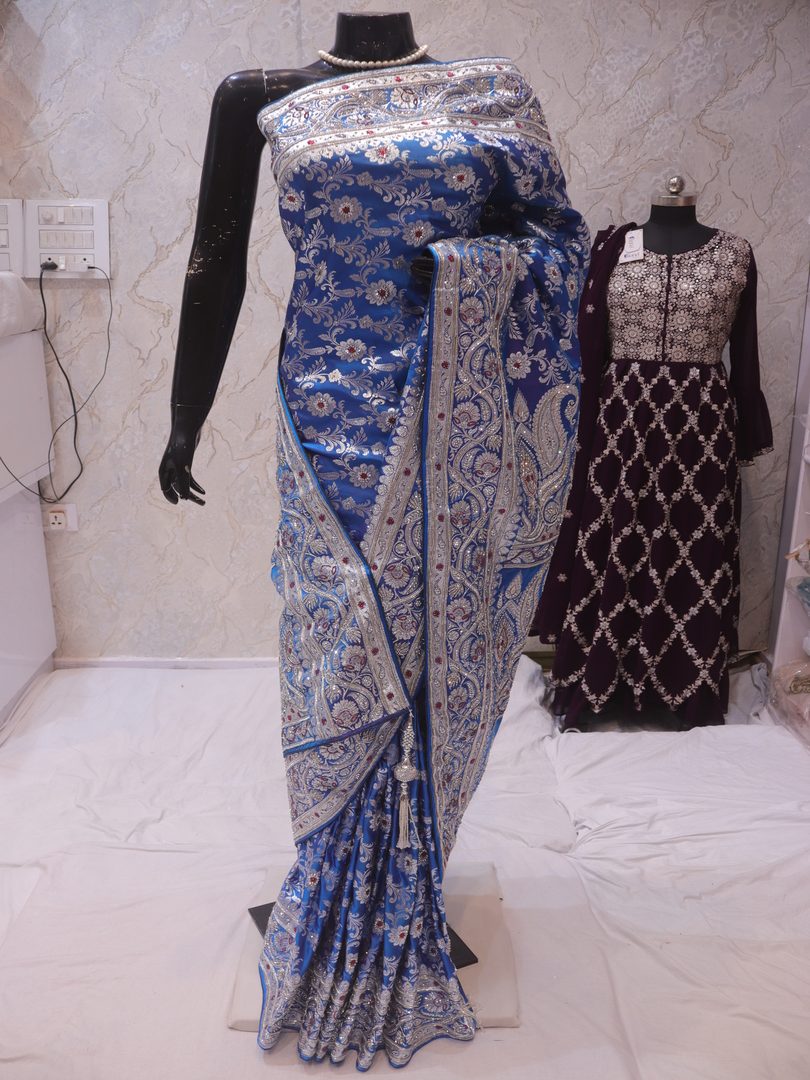 Saree Details: Saree Length: 5.5 Meters Work Type: Weaving (Jaal) Fabric: Banarasi Silk Silk Color: French Blue Embellished with: Silver Zari, Zardozi, Crystals, Acrylic Stones Border Color: French Blue Fabric: Banarasi Silk Border Work: Silver Zari, Zardozi, Crystals, Acrylic Stones Blouse Details: Unstitched Blouse Fabric 0.8 Meters Work Type: Weaving Fabric: Banarasi Silk Color: French Blue Embellished with: Silver Zari, Zardozi, Crystals, Acrylic Stones