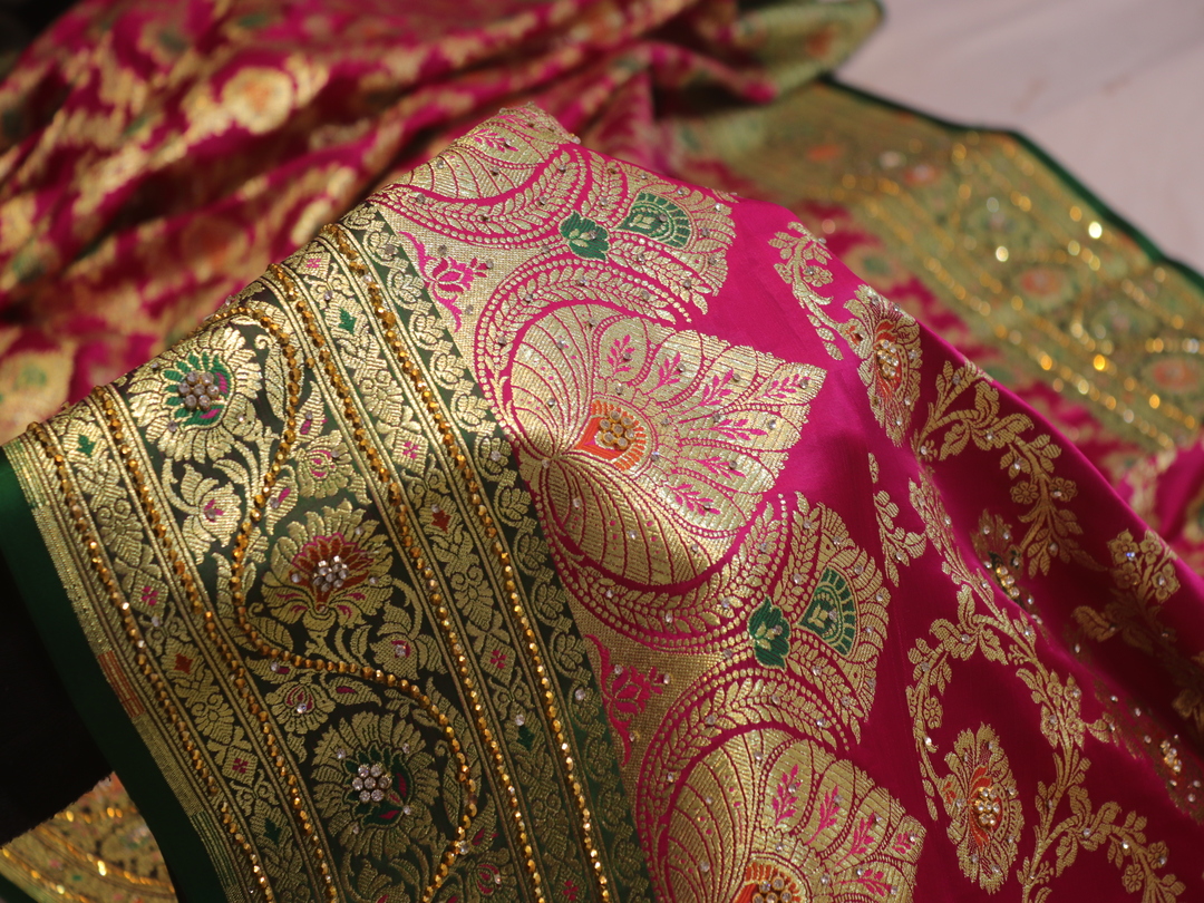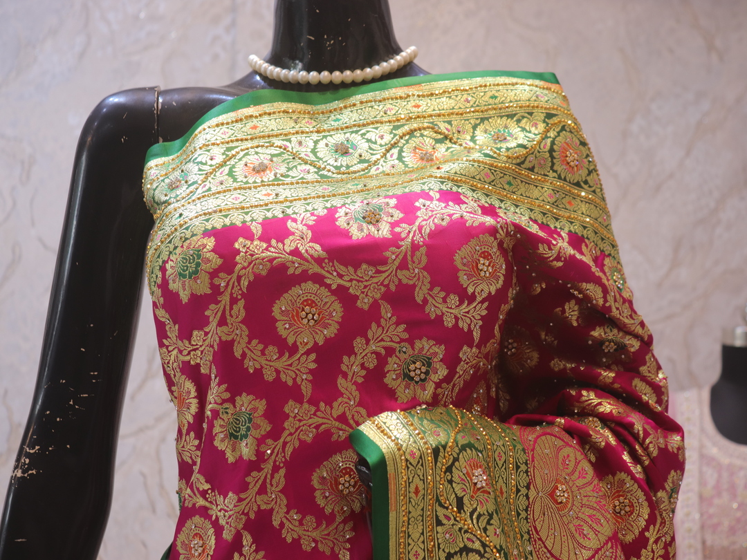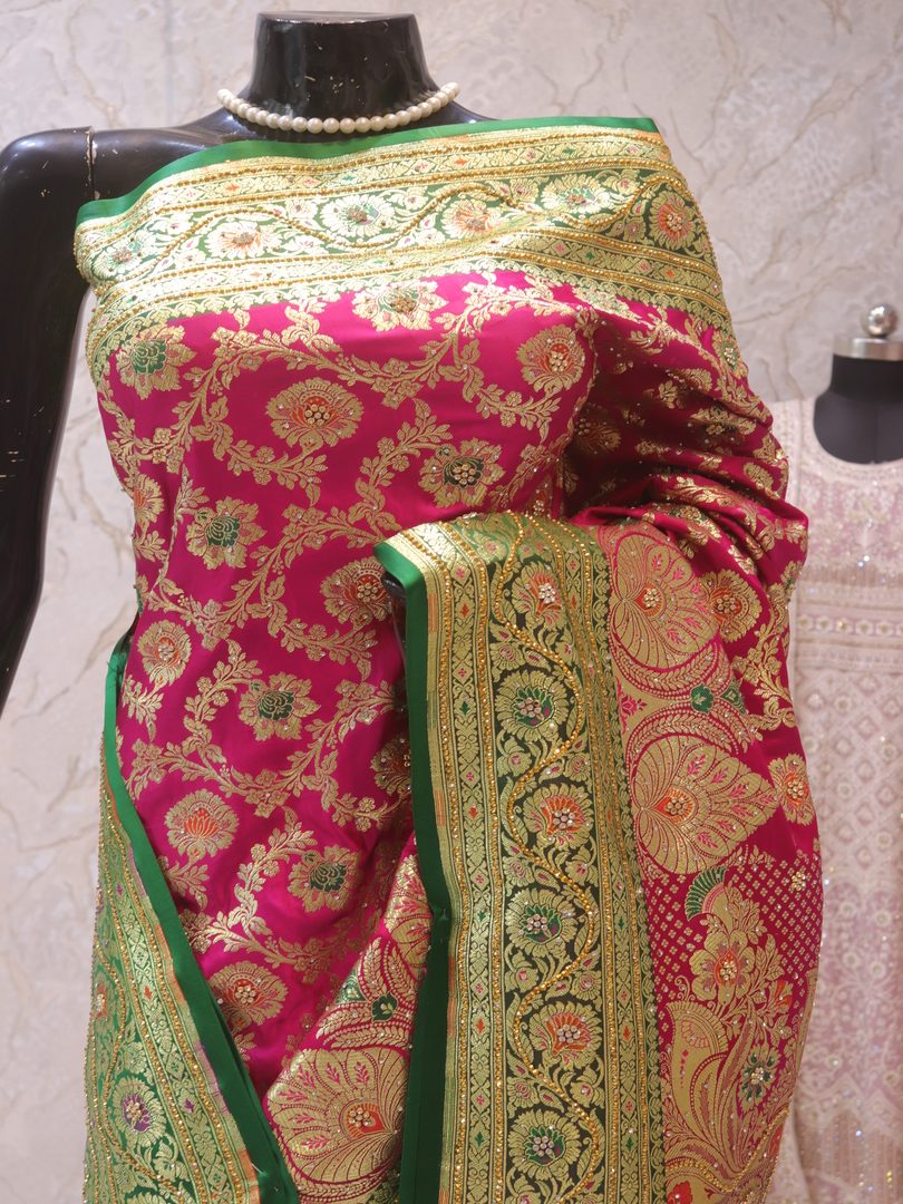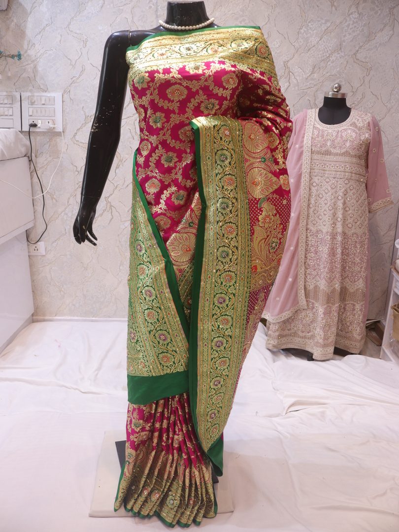 Saree Details: Saree Length: 5.5 Meters Work Type: Weaving (Jaal) Fabric: Banarasi Silk Saree Color: Fuchsia Pink Embellished with: Golden Zari, Mina Kari, Crystals, Acrylic Stones Border Color: Green Fabric: Banarasi Silk Border Work: Golden Zari, Mina Kari, Crystals, Acrylic Stones Blouse Details: Unstitched Blouse Fabric 0.8 Meters Work Type: Weaving Fabric: Banarasi Silk Color: Green Embellished with: Golden Zari, Mina Kari, Crystals, Acrylic Stones