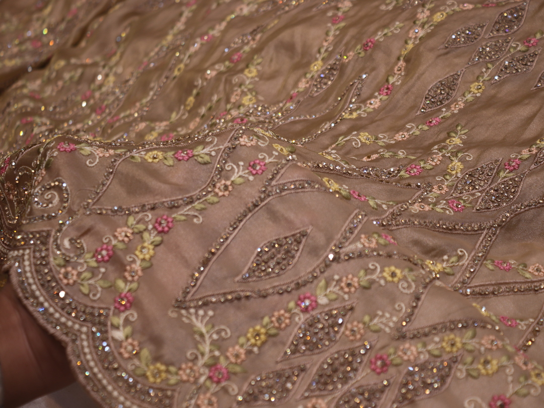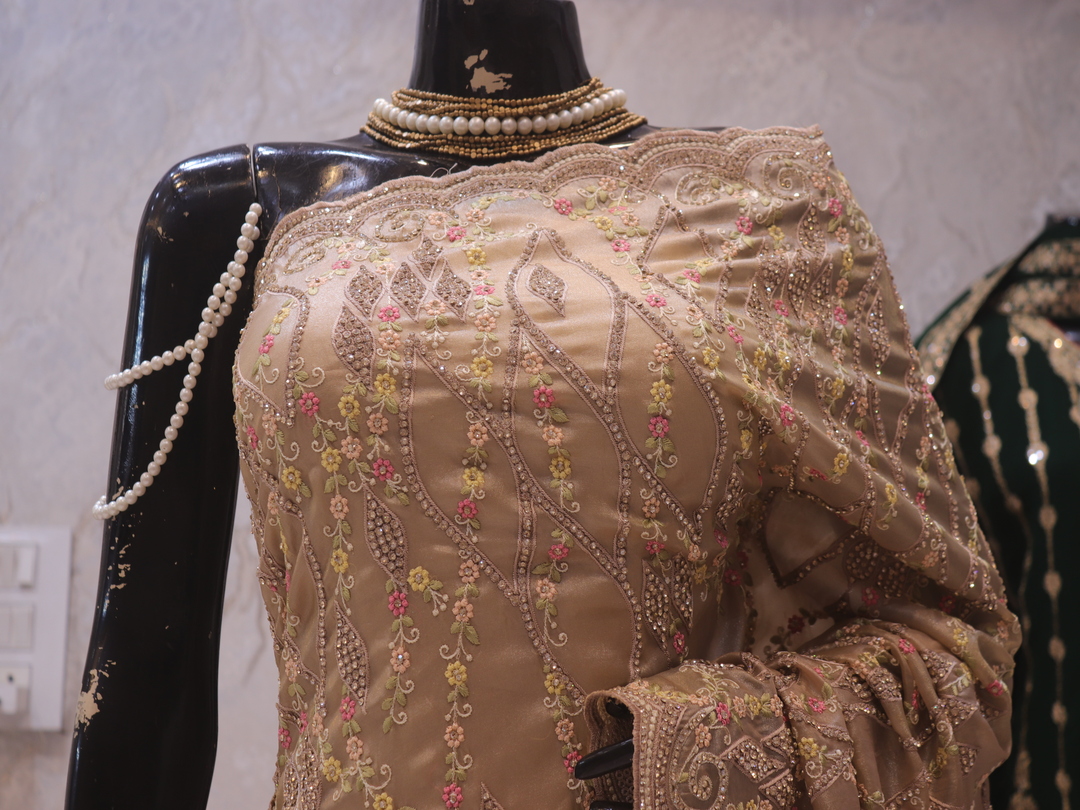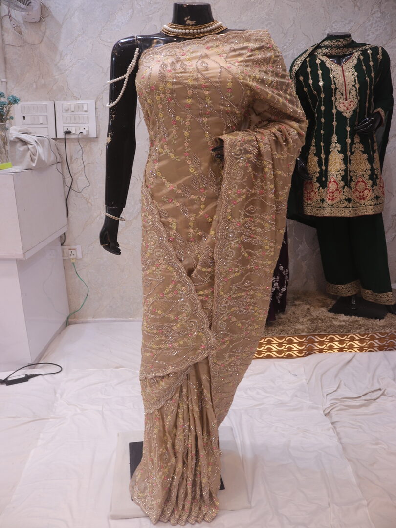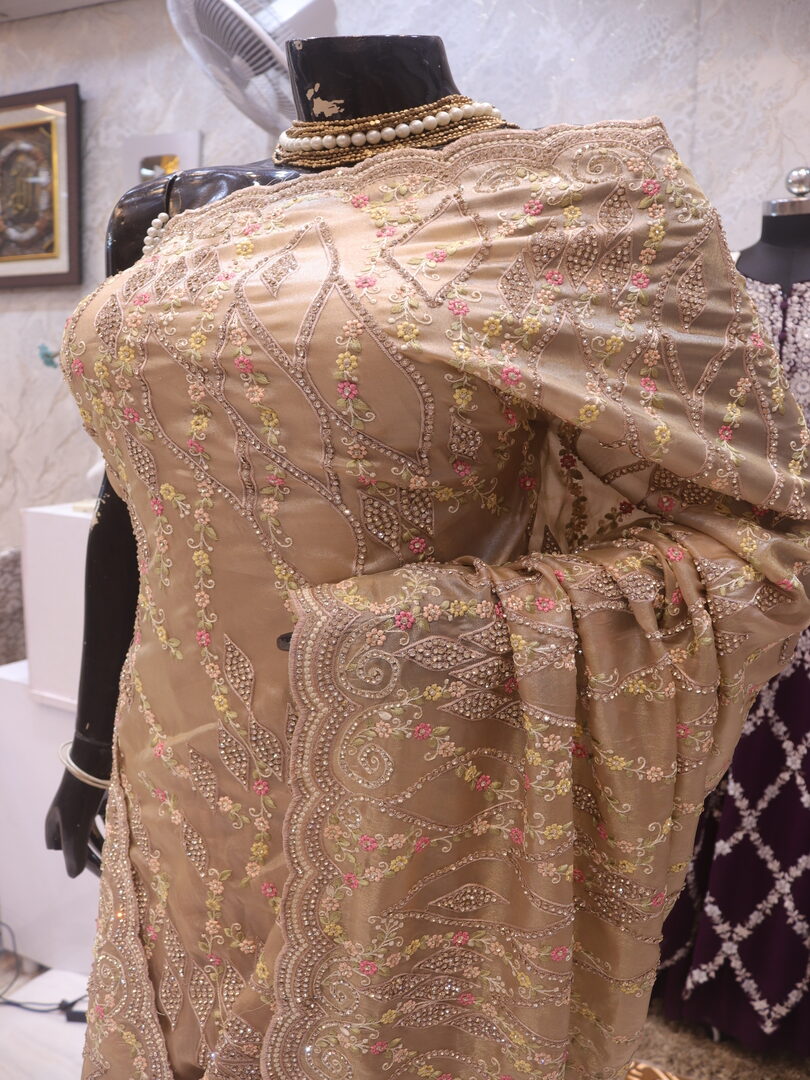 Saree Details: Saree Length: 5.5 Meters Work Type: Full Work (Jaal) Fabric: Viscose Tissue Color: Golden Petals Embellished with: Zari, Crystals, Resham Border Color: Golden Petals Border Fabric: Viscose Tissue Border Work: Zari, Crystals, Resham Blouse Details: Unstitched Blouse Fabric 0.8 Meters Fabric: Viscose Tissue Color: Golden Petals Embellished with: Zari, Crystals, Resham