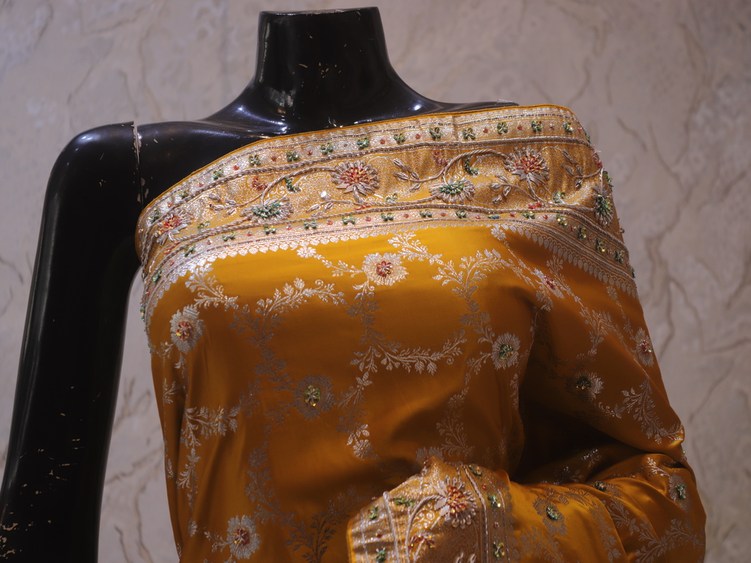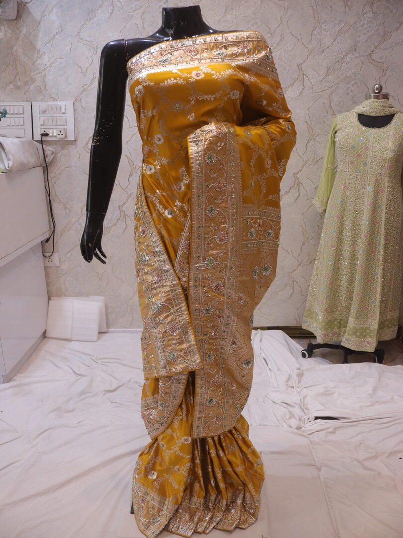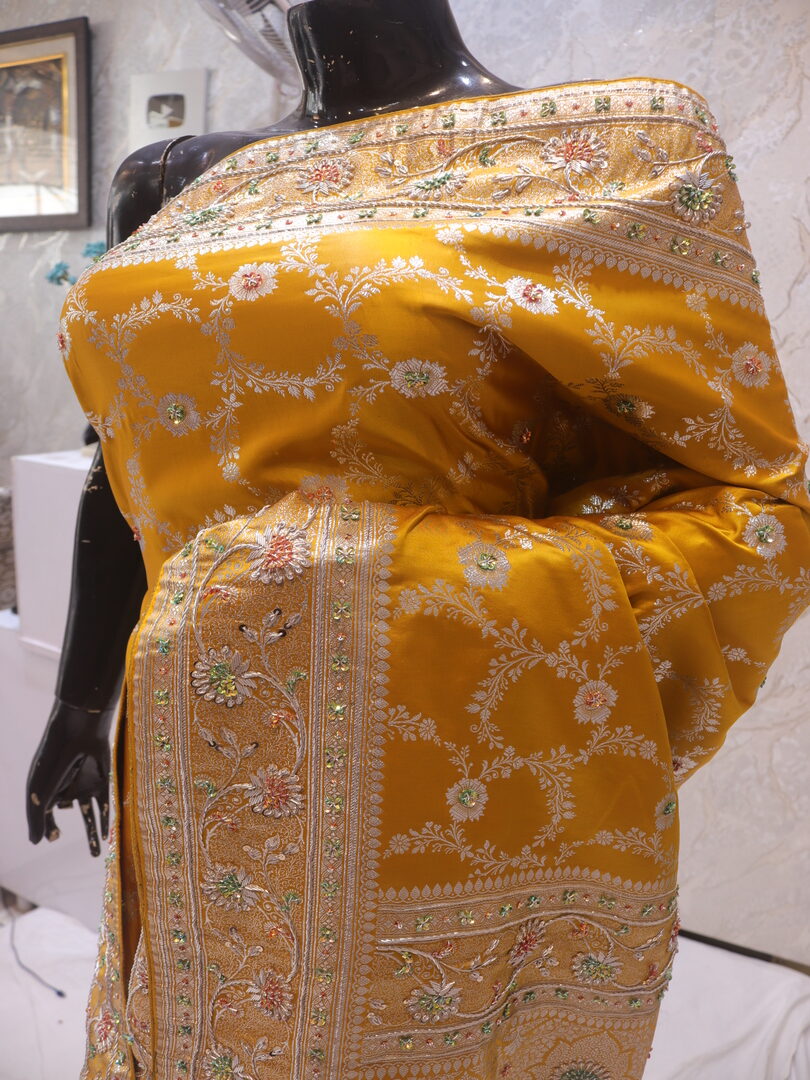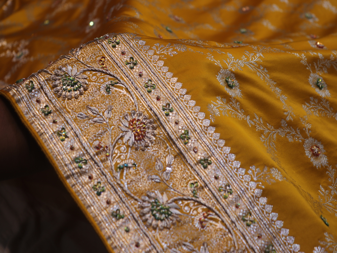Saree Details: Saree Length: 5.5 Meters Work Type: Weaving (Jaal) Fabric: Banarasi Silk Color: Golden Yellow Embellished with: Silver Zari, Zardozi, Sequins Border Color: Golden Yellow Border Fabric: Banarasi Silk Border Work: Silver Zari, Zardozi, Sequins Blouse Details: Unstitched Blouse Fabric 0.8 Meters Work Type: Weaving Fabric: Banarasi Silk Color: Golden Yellow Embellished with: Silver Zari, Zardozi, Sequins