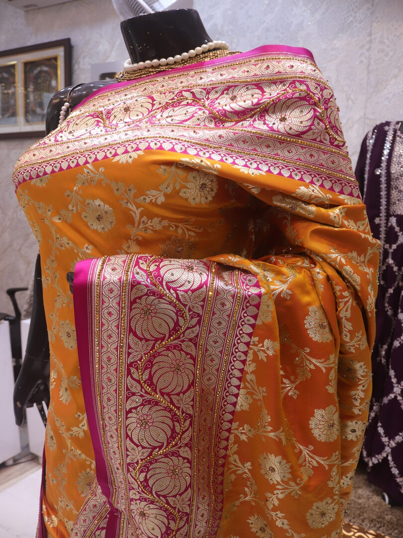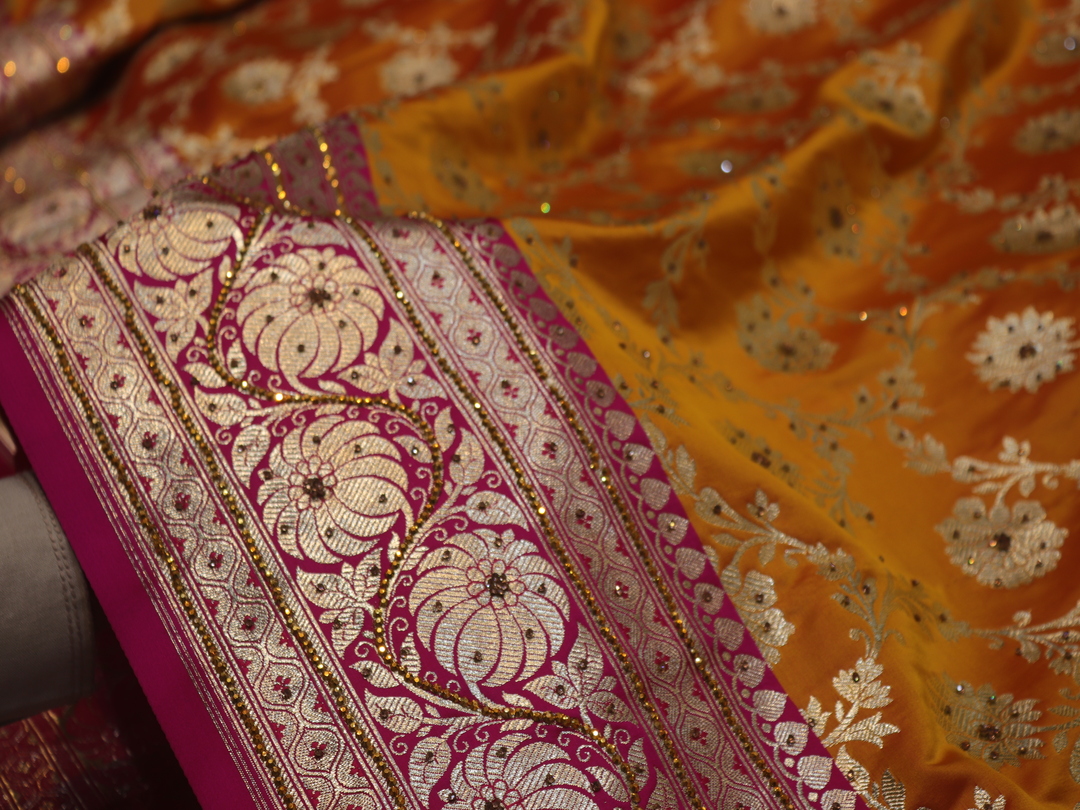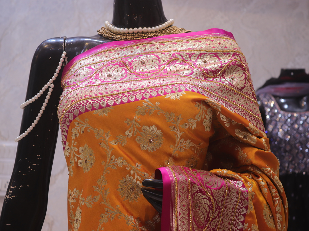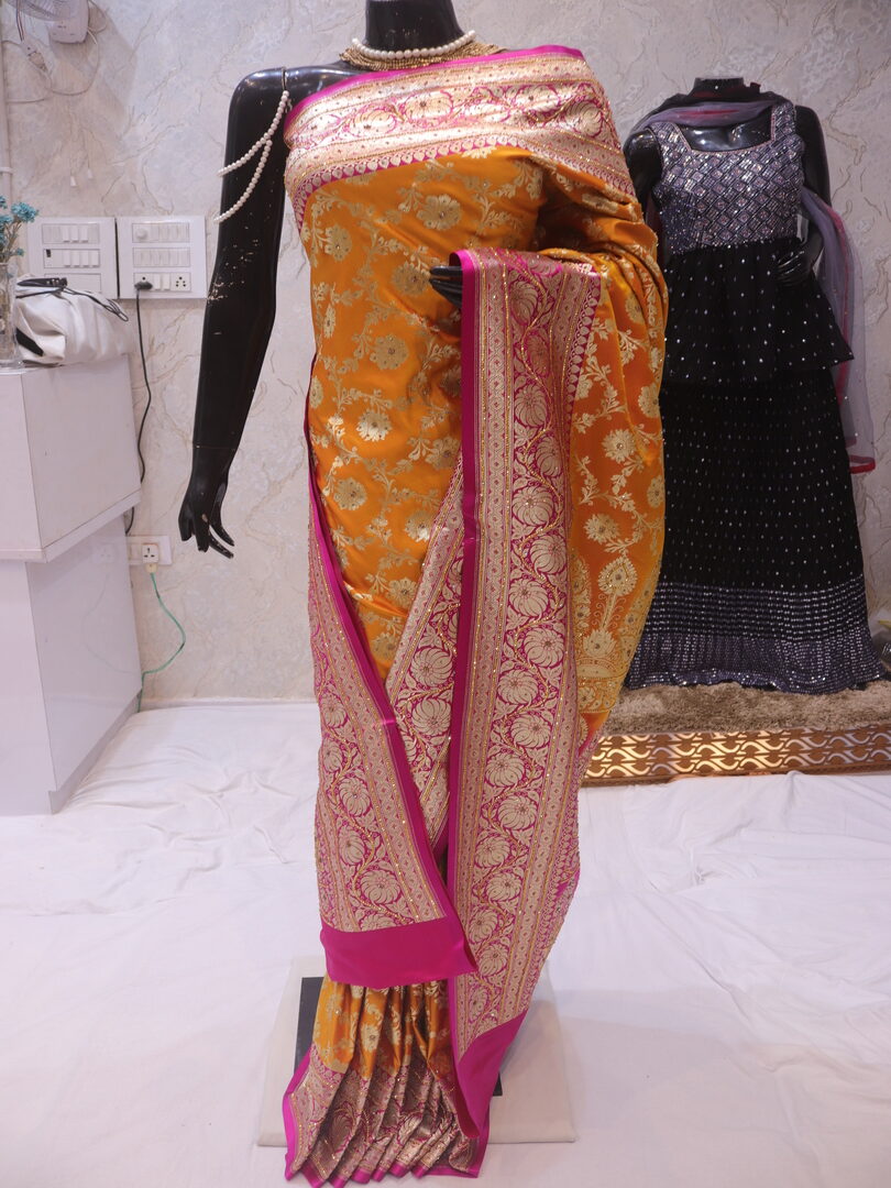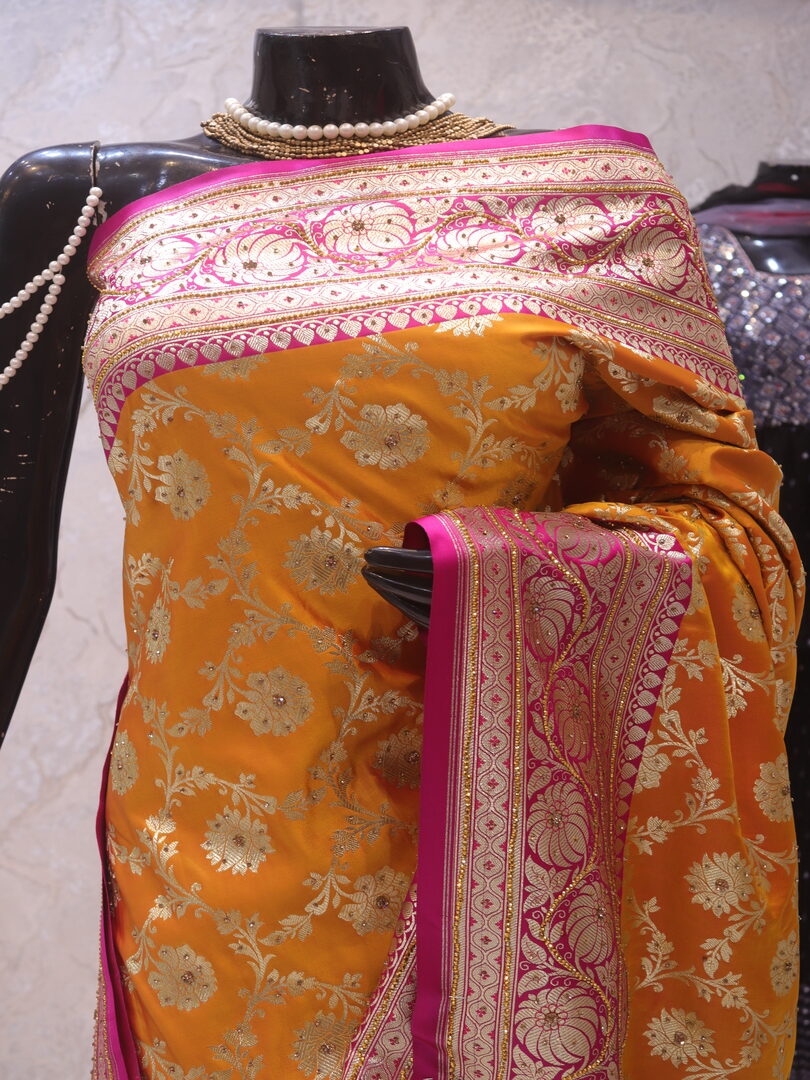 Saree Details: Saree Length: 5.5 Meters Work Type: Weaving (Jaal) Fabric: Banarasi Silk Saree Color: Golden Yellow Embellished with: Golden Zari, Acrylic Stones, Crystals Border Color: Pink Fabric: Banarasi Silk Border Work: Golden Zari, Acrylic Stones, Crystals Blouse Details: Unstitched Blouse Fabric 0.8 Meters Work Type: Weaving Fabric: Banarasi Silk Color: Pink Embellished with: Golden Zari, Acrylic Stones, Crystals