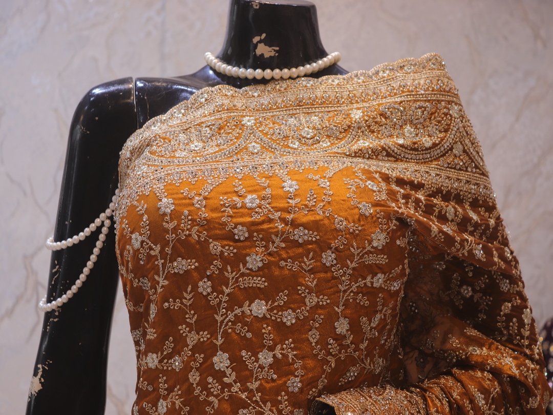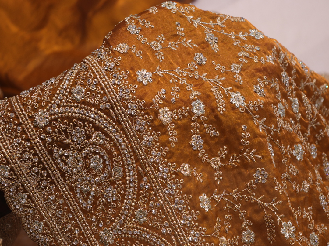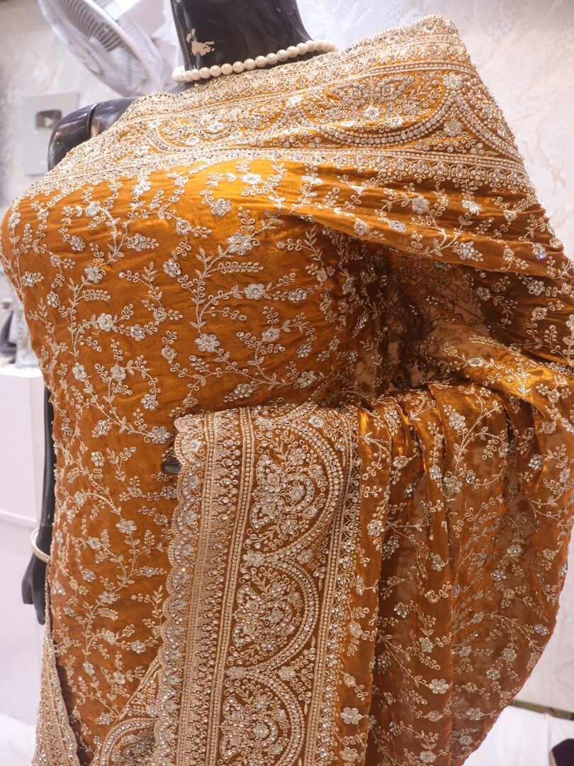 Saree Details: Saree Length: 5.5 Meters Work Type: Full Work (Jaal) Fabric: Fendi Color: Golden Yellow Embellished with: Zari, Crystals Border Color: Golden Yellow Border Fabric: Fendi Border Work: Zari, Crystals Blouse Details: Unstitched Blouse Fabric 0.8 Meters Fabric: Fendi Color: Golden Yellow Embellished with: Zari, Crystals