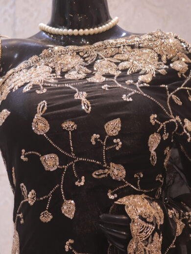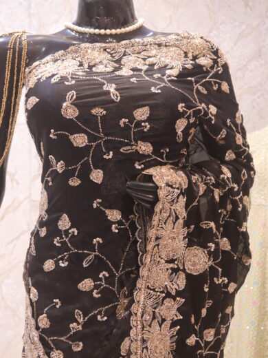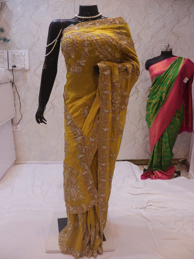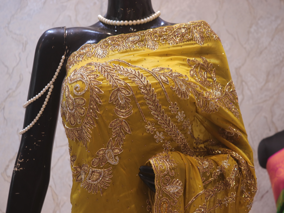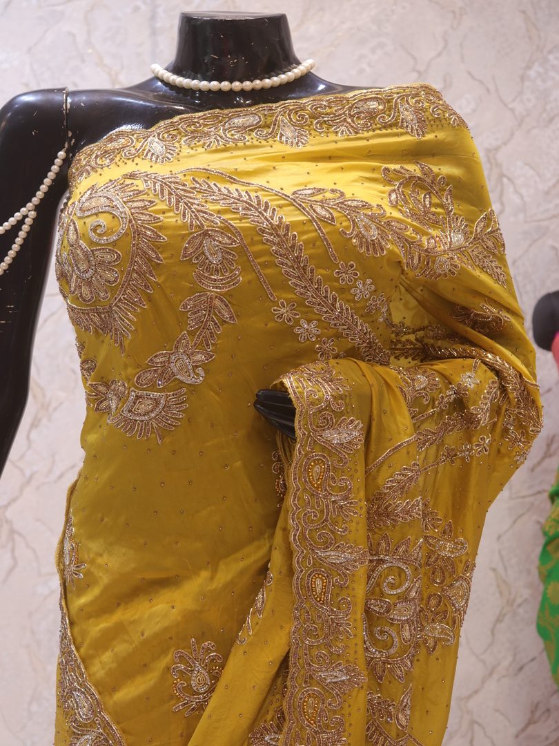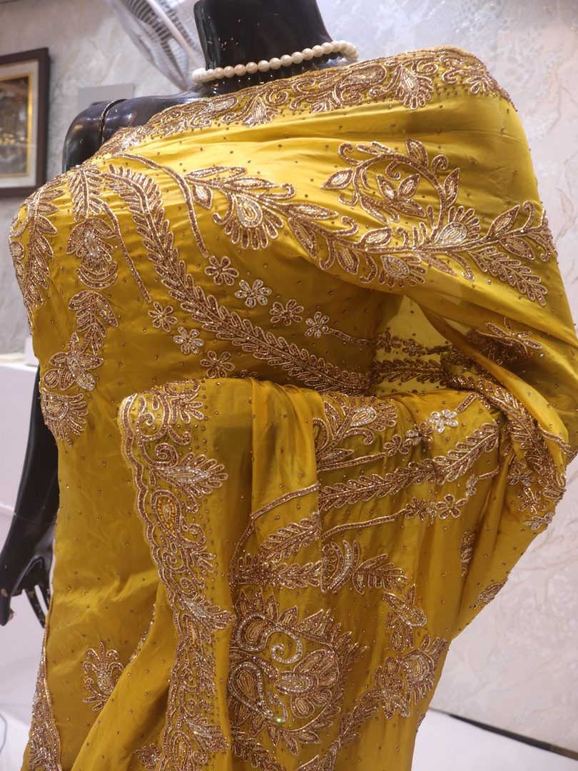 Saree Details: Saree Length: 5.5 Meters Work Type: Full Work (Jaal) Fabric: Organza Color: Golden Yellow Embellished with: Zardozi, Crystals Border Color: Golden Yellow Border Fabric: Organza Border Work: Zardozi, Crystals Blouse Details: Unstitched Blouse Fabric 0.8 Meters Fabric: Organza Color: Golden Yellow Embellished with: Zardozi, Crystals