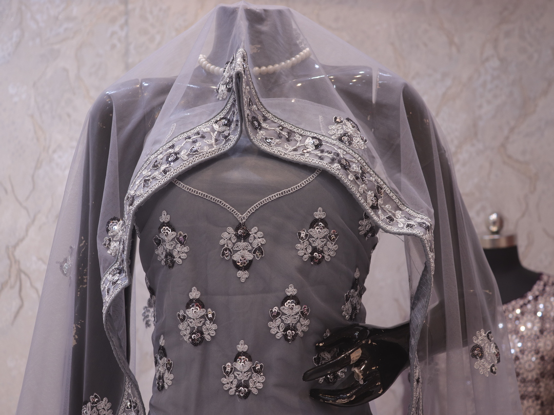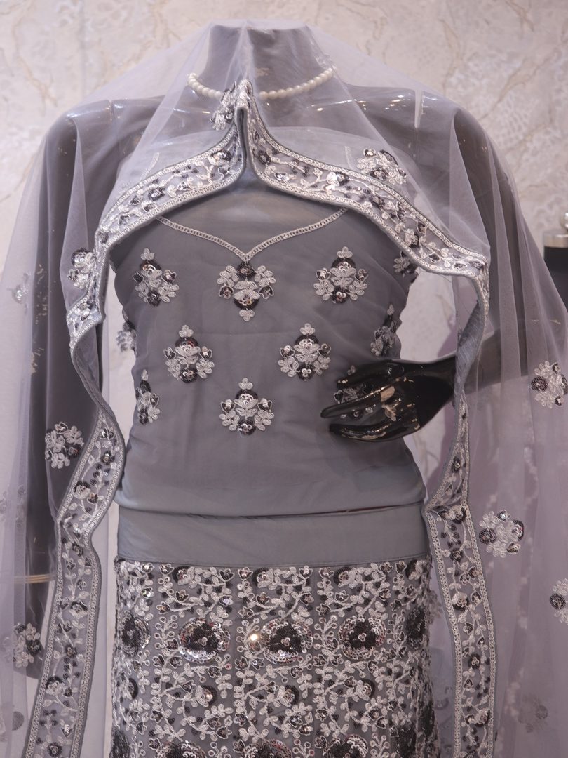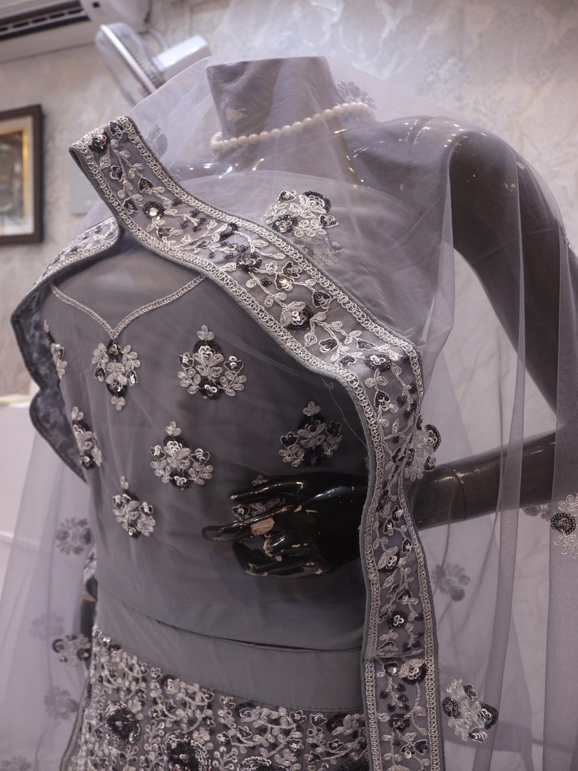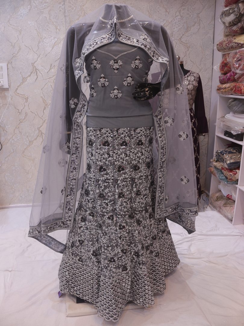 Lehenga Details: Work Type: Full Work Fabric: Net Color: Gray Duet Embellished with: Resham, Sequins Top Details: Fabric: Net Color: Gray Duet Embellished with: Resham, Sequins Dupatta Details: Fabric: Net Color: Gray Duet Embellished with: Resham, Sequins
