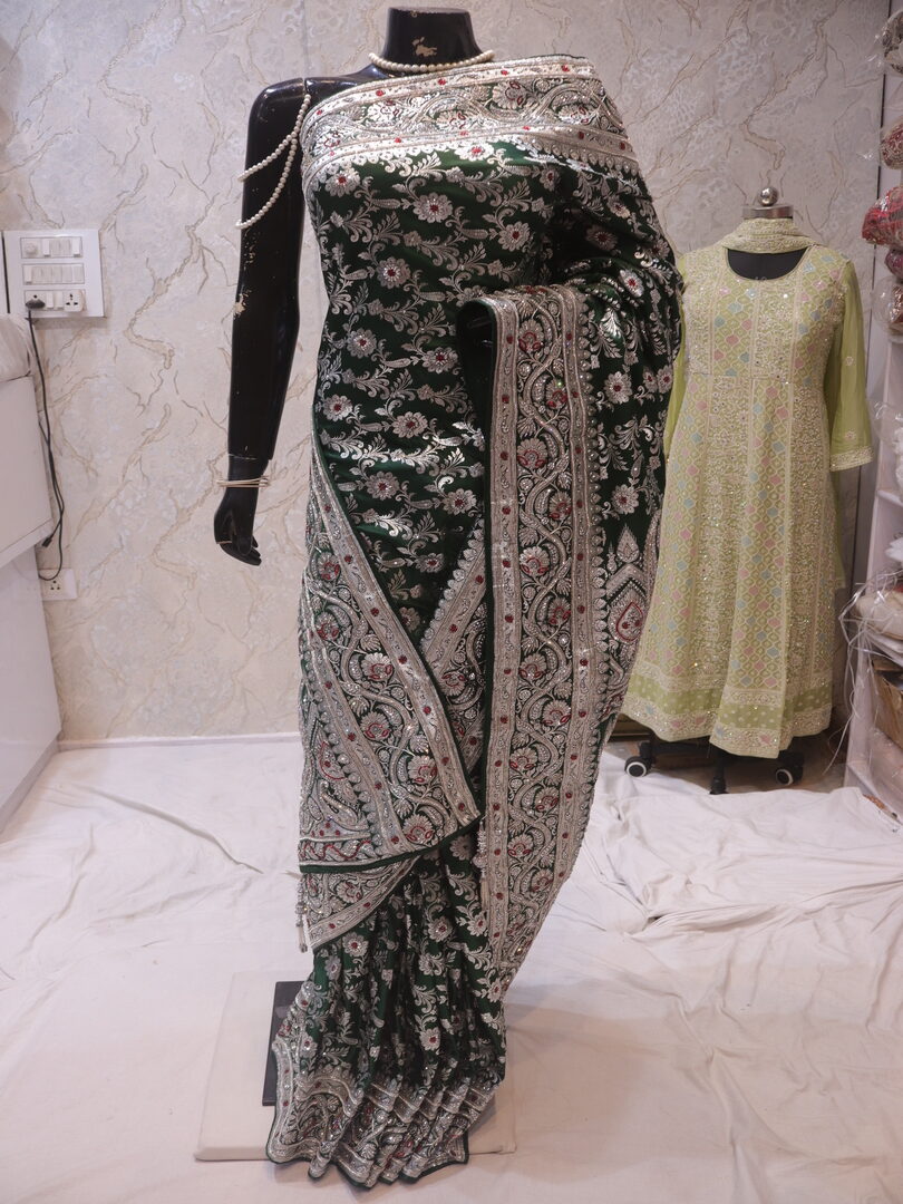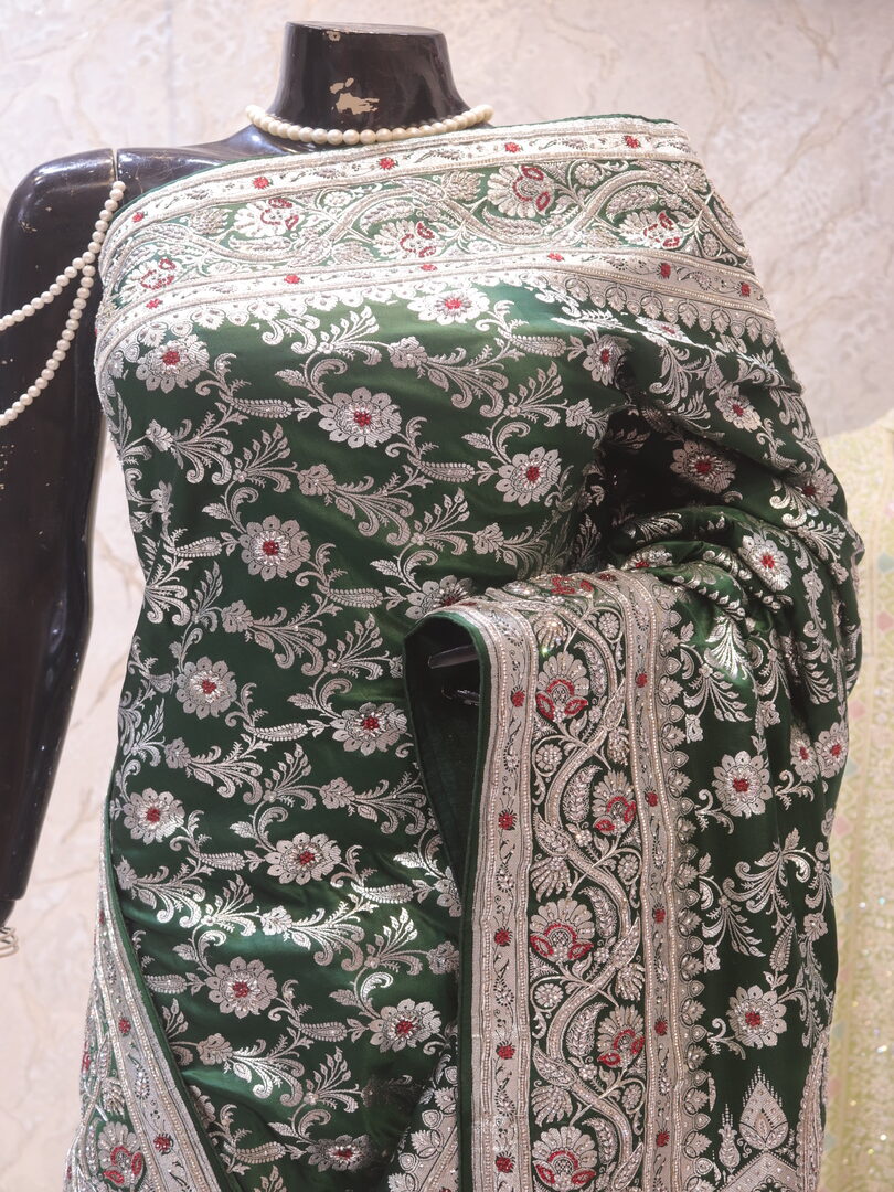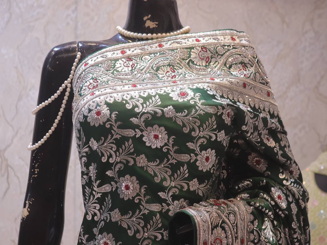Saree Details: Saree Length: 5.5 Meters Work Type: Weaving (Jaal) Fabric: Banarasi Silk Silk Color: Green Moissanite Embellished with: Silver Zari, Crystals, Zardozi, Acrylic Stones Border Color: Green Moissanite Fabric: Banarasi Silk Border Work: Silver Zari, Crystals, Zardozi, Acrylic Stones Blouse Details: Unstitched Blouse Fabric 0.8 Meters Work Type: Weaving Fabric: Banarasi Silk Color: Green Moissanite Embellished with: Silver Zari, Crystals, Zardozi, Acrylic Stones