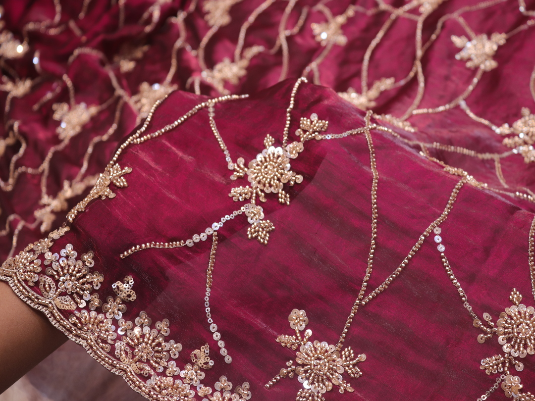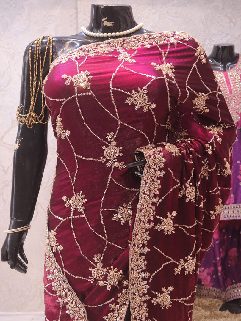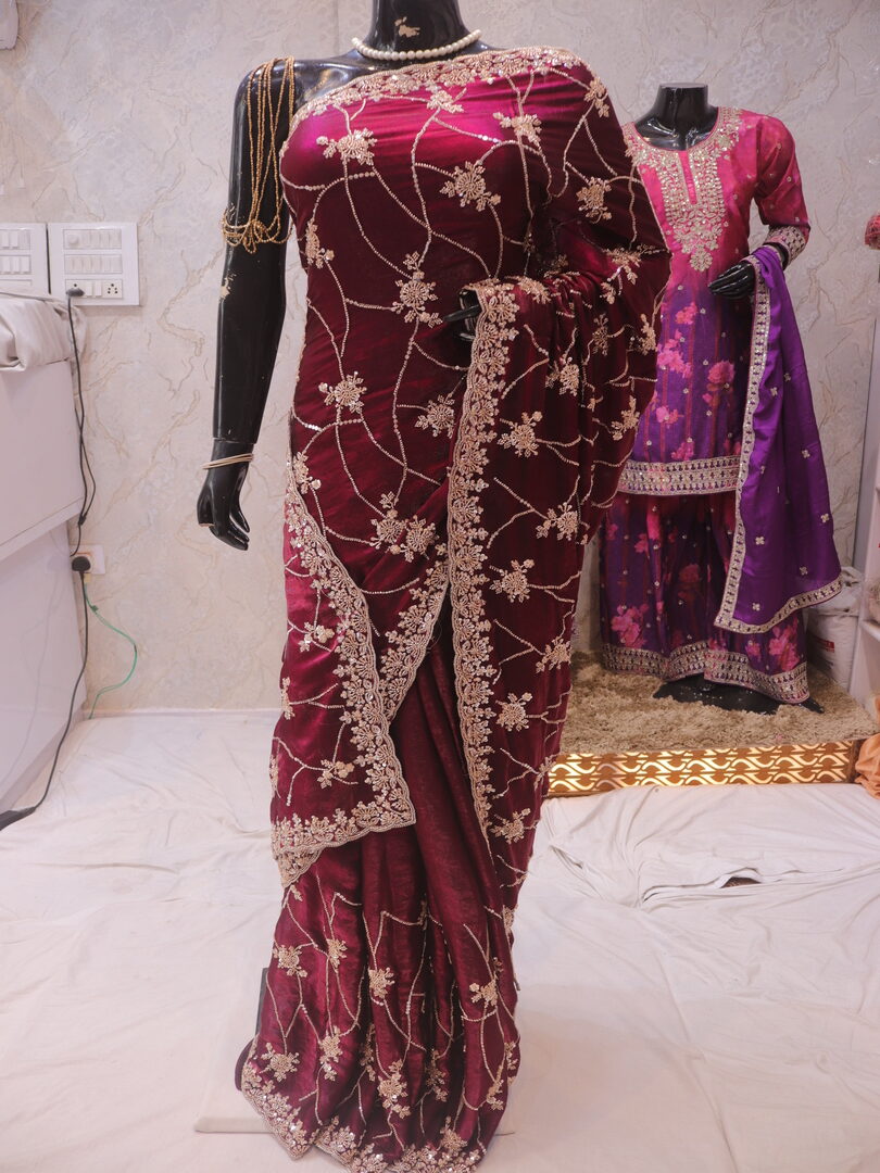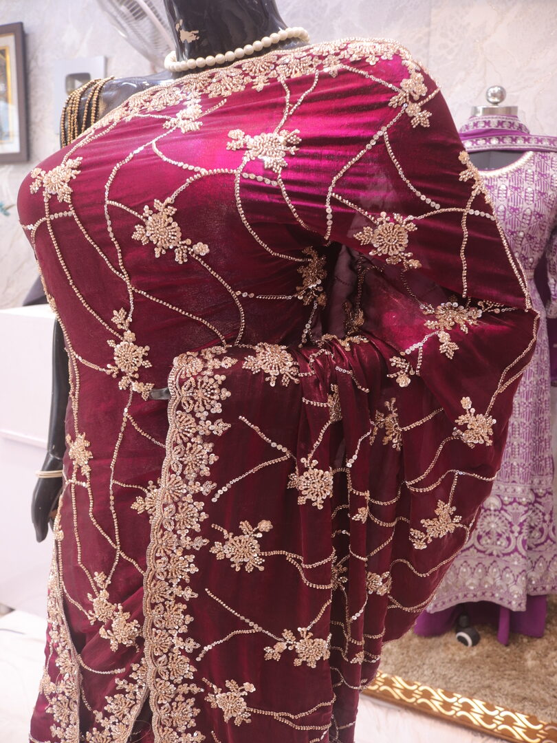 Saree Details: Saree Length: 5.5 Meters Work Type: Full Work (Jaal) Fabric: Fendi Color: Insolent Purple Embellished with: Sequins, Beads, Zari Border Color: Insolent Purple Border Fabric: Fendi Border Work: Sequins, Beads, Zari Blouse Details: Unstitched Blouse Fabric 0.8 Meters Fabric: Fendi Color: Insolent Purple Embellished with: Sequins, Beads, Zari