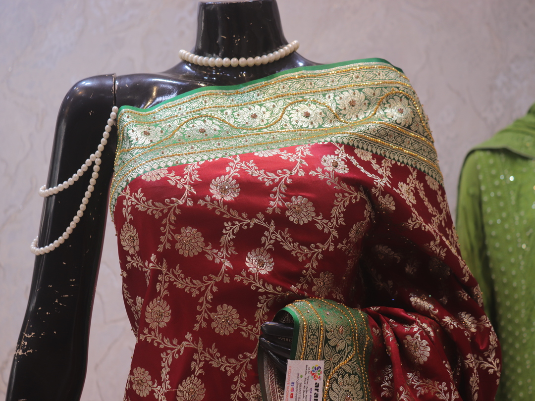 Saree Details: Saree Length: 5.5 Meters Work Type: Weaving (Jaal) Fabric: Banarasi Silk Color: Mahogany Duet Embellished with: Golden Zari, Crystals, Acrylic Stones Border Color: Green Border Fabric: Banarasi Silk Border Work: Golden Zari, Crystals, Acrylic Stones Blouse Details: Unstitched Blouse Fabric 0.8 Meters Work Type: Weaving Fabric: Banarasi Silk Color: Green Embellished with: Golden Zari, Crystals, Acrylic Stones