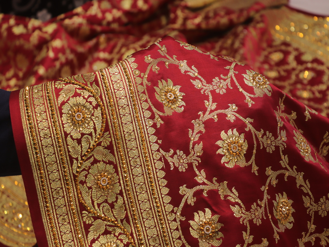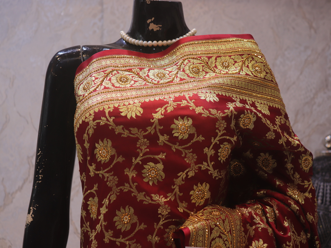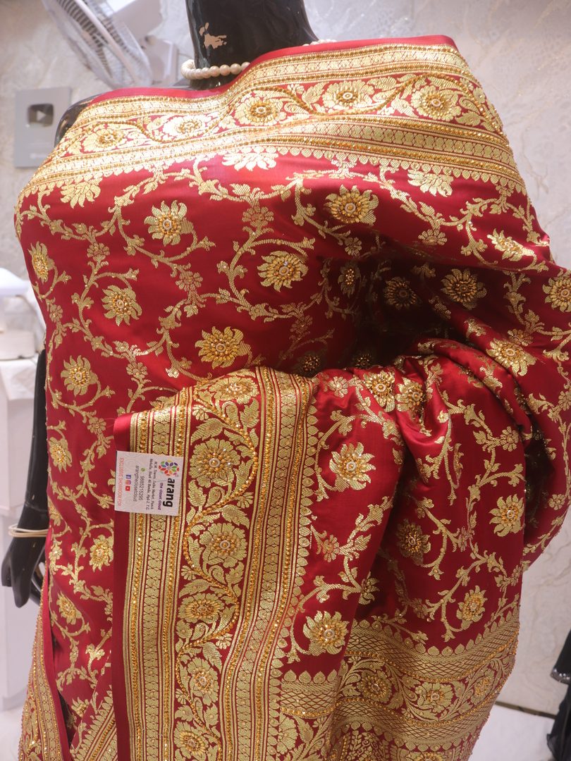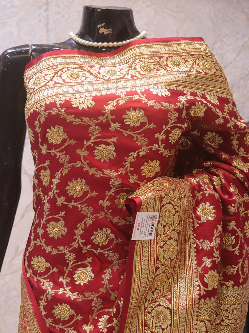 Saree Details: Saree Length: 5.5 Meters Work Type: Weaving (Jaal) Fabric: Banarasi Katan Silk Saree Color: Mahogany Red Embellished with: Golden Zari, Acrylic Stones, Mirror Border Color: Mahogany Red Fabric: Banarasi Katan Silk Border Work: Golden Zari, Acrylic Stones, Mirror Blouse Details: Unstitched Blouse Fabric 0.8 Meters Work Type: Weaving Fabric: Banarasi Katan Silk Color: Mahogany Red Embellished with: Golden Zari, Acrylic Stones, Mirror
