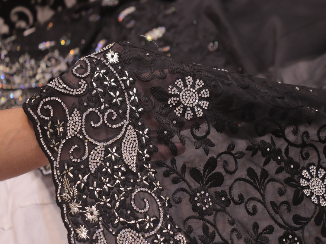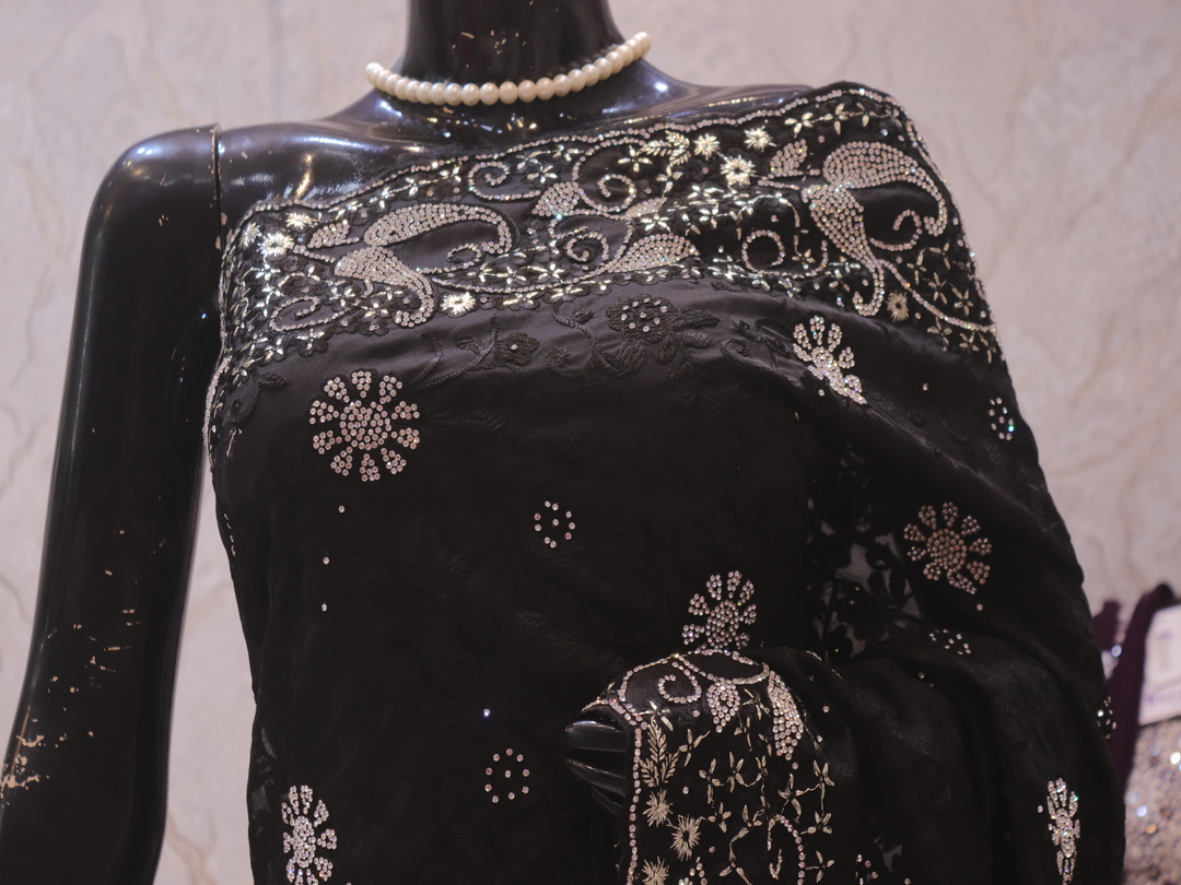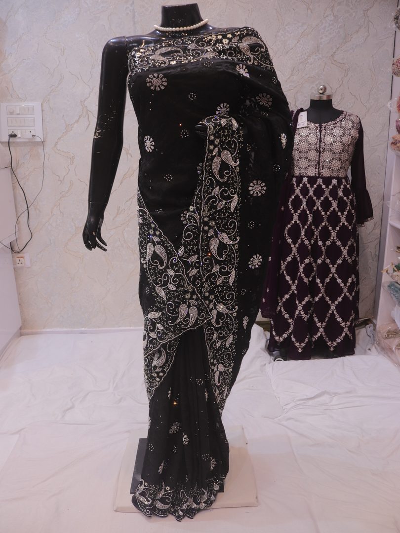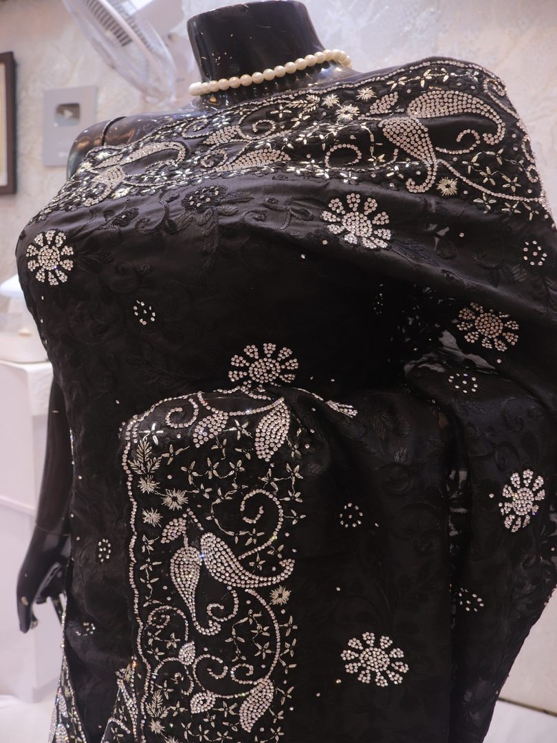 Saree Details: Saree Length: 5.5 Meters Work Type: Full Work (Jaal) Fabric: Organza Color: Metal Black Embellished with: Zari, Crystals, Resham Border Color: Metal Black Border Fabric: Organza Border Work: Zari, Crystals, Resham Blouse Details: Unstitched Blouse Fabric 0.8 Meters Fabric: Organza Color: Metal Black Embellished with: Zari, Crystals, Resham