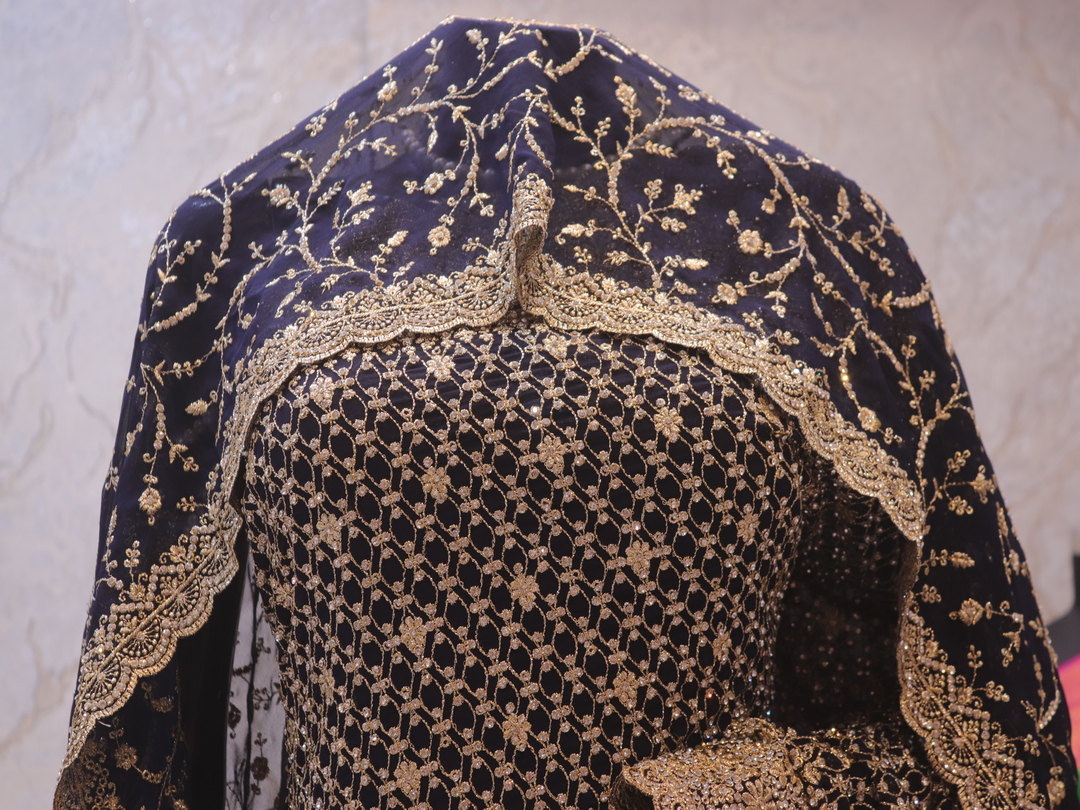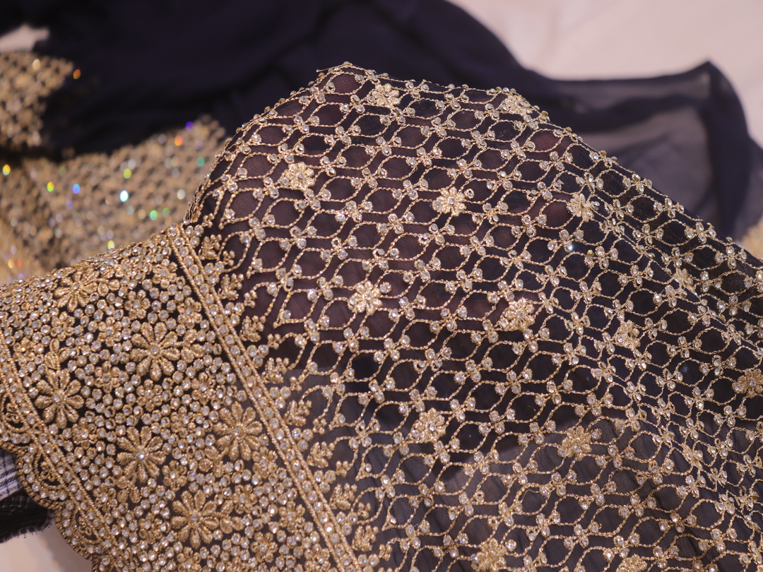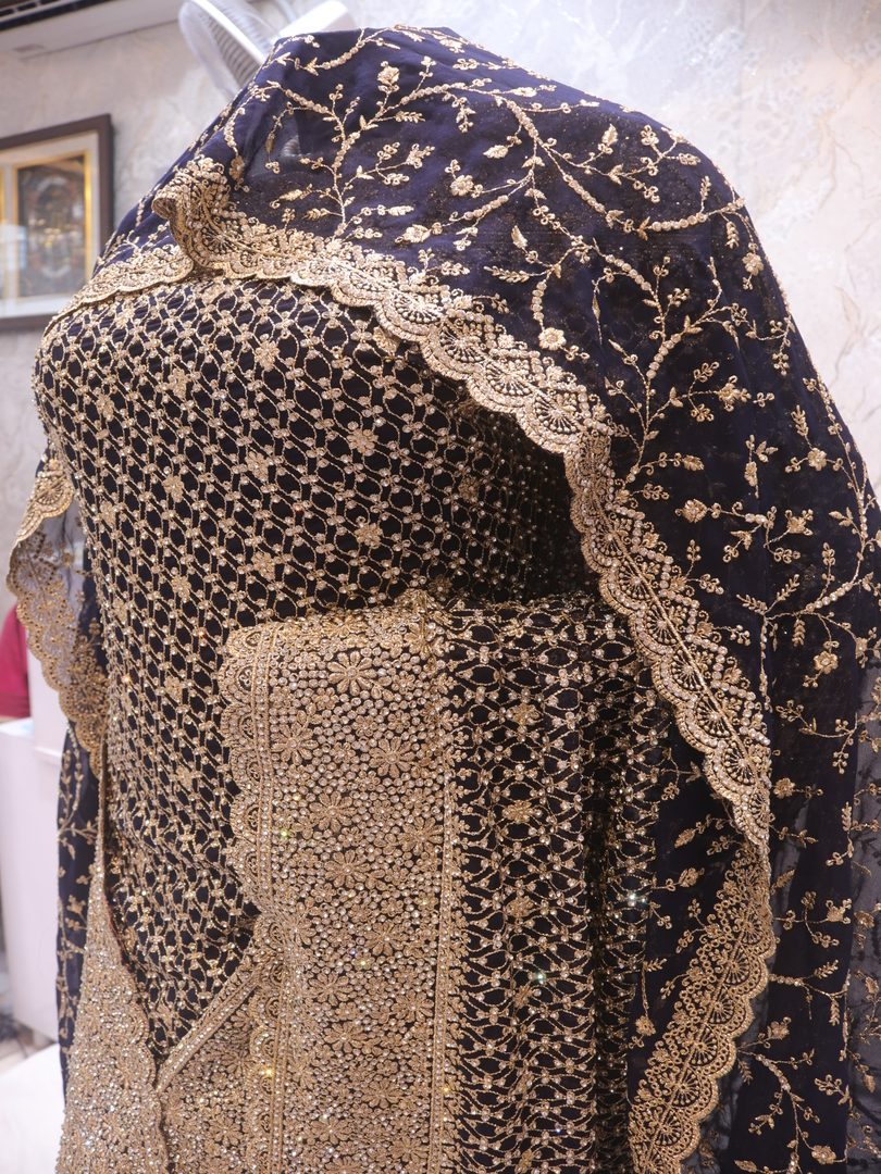Saree Details: Saree Length: 5.5 Meters Work Type: Full Work (Jaal) Fabric: Georgette Color: Midnight Blue Embellished with: Zari, Crystals Border Color: Midnight Blue Border Fabric: Georgette Border Work: Zari, Crystals Blouse Details: Unstitched Blouse Fabric 0.8 Meters Fabric: Georgette Color: Midnight Blue Embellished with: Zari, Crystals Veil Details: Fabric: Georgette Color: Midnight Blue Embellished with: Zari, Crystals