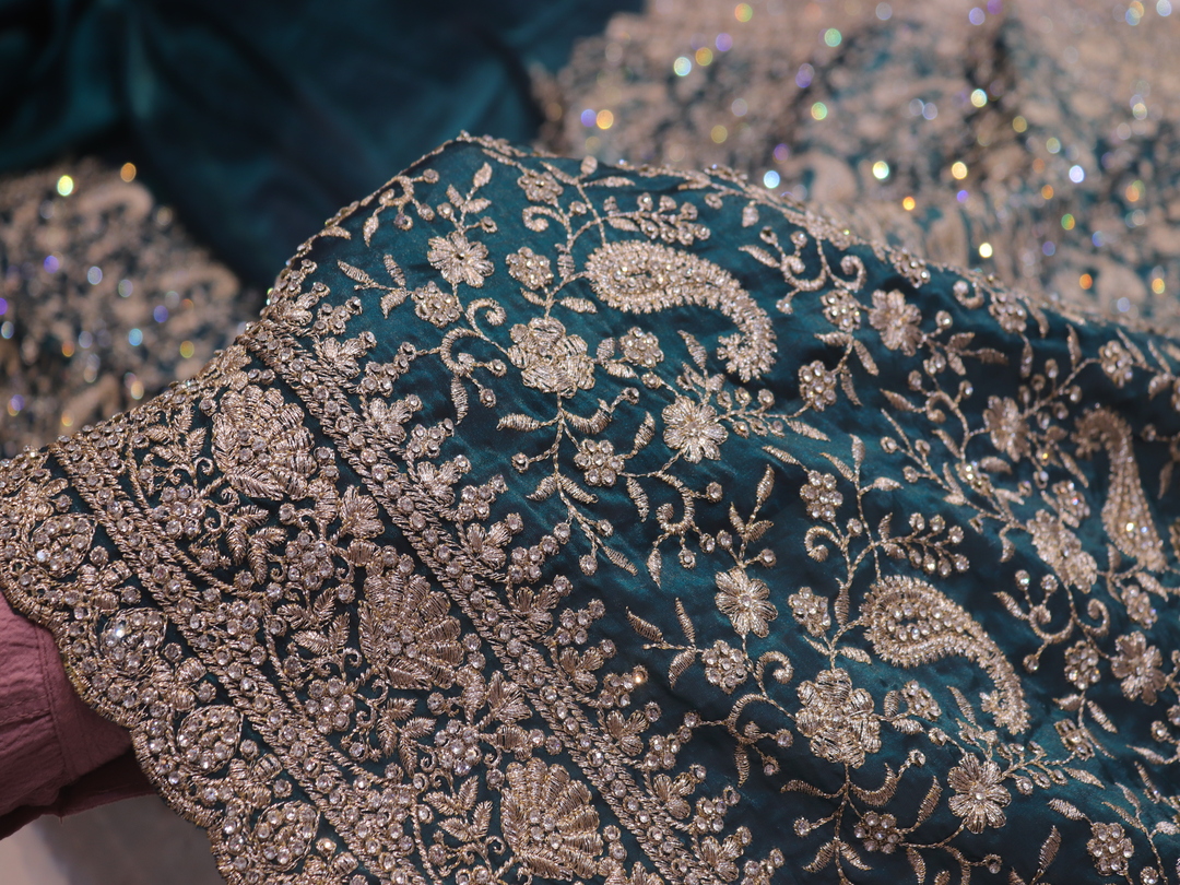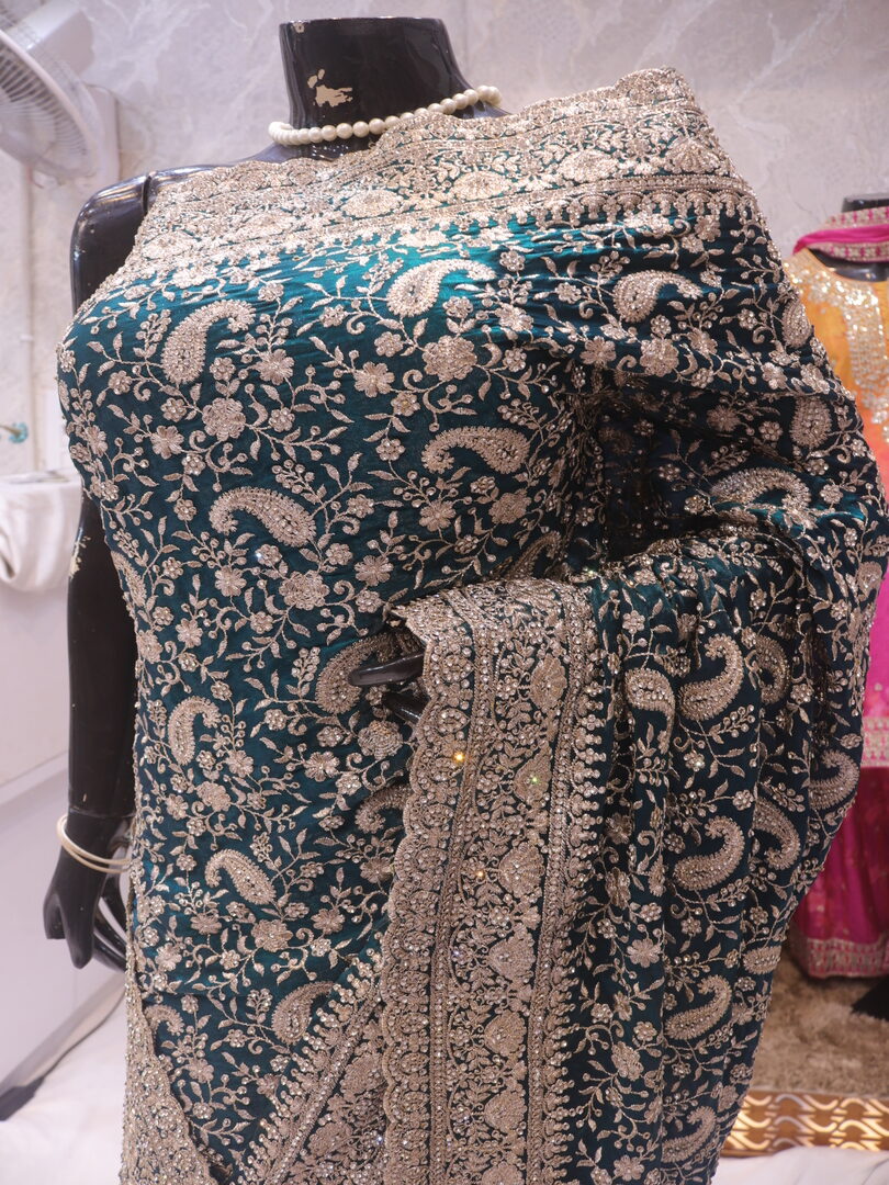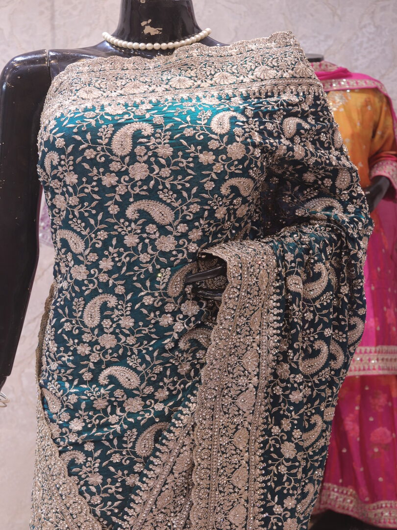 Saree Details: Saree Length: 5.5 Meters Work Type: Full Work (Jaal) Fabric: Fendi Color: Midnight Green Embellished with: Zari, Crystals Border Color: Midnight Green Border Fabric: Fendi Border Work: Zari, Crystals Blouse Details: Unstitched Blouse Fabric 0.8 Meters Fabric: Fendi Color: Midnight Green Embellished with: Zari, Crystals
