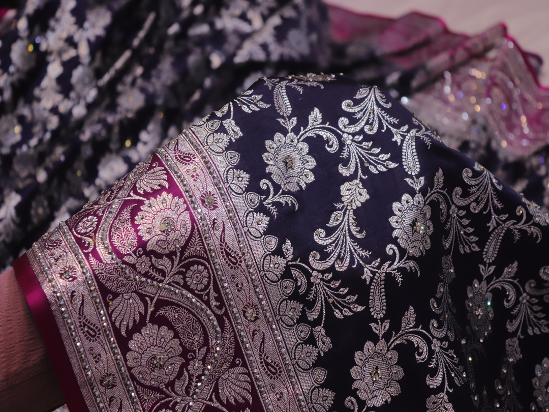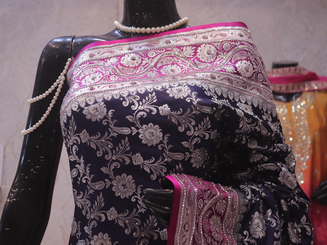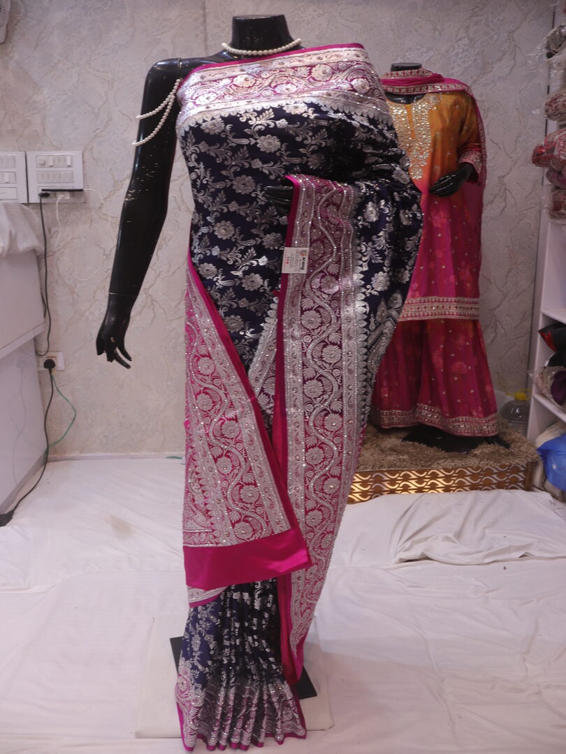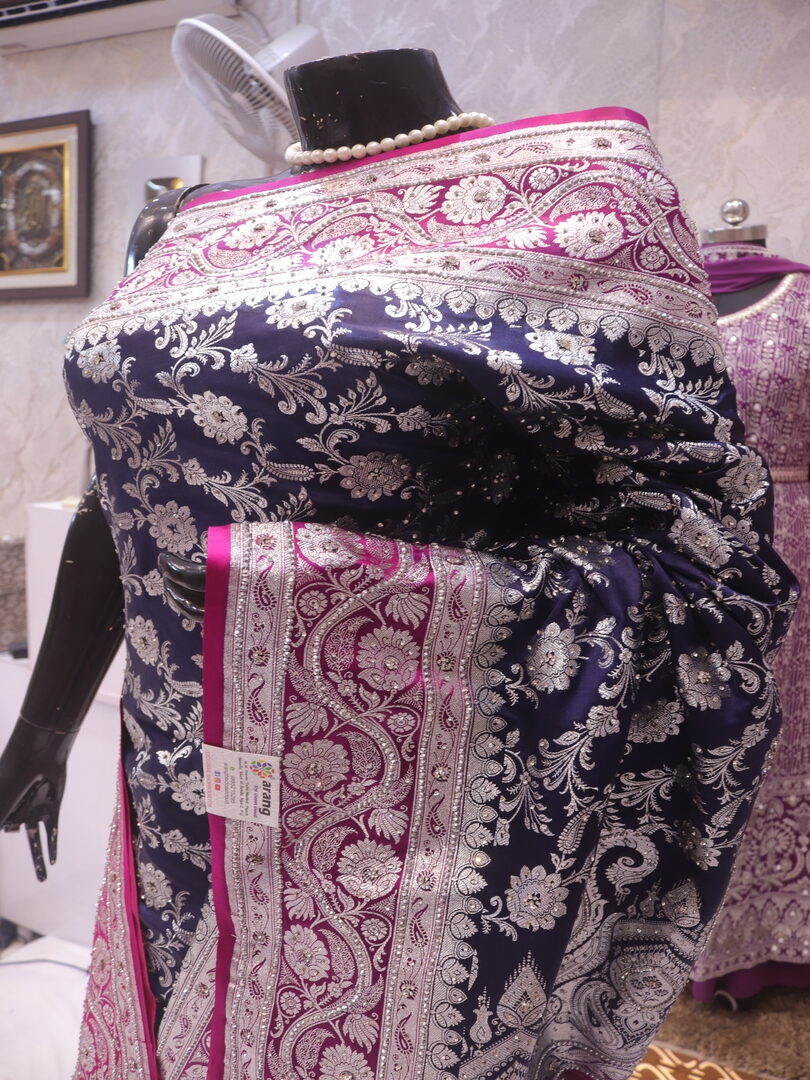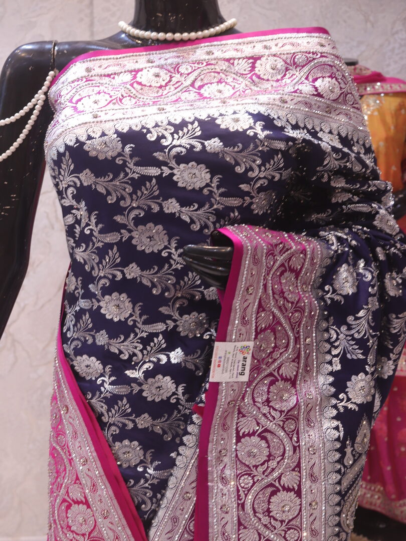 Saree Details: Saree Length: 5.5 Meters Work Type: Weaving (Jaal) Fabric: Banarasi Silk Saree Color: Persian Blue Embellished with: Silver Zari, Acrylic Stones, Crystals Border Color: Pink Fabric: Banarasi Silk Border Work: Silver Zari, Acrylic Stones, Crystals Blouse Details: Unstitched Blouse Fabric 0.8 Meters Work Type: Weaving Fabric: Banarasi Silk Color: Pink Embellished with: Silver Zari, Acrylic Stones, Crystals
