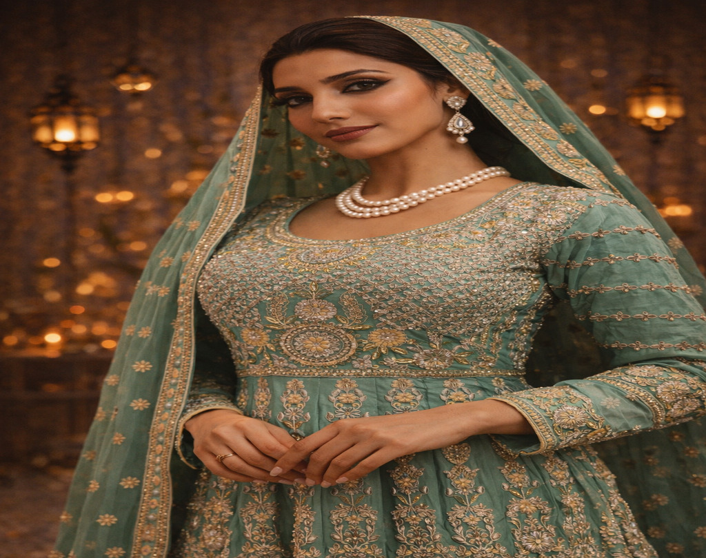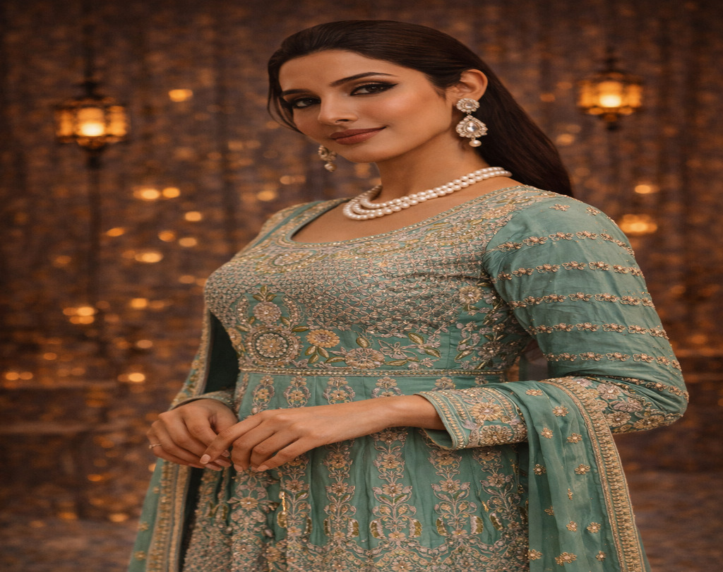 Top Details: Top Type Frock Style top: Ready To Wear Work Type: Full Work Fabric: Pure Chinnon Color: Sea form Green Embellished with: Zari, Crystals, Resham Bottom Details: Bottom Type Plazo : Ready To Wear Fabric: Pure Chinnon Color: Sea form Green Embellished with: Zari, Crystals, Resham Dupatta Details: Fabric: Pure Chinnon Color: Sea form Green Embellished with: Zari, Crystals, Resham