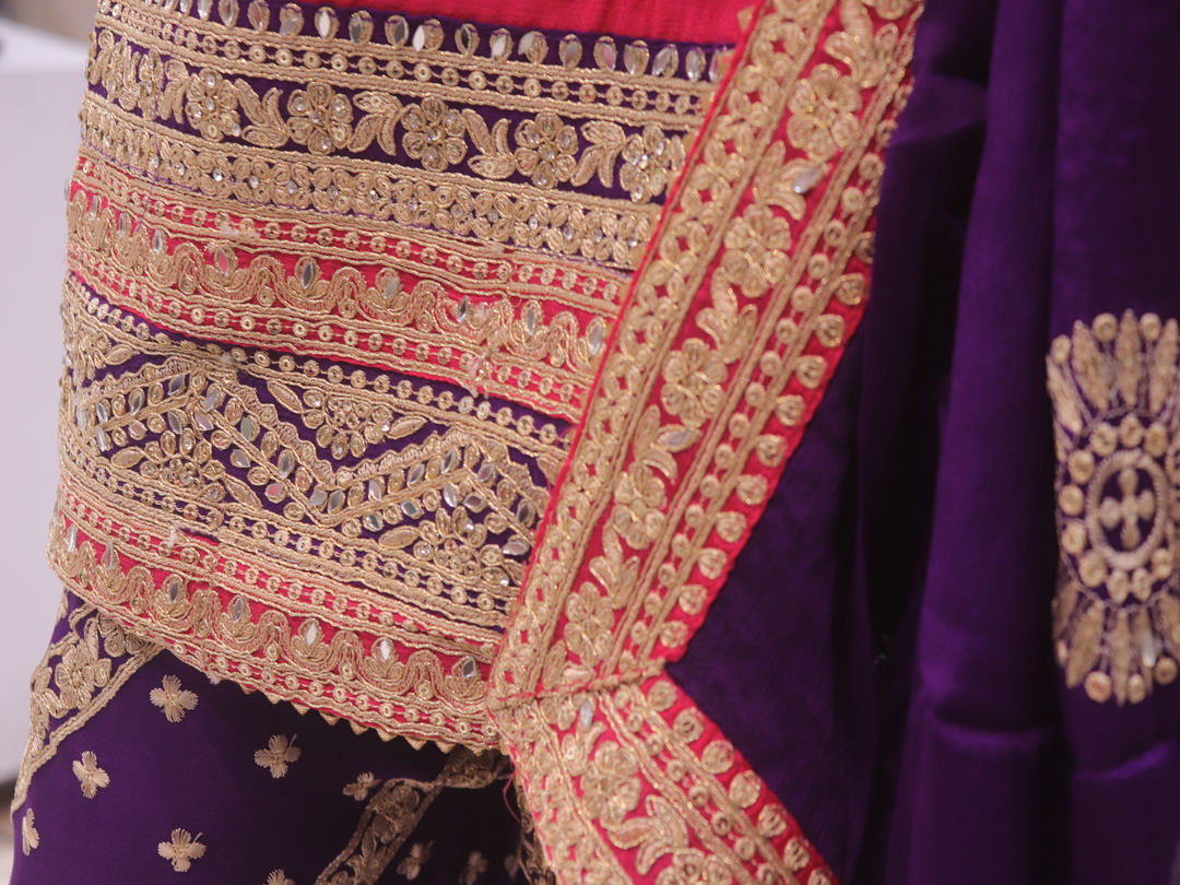 Top Details: Top Type Shirt Style top: Ready To Wear Work Type: Full Work Fabric: Pure Chinon Color: Pink Embellished with: Zari, Crystals, Resham, Sequins, Mirror Bottom Details: Bottom Type Pant : Ready To Wear Fabric: Pure Chinon Color: Purple Embellished with: Zari, Crystals, Resham, Sequins, Mirror Dupatta Details: Fabric: Pure Chinon Color: Purple Embellished with: Zari, Crystals, Resham, Sequins, Mirror