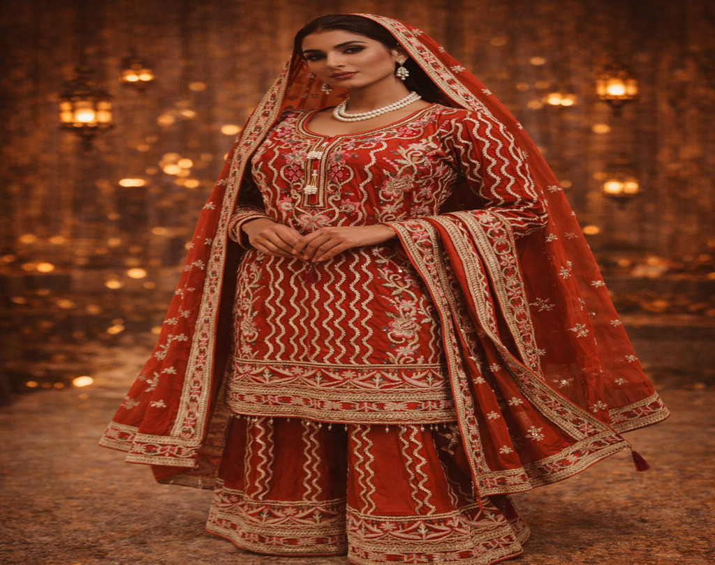 Top Details: Top Type Shirt Style top: Ready To Wear Work Type: Full Work Fabric: Pure Chinon Color: Light Maroon Embellished with: Zari, Crystals, Resham, Gota Work Bottom Details: Bottom Type Plazo : Ready To Wear Fabric: Pure Chinon Color: Light Maroon Embellished with: Zari, Crystals, Resham, Gota Work Dupatta Details: Fabric: Pure Chinon Color: Light Maroon Embellished with: Zari, Crystals, Resham, Gota Work