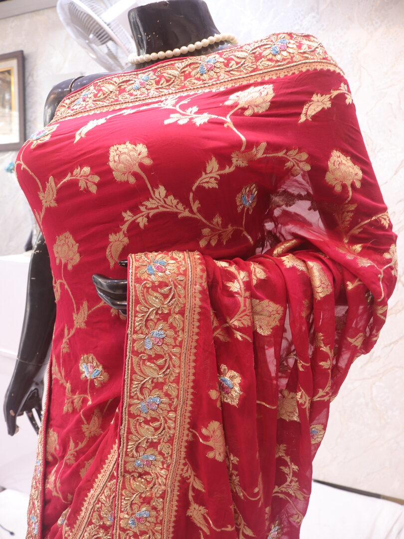 Saree Details: Saree Length: 5.5 Meters Work Type: Weaving (Jaal) Fabric: Banarasi Chiffon Color: Rouge Pink Embellished with: Golden Zari, Zardozi, Sequins Border Color: Rouge Pink Border Fabric: Banarasi Chiffon Border Work: Golden Zari, Zardozi, Sequins Blouse Details: Unstitched Blouse Fabric 0.8 Meters Work Type: Weaving Fabric: Banarasi Chiffon Color: Rouge Pink Embellished with: Golden Zari, Zardozi, Sequins