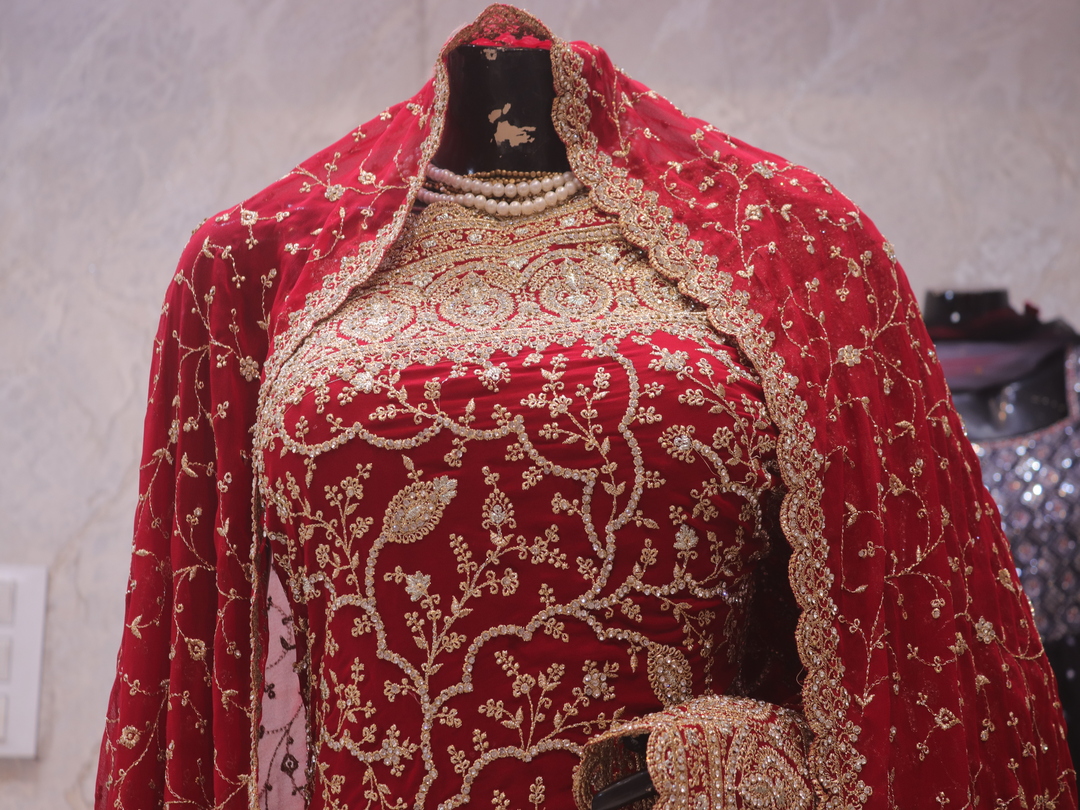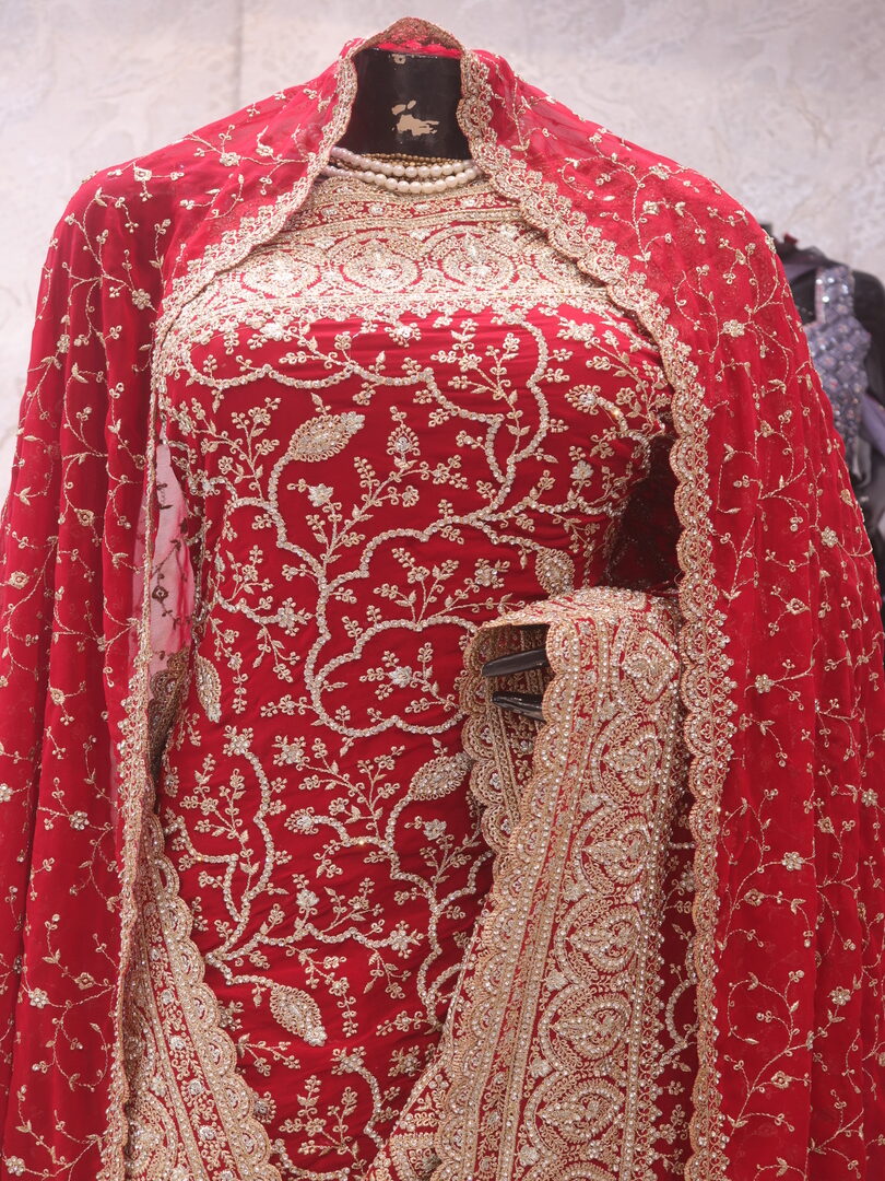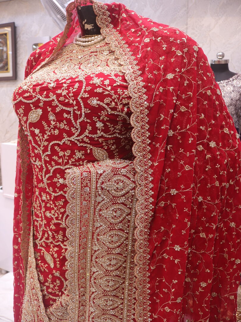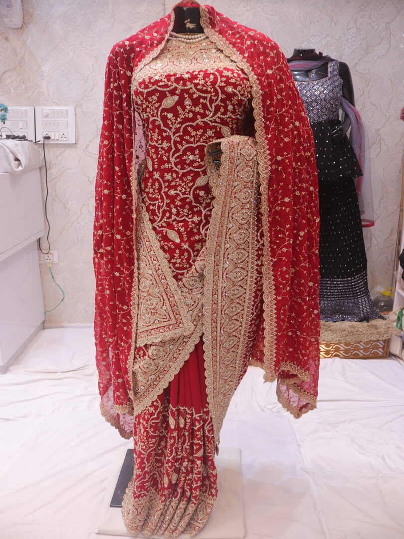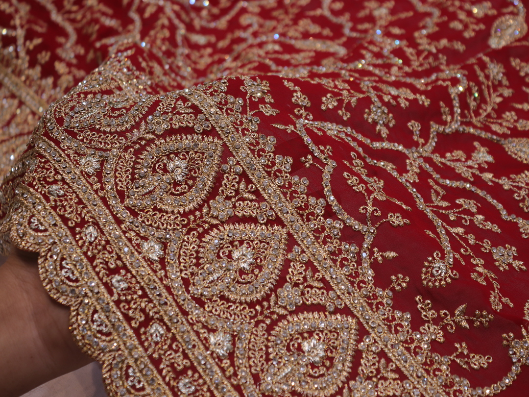 Saree Details: Saree Length: 5.5 Meters Work Type: Full Work (Jaal) Fabric: Georgette Color: Bridal Red Embellished with: Zari, Crystals Border Color: Bridal Red Border Fabric: Georgette Border Work: Zari, Crystals Blouse Details: Unstitched Blouse Fabric 0.8 Meters Fabric: Georgette Color: Bridal Red Embellished with: Zari, Crystals Veil Details: Fabric: Georgette Color: Bridal Red Embellished with: Zari, Crystals