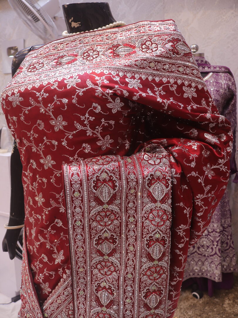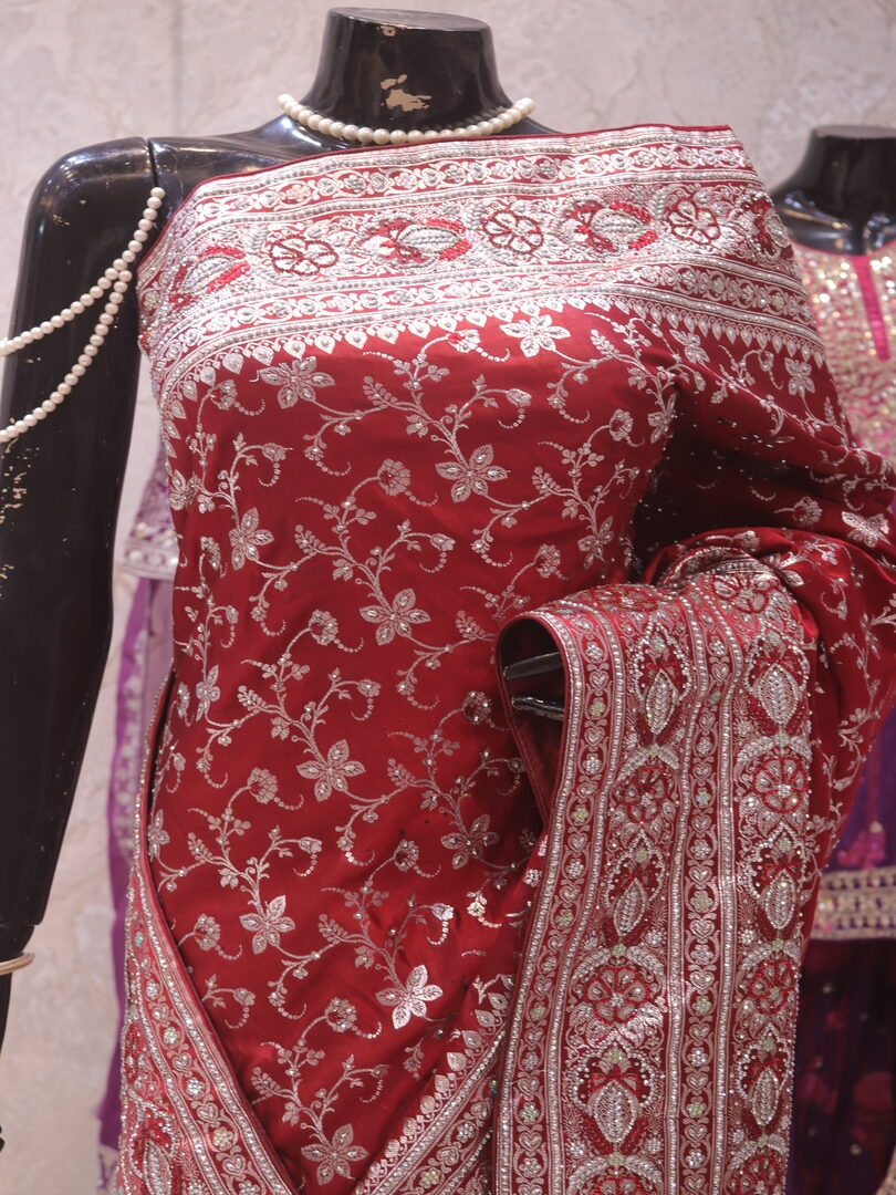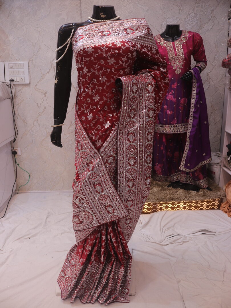 Saree Details: Saree Length: 5.5 Meters Work Type: Weaving (Jaal) Fabric: Banarasi Silk Saree Color: Royal Maroon Embellished with: Zari, Acrylic Stones, Crystals Border Color: Royal Maroon Fabric: Banarasi Silk Border Work: Zari, Acrylic Stones, Crystals Blouse Details: Unstitched Blouse Fabric 0.8 Meters Work Type: Weaving Fabric: Banarasi Silk Color: Royal Maroon Embellished with: Zari, Acrylic Stones, Crystals