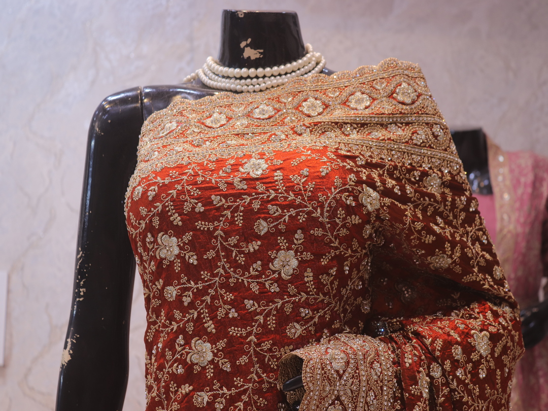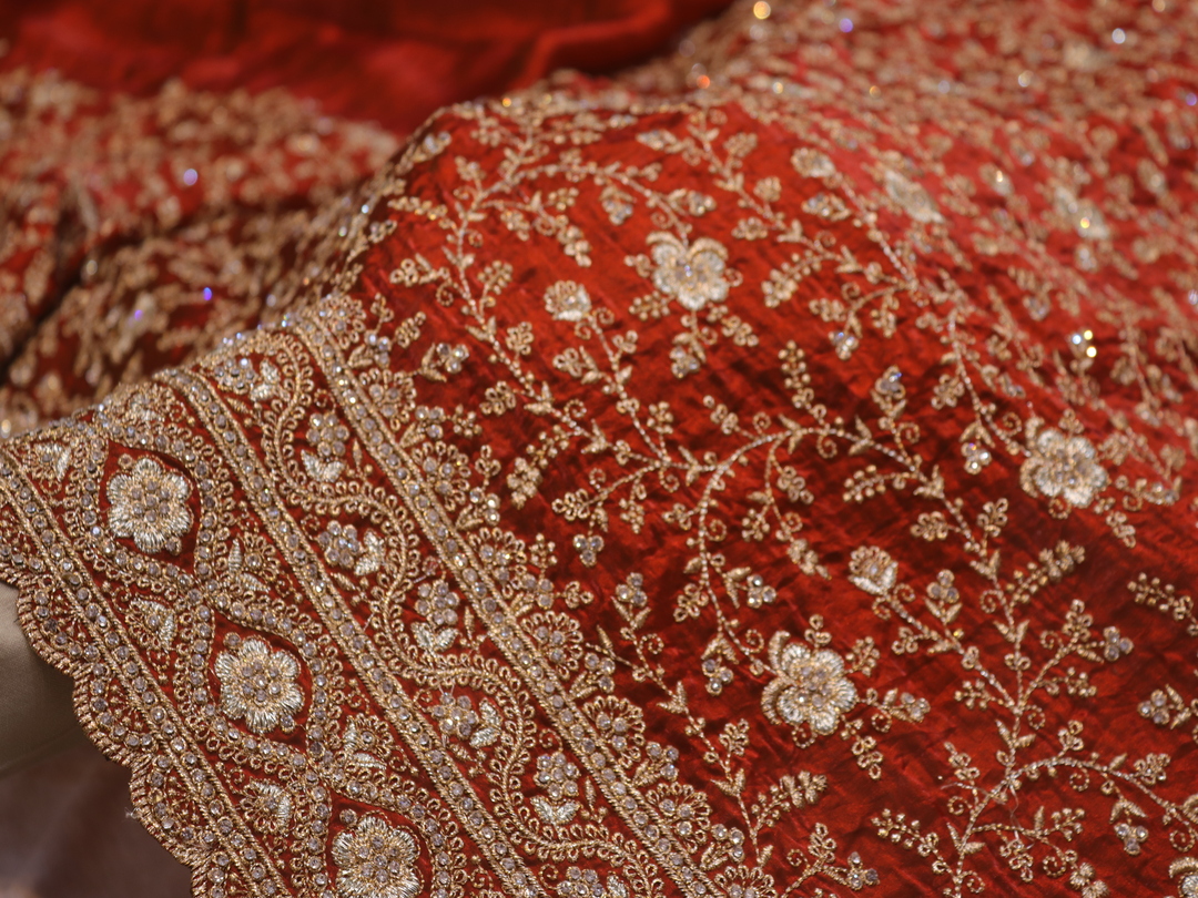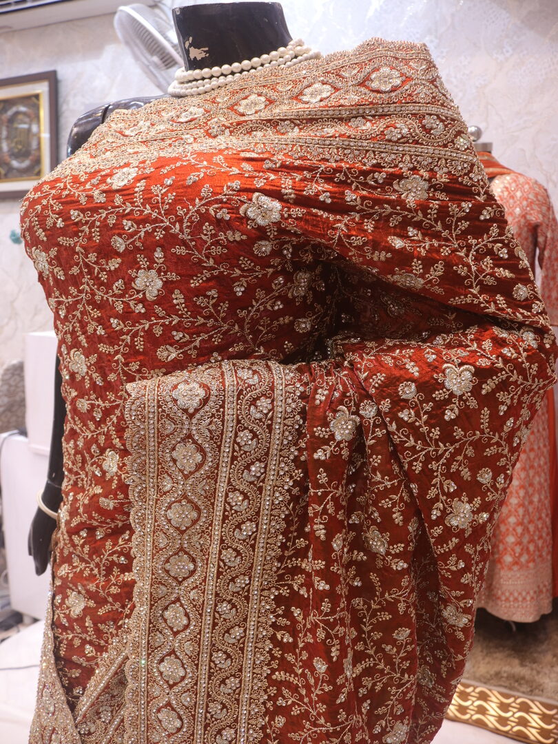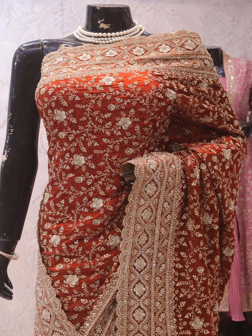 Saree Details: Saree Length: 5.5 Meters Work Type: Full Work (Jaal) Fabric: Fendi Color: Rusty Orange Embellished with: Zari, Crystals Border Color: Rusty Orange Border Fabric: Fendi Border Work: Zari, Crystals Blouse Details: Unstitched Blouse Fabric 0.8 Meters Fabric: Fendi Color: Rusty Orange Embellished with: Zari, Crystals