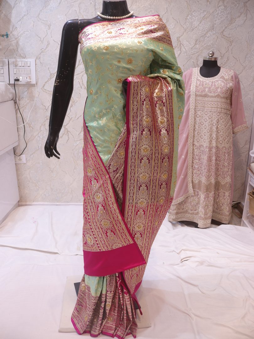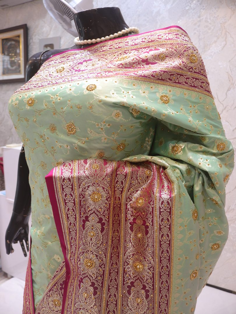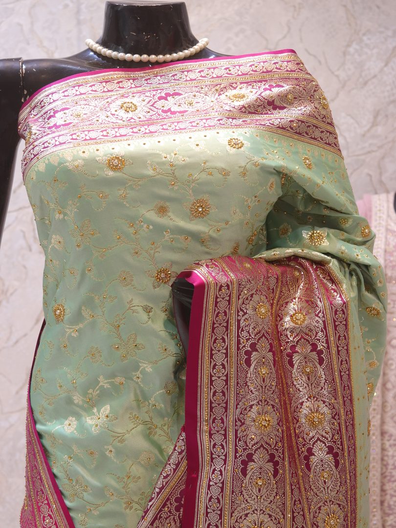 Saree Details: Saree Length: 5.5 Meters Work Type: Weaving (Jaal) Fabric: Banarasi Silk Saree Color: Sea Green Duet Embellished with: Golden Zari, Acrylic Stones Border Color: Pink Fabric: Banarasi Silk Border Work: Golden Zari, Acrylic Stones Blouse Details: Unstitched Blouse Fabric 0.8 Meters Work Type: Weaving Fabric: Banarasi Silk Color: Pink Embellished with: Golden Zari, Acrylic Stones
