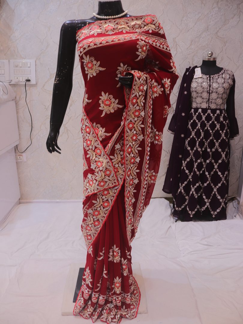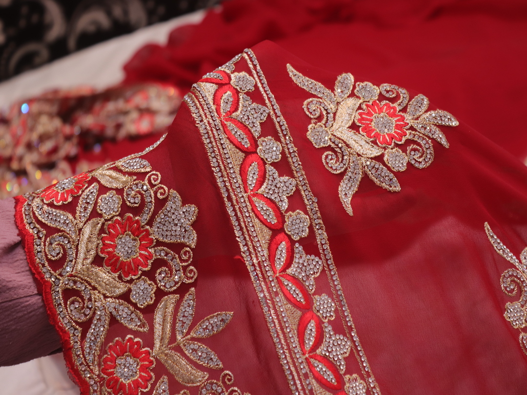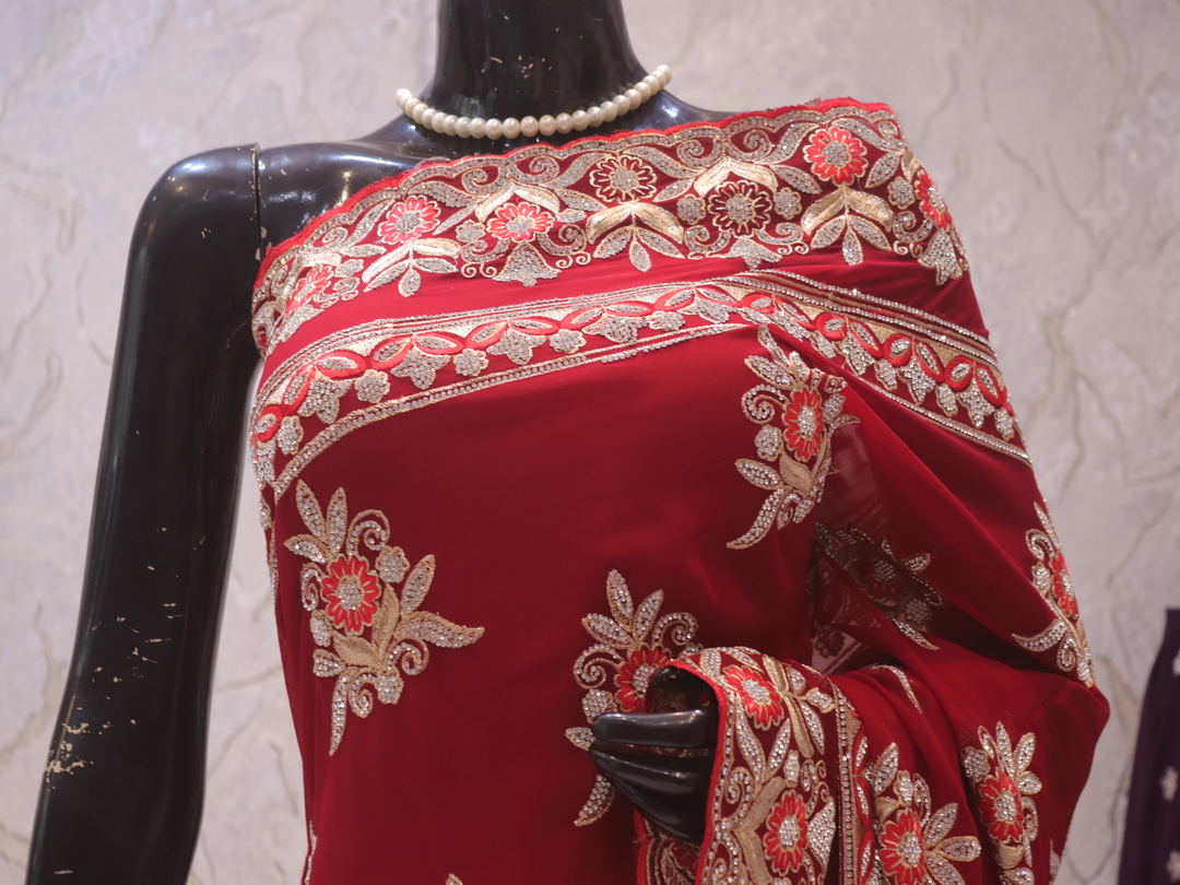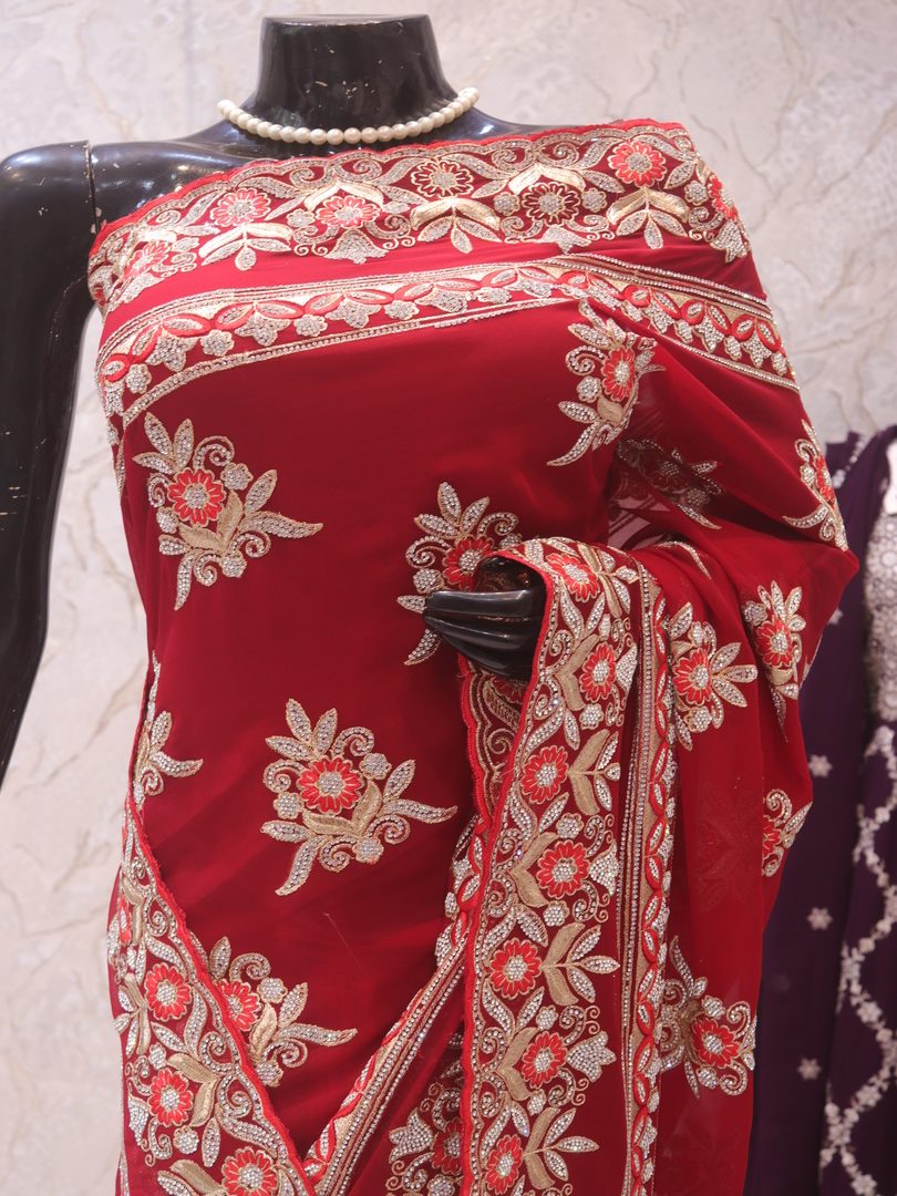 Saree Details: Saree Length: 5.5 Meters Work Type: Full Work (Jaal) Fabric: Georgette Color: Stunning Red Embellished with: Zari, Crystals, Resham Embroidery Border Color: Stunning Red Border Fabric: Georgette Border Work: Zari, Crystals, Resham Embroidery Blouse Details: Unstitched Blouse Fabric 0.8 Meters Fabric: Georgette Color: Stunning Red Embellished with: Zari, Crystals, Resham Embroidery