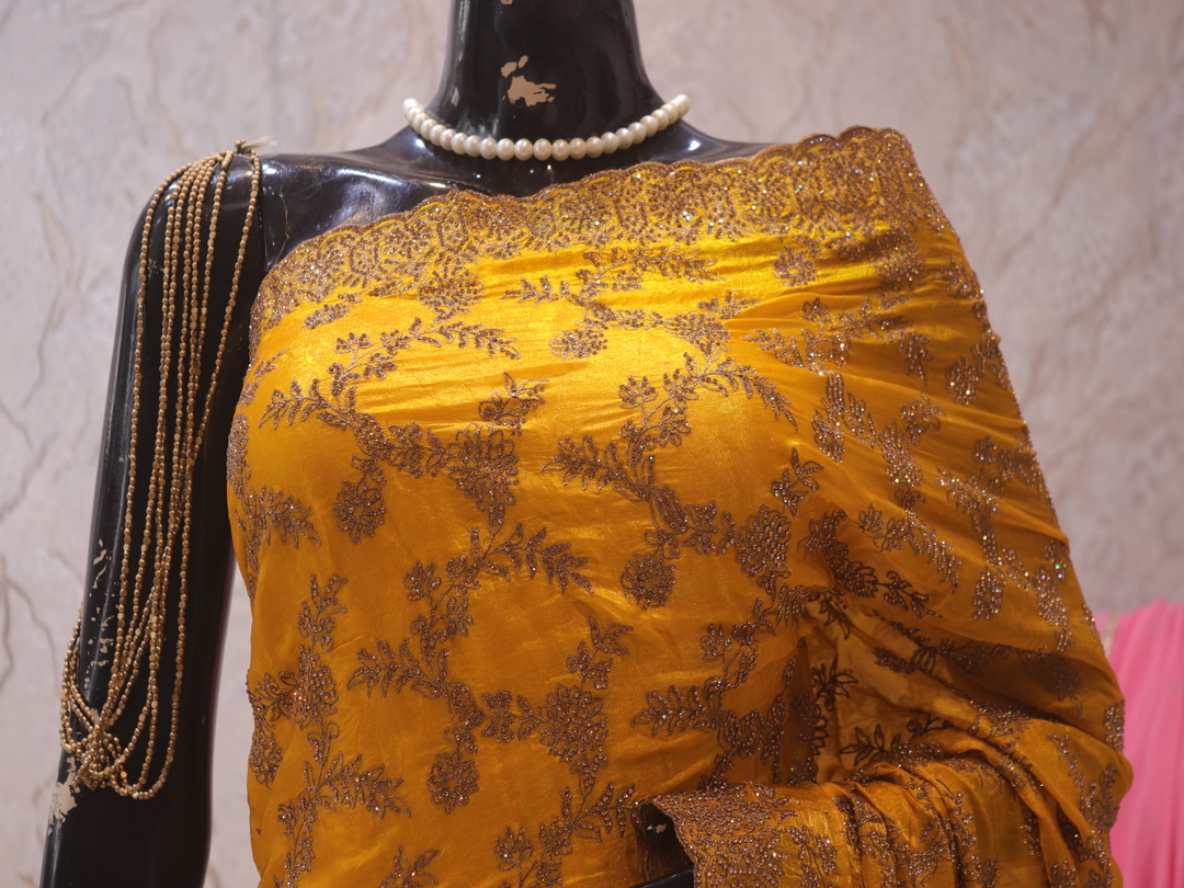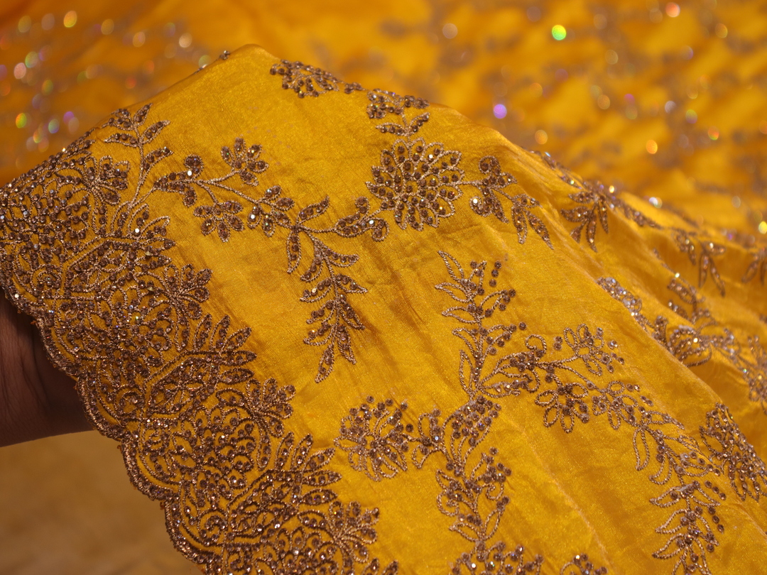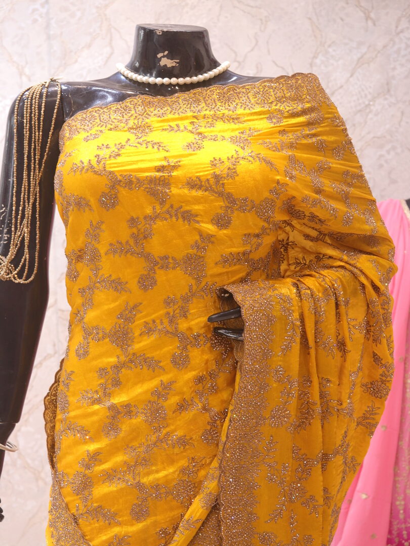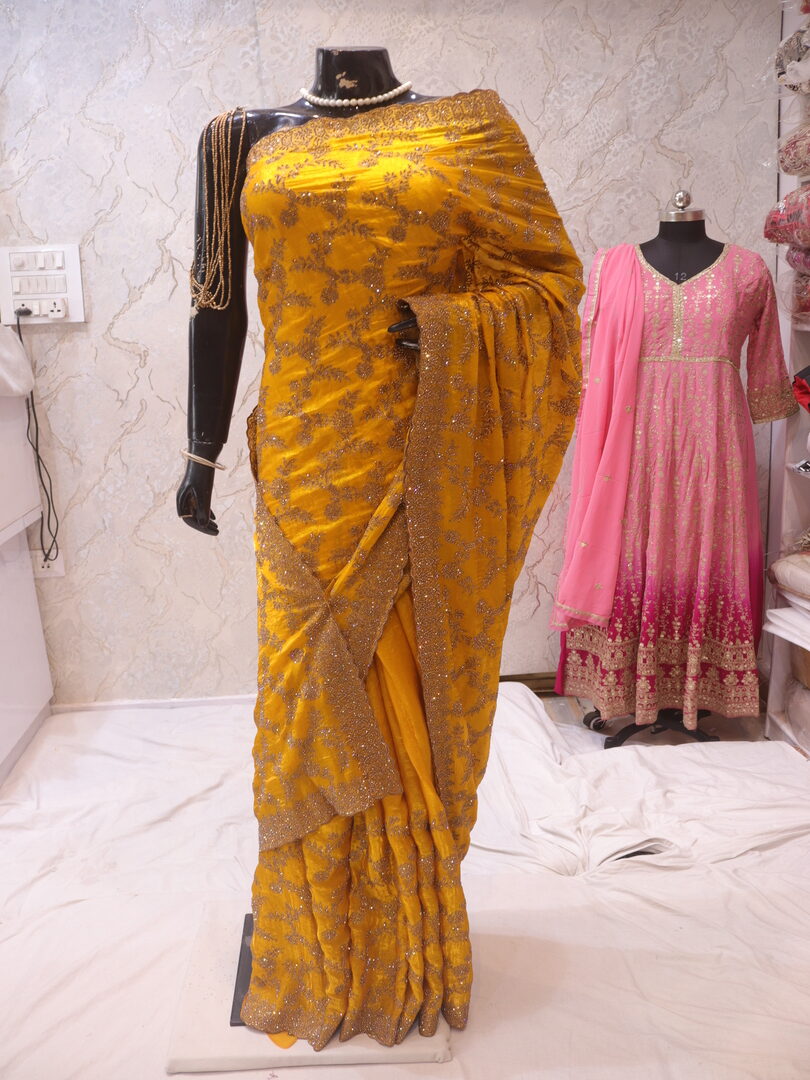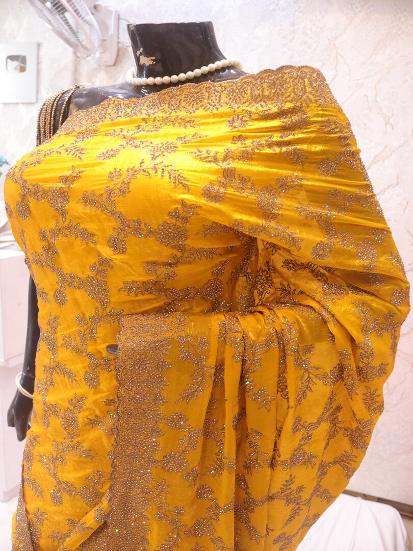 Saree Details: Saree Length: 5.5 Meters Work Type: Full Work (Jaal) Fabric: Fendi Color: Sunflower Yellow Embellished with: Zari, Crystals Border Color: Sunflower Yellow Border Fabric: Fendi Border Work: Zari, Crystals Blouse Details: Unstitched Blouse Fabric 0.8 Meters Fabric: Fendi Color: Sunflower Yellow Embellished with: Zari, Crystals