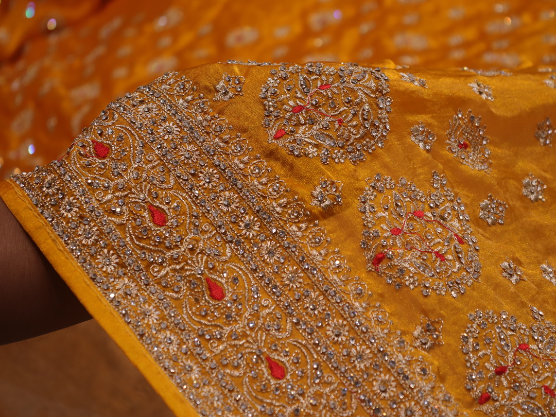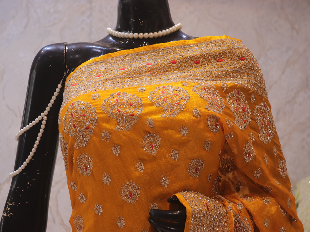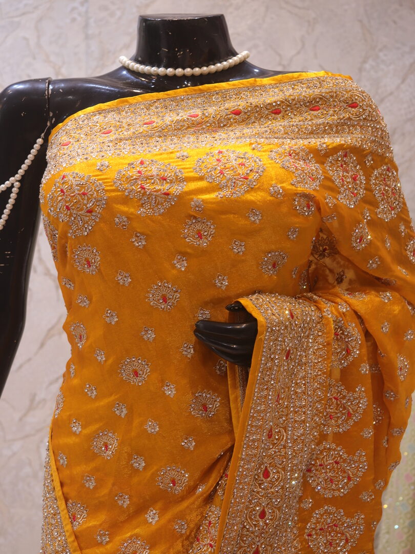 Saree Details: Saree Length: 5.5 Meters Work Type: Full Work (Jaal) Fabric: Fendi Color: Sunflower Yellow Embellished with: Zari, Crystals, Resham Border Color: Sunflower Yellow Border Fabric: Fendi Border Work: Zari, Crystals, Resham Blouse Details: Unstitched Blouse Fabric 0.8 Meters Fabric: Fendi Color: Sunflower Yellow Embellished with: Zari, Crystals, Resham