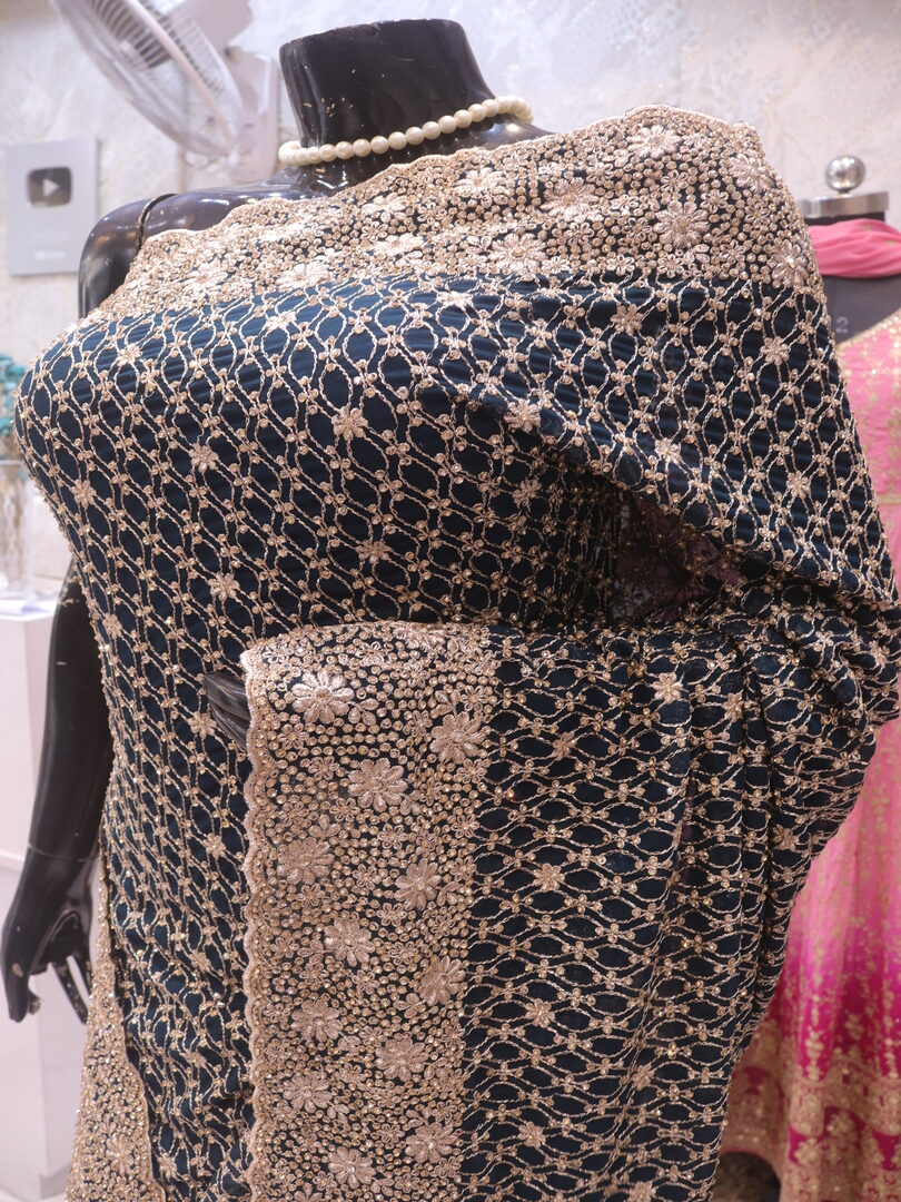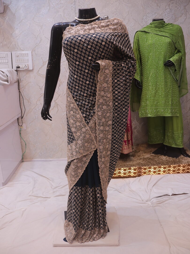 Saree Details: Saree Length: 5.5 Meters Work Type: Full Work (Jaal) Fabric: Georgette Color: Teal Blue Embellished with: Zari, Crystals Border Color: Teal Blue Border Fabric: Georgette Border Work: Zari, Crystals Blouse Details: Unstitched Blouse Fabric 0.8 Meters Fabric: Georgette Color: Teal Blue Embellished with: Zari, Crystals