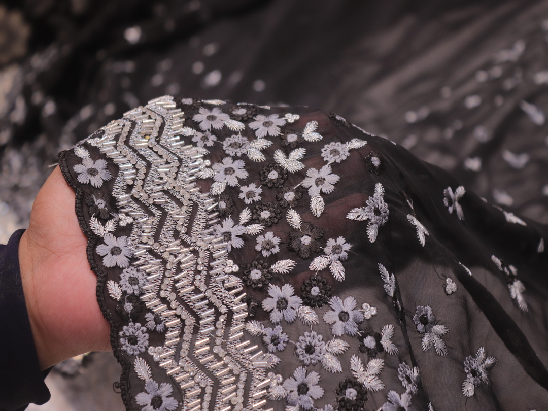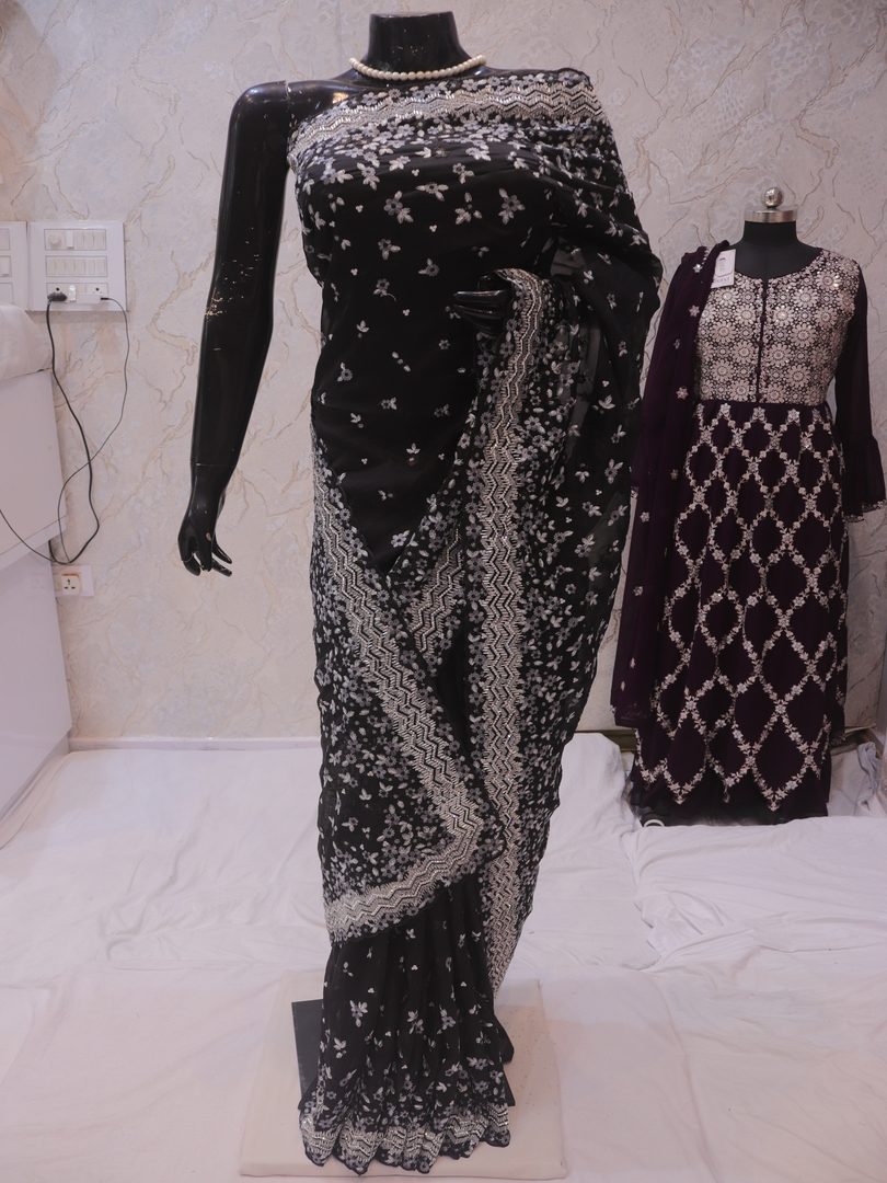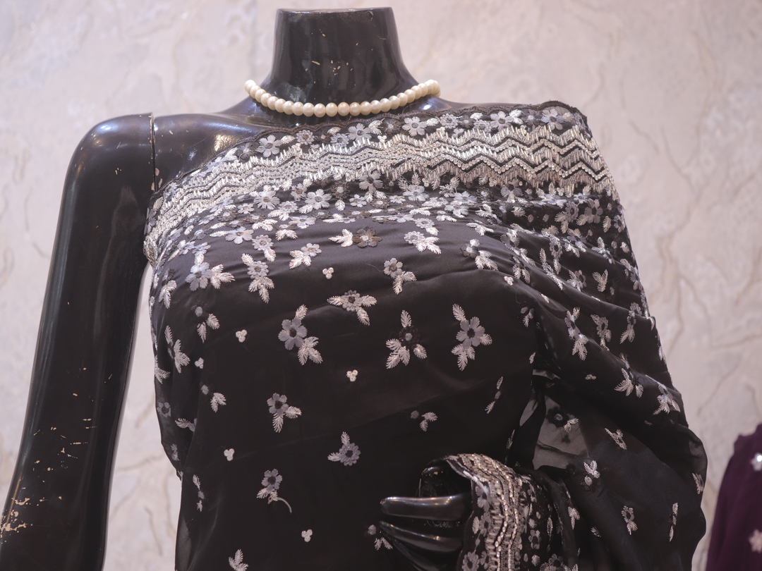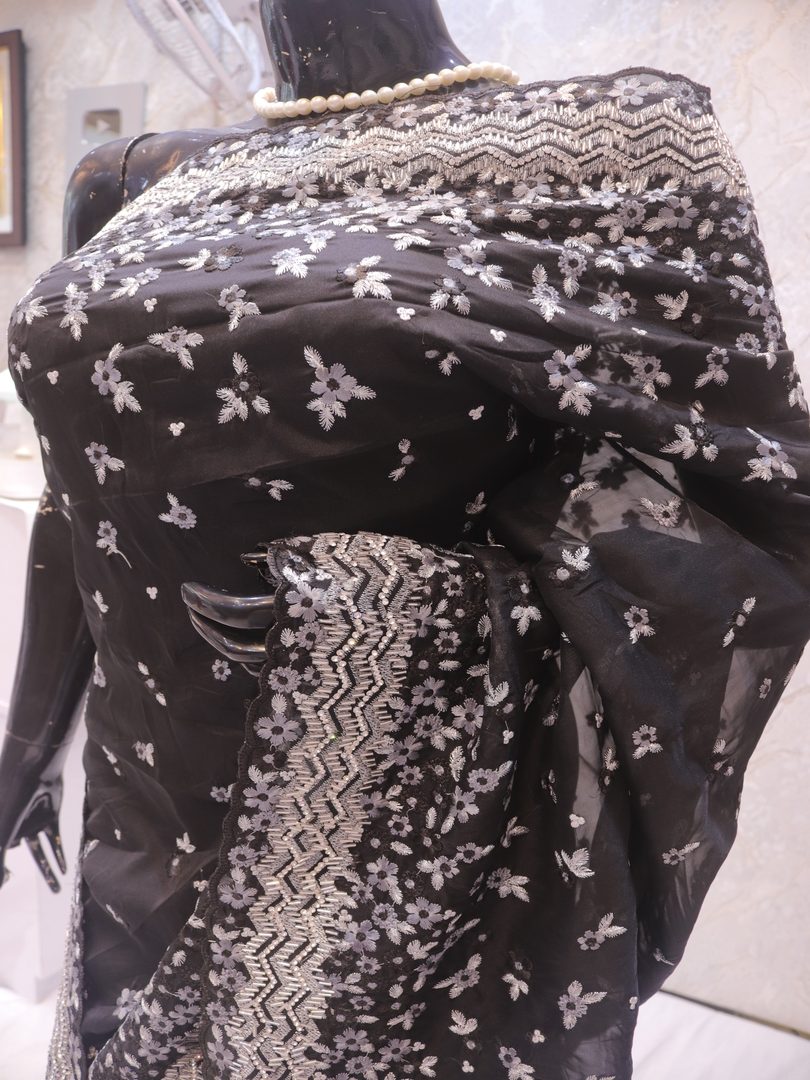 Saree Details: Saree Length: 5.5 Meters Work Type: Full Work (Jaal) Fabric: Organza Color: True Black Embellished with: Cut Glass, Crystals, Resham Border Color: True Black Border Fabric: Organza Border Work: Cut Glass, Crystals, Resham Blouse Details: Unstitched Blouse Fabric 0.8 Meters Fabric: Organza Color: True Black Embellished with: Cut Glass, Crystals, Resham