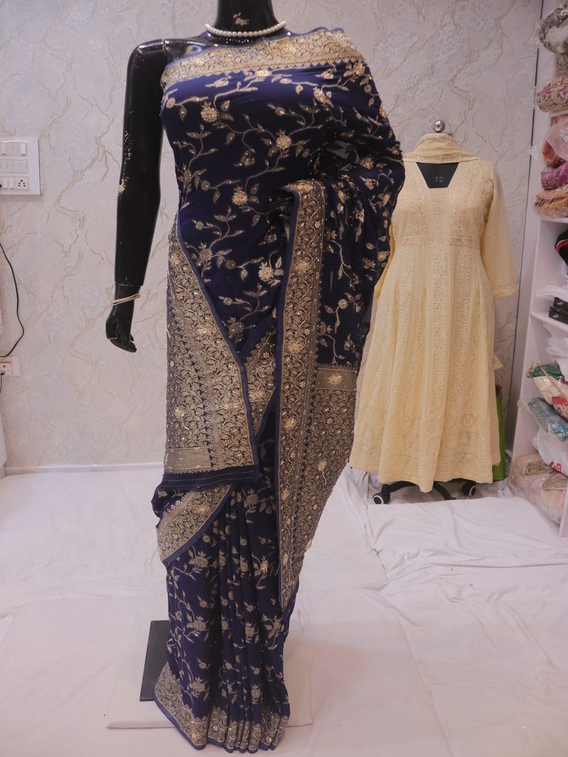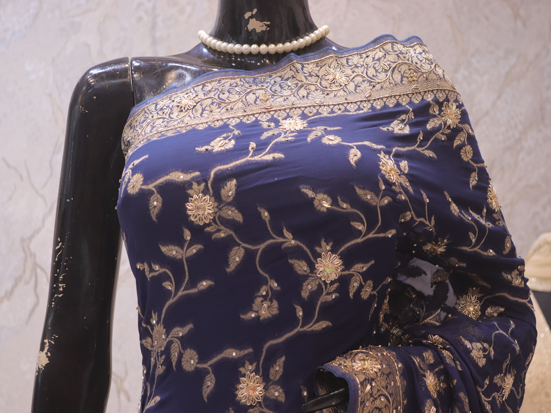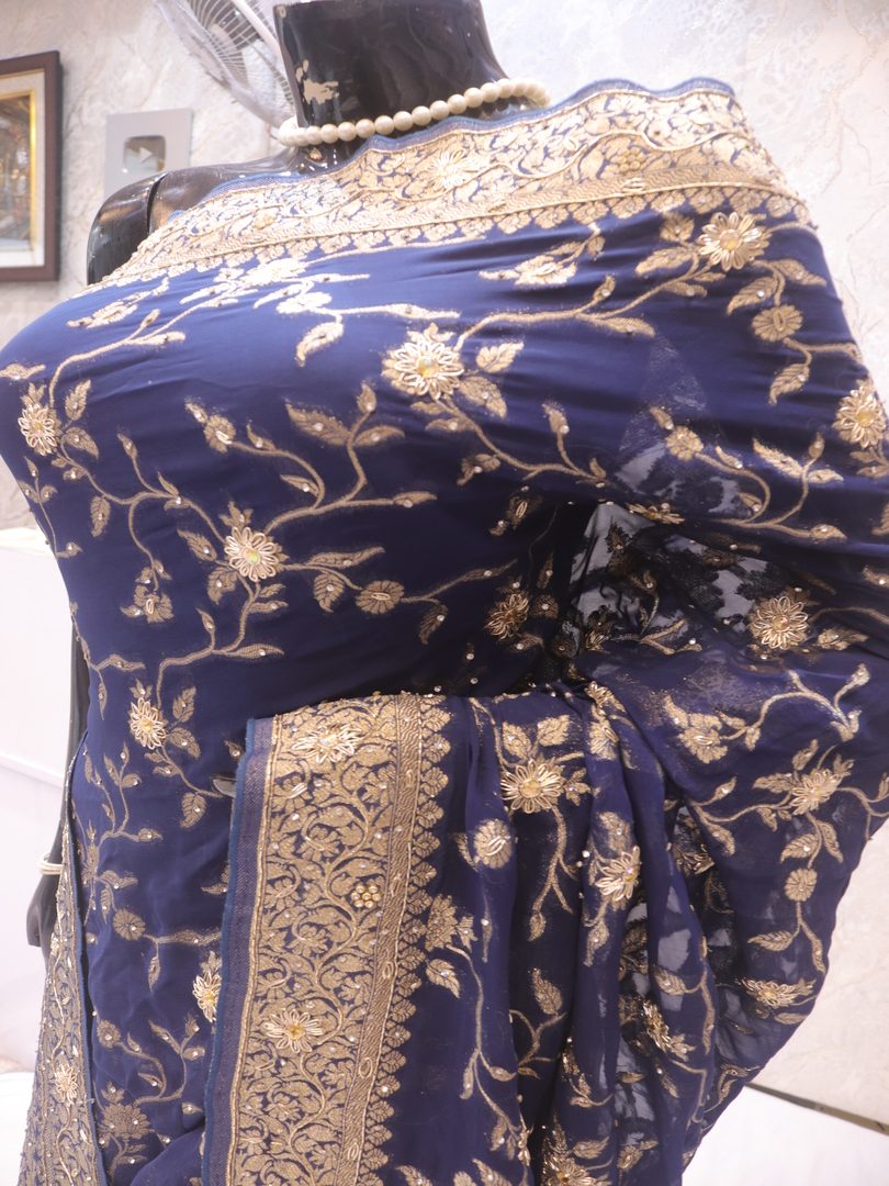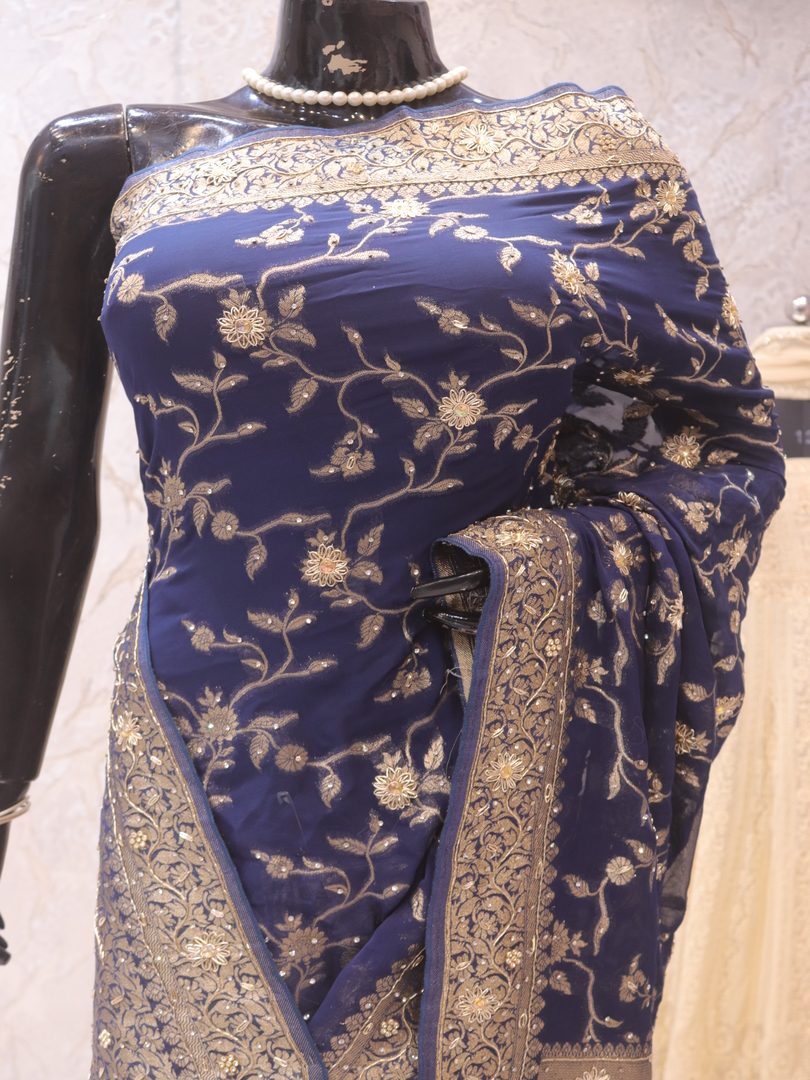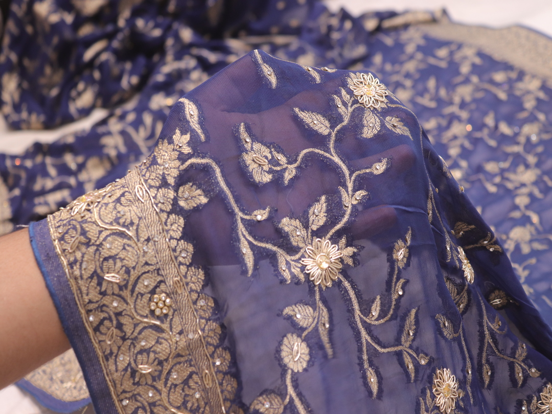Saree Details: Saree Length: 5.5 Meters Work Type: Weaving (Jaal) Fabric: Banarasi Chiffon Silk Color: True Blue Embellished with: Zari, Zardozi, Crystals Border Color: True Blue Fabric: Banarasi Chiffon Border Work: Zari, Zardozi, Crystals Blouse Details: Unstitched Blouse Fabric 0.8 Meters Work Type: Weaving Fabric: Banarasi Chiffon Color: True Blue Embellished with: Zari, Zardozi, Crystals