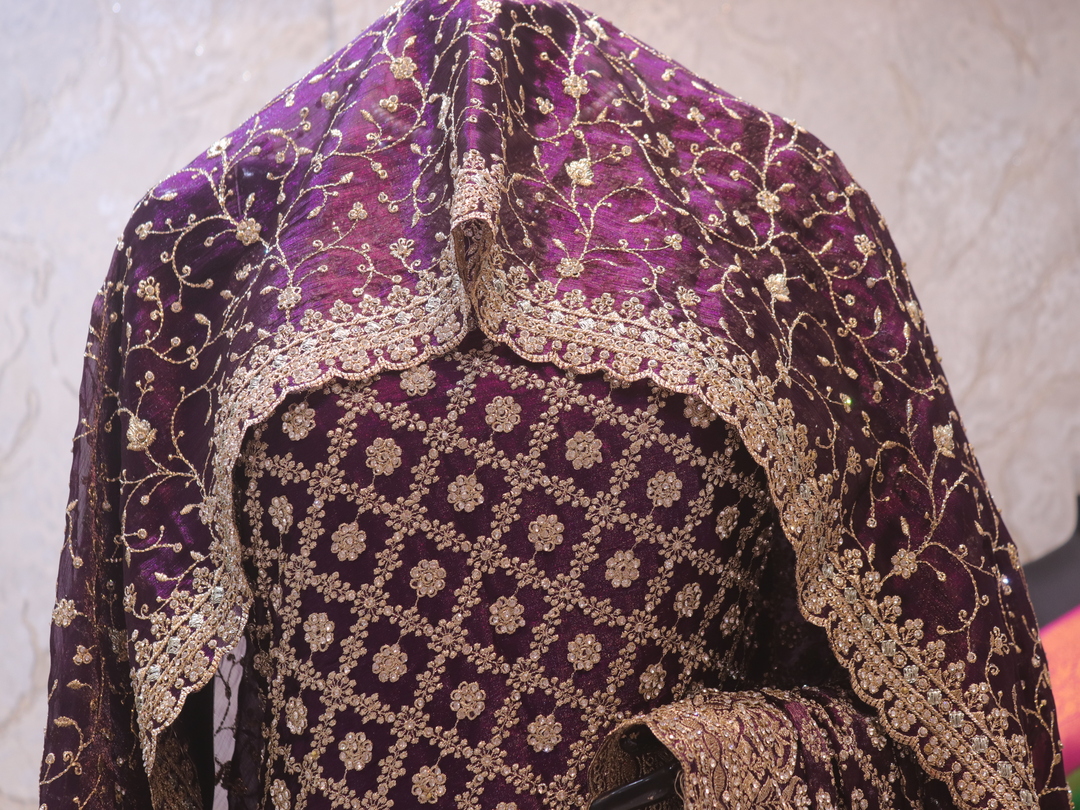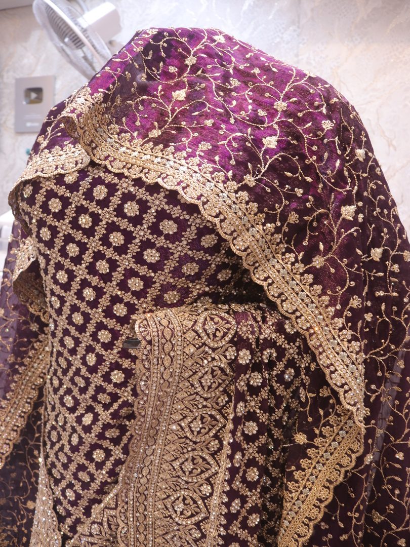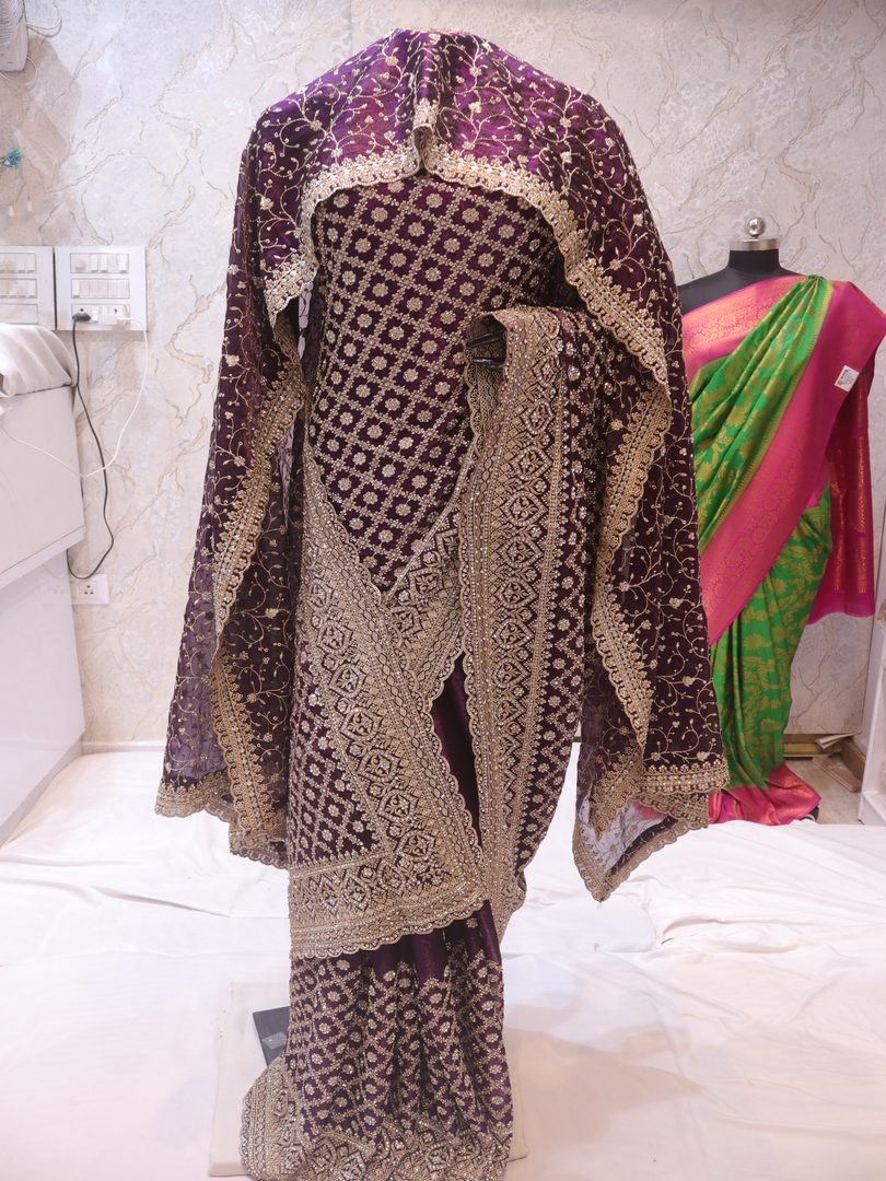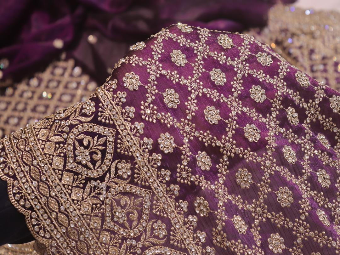 Saree Details: Saree Length: 5.5 Meters Work Type: Full Work (Jaal) Fabric: Barbari Color: True Purple Embellished with: Zari, Crystals Border Color: True Purple Border Fabric: Barbari Border Work: Zari, Crystals Blouse Details: Unstitched Blouse Fabric 0.8 Meters Fabric: Barbari Color: True Purple Embellished with: Zari, Crystals Veil Details: Fabric: Barbari Color: True Purple Embellished with: Zari, Crystals