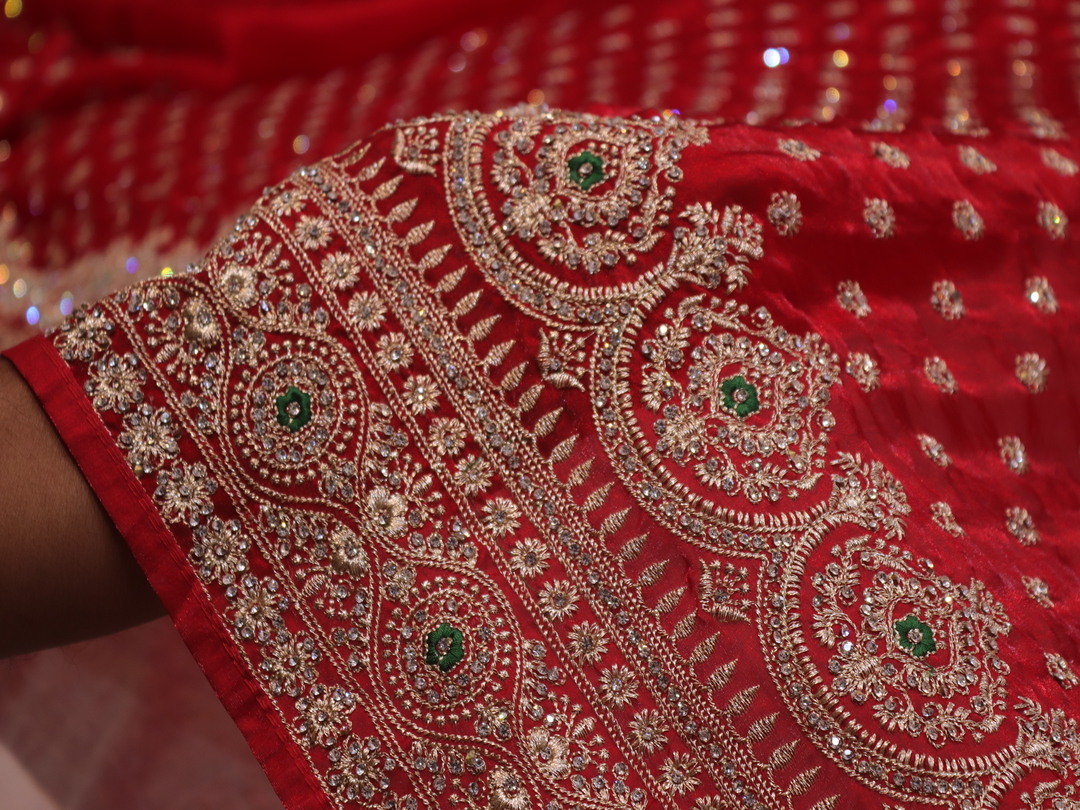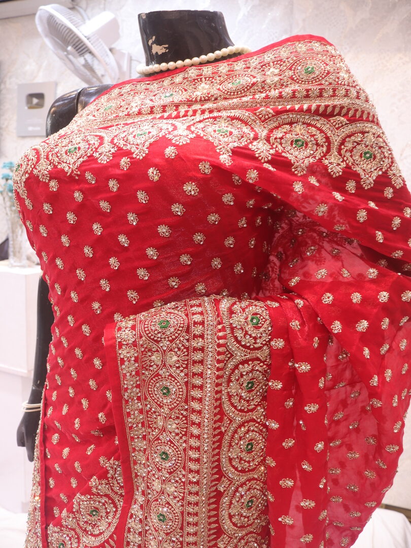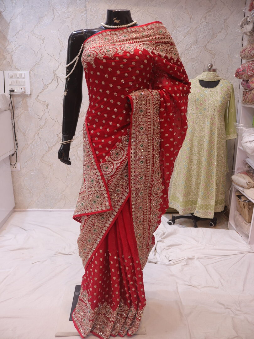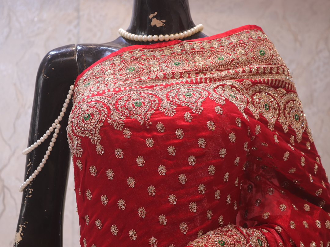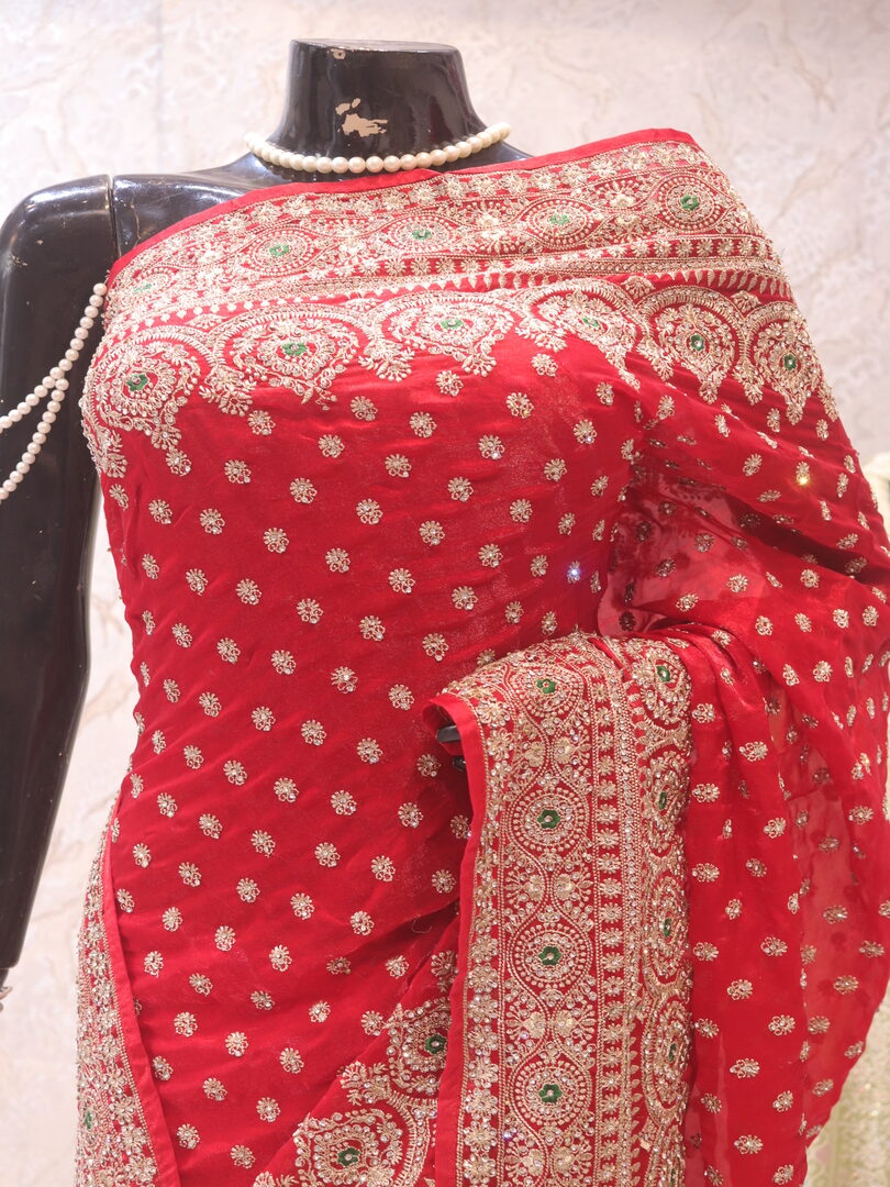 Saree Details: Saree Length: 5.5 Meters Work Type: Full Work (Jaal) Fabric: Fendi Color: True Red Embellished with: Zari, Crystals, Resham Border Color: True Red Border Fabric: Fendi Border Work: Zari, Crystals, Resham Blouse Details: Unstitched Blouse Fabric 0.8 Meters Fabric: Fendi Color: True Red Embellished with: Zari, Crystals, Resham
