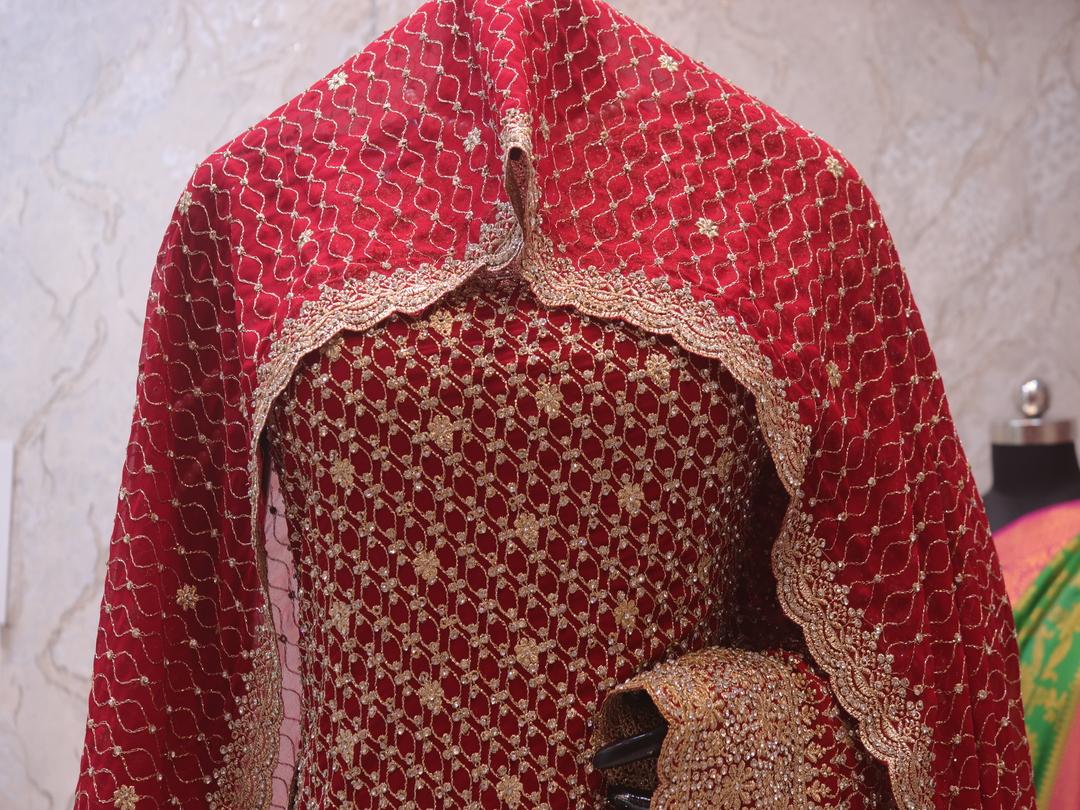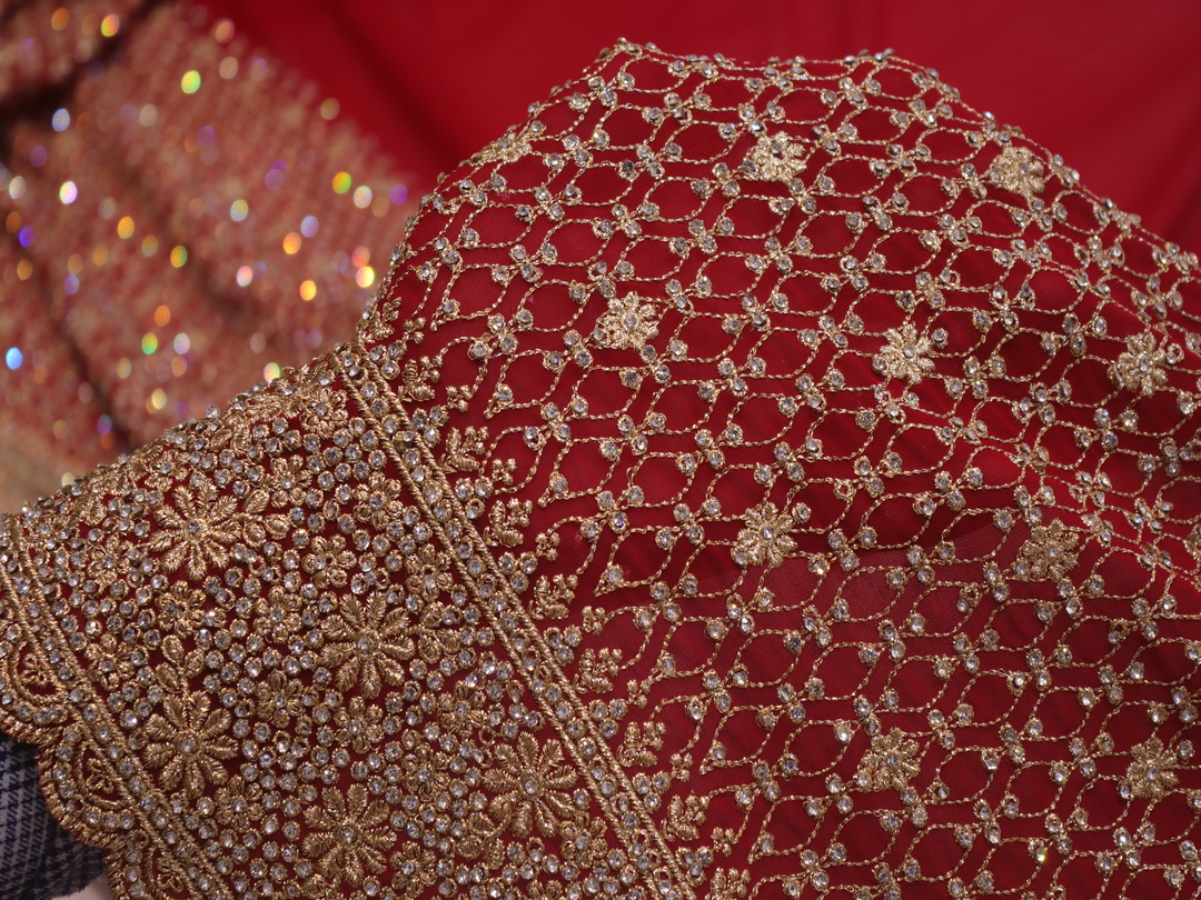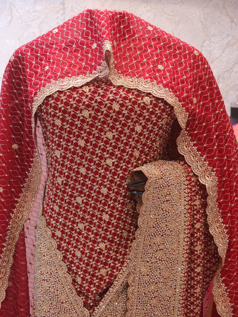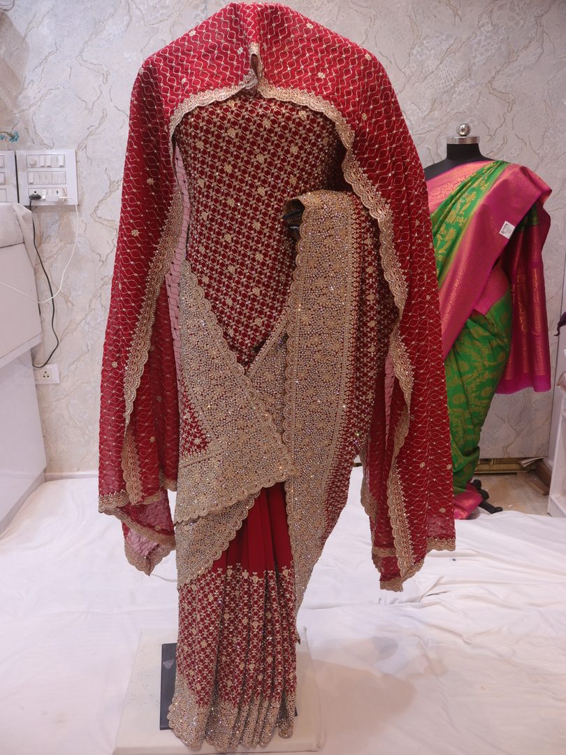 Saree Details: Saree Length: 5.5 Meters Work Type: Full Work (Jaal) Fabric: Georgette Color: Turkish Red Embellished with: Zari, Crystals Border Color: Turkish Red Border Fabric: Georgette Border Work: Zari, Crystals Blouse Details: Unstitched Blouse Fabric 0.8 Meters Fabric: Georgette Color: Turkish Red Embellished with: Zari, Crystals Veil Details: Fabric: Georgette Color: Turkish Red Embellished with: Zari, Crystals